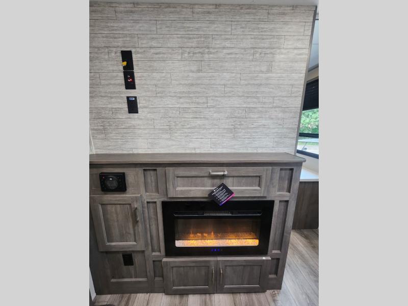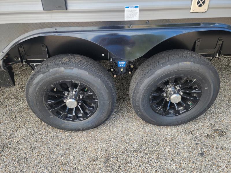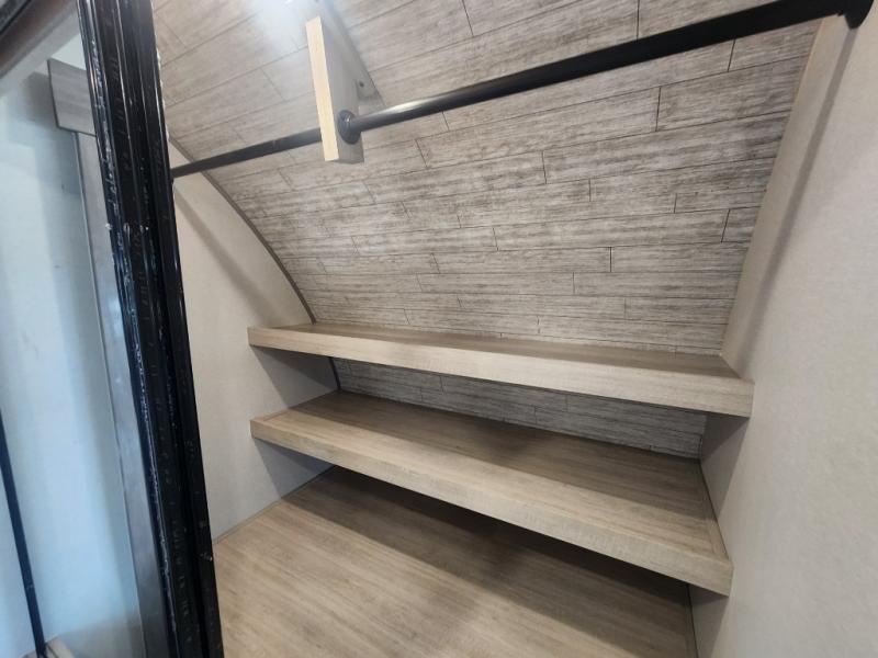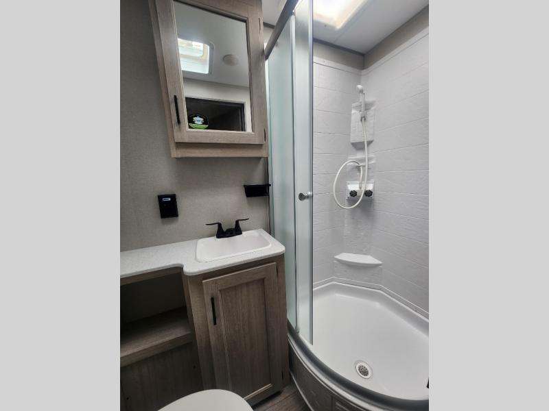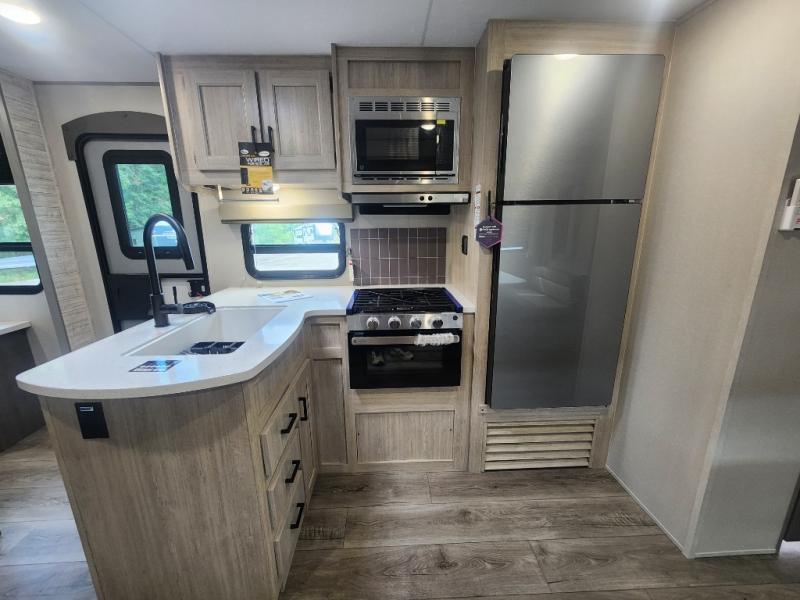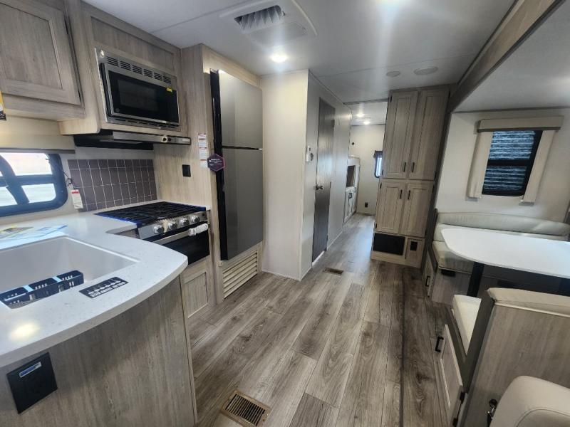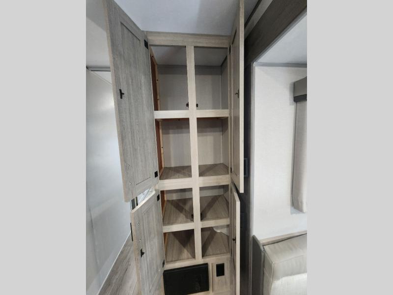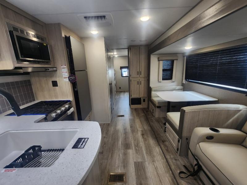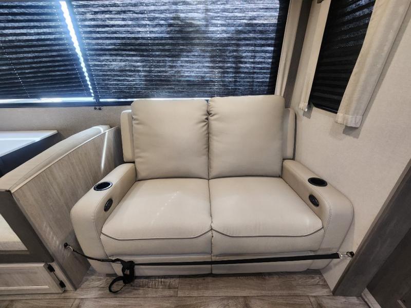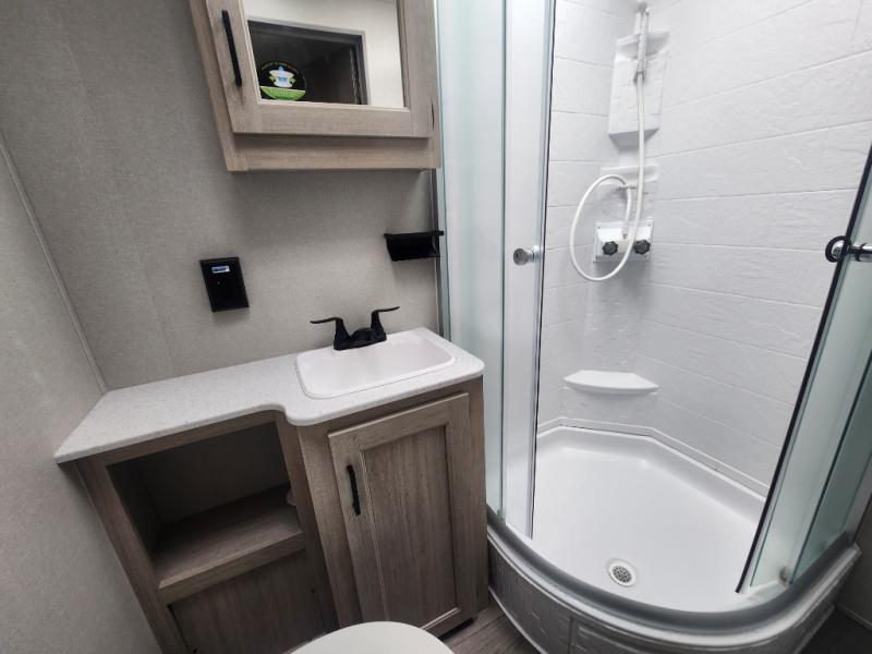 This family-friendly trailer offers lots of floor space thanks to the triple slides throughout! You and your family will love the combined living and kitchen area with a slide out booth dinette and a sofa with drink holders. The L-shaped kitchen counter allows the cook to make meals without moving for anyone trying to get to the full bathroom or the rear bunkhouse. The kids will have their own privacy, two bunk beds, a jack knife sofa with storage totes below plus a TV/wardrobe cabinet. The front private bedroom allows you to sleep like royalty, and offers a large closet for your clothing and another closet prepped for a washer/dryer. And don't forget about the full size camper kitchen and the 21' power awning with multicolor LED lights when you are outside.