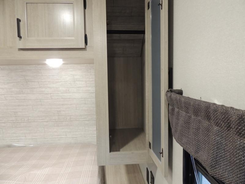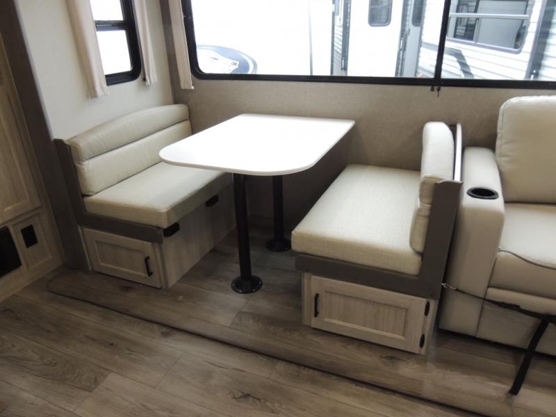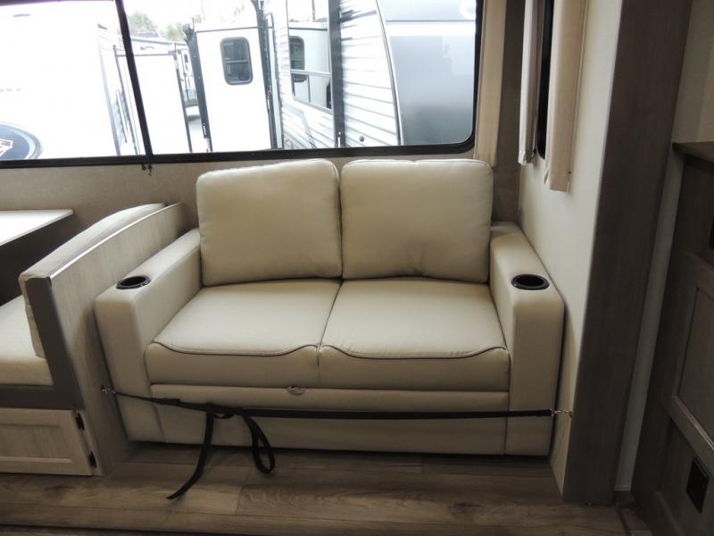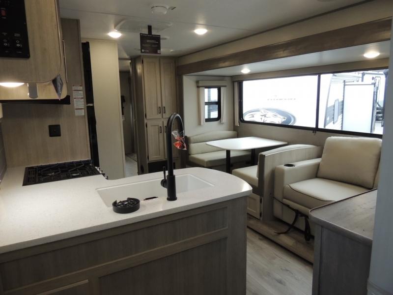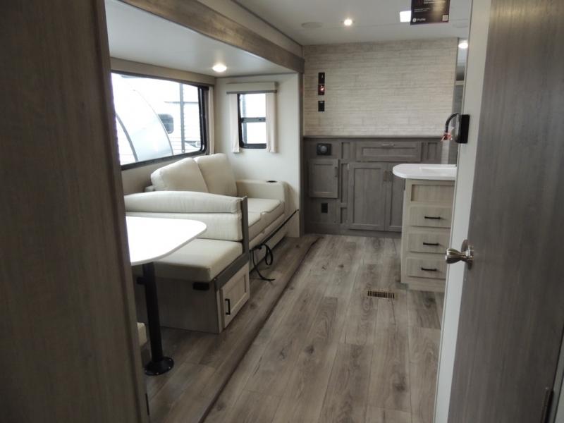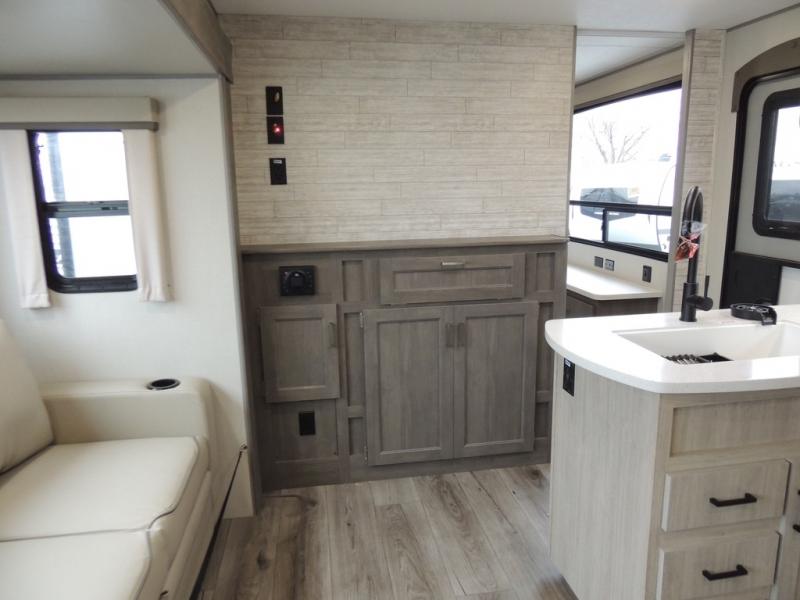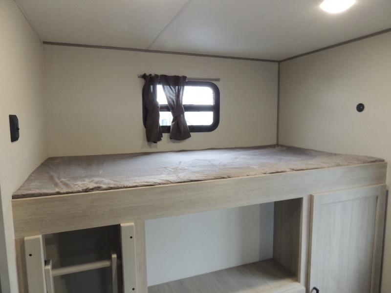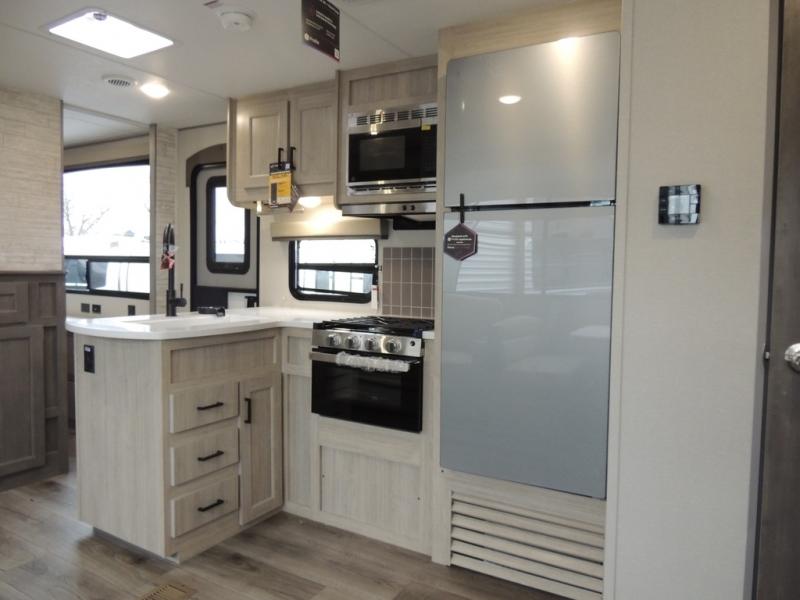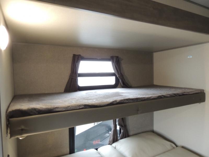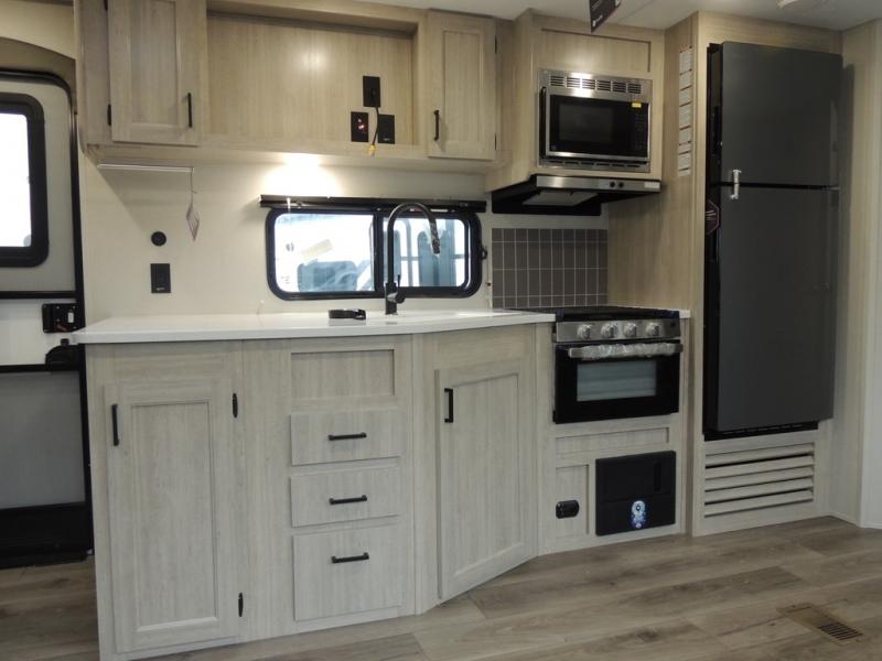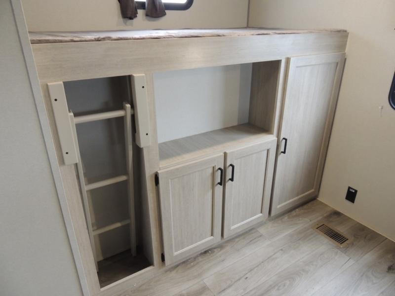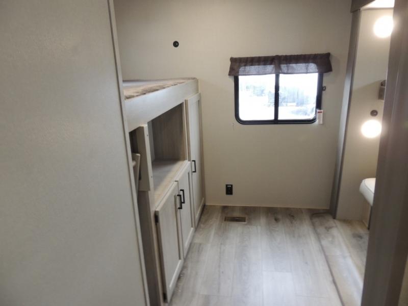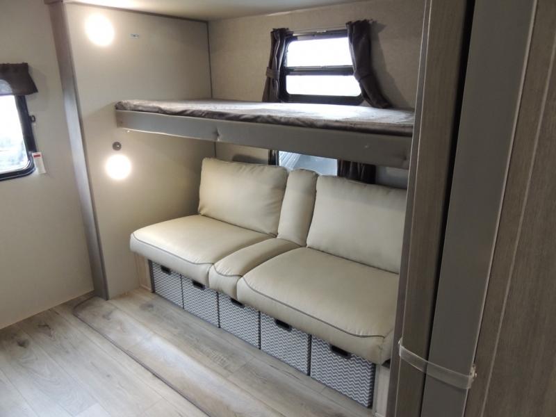 This family-friendly trailer offers lots of floor space thanks to the triple slides throughout! You and your family will love the combined living and kitchen area with a slide out booth dinette and a sofa with drink holders. The L-shaped kitchen counter allows the cook to make meals without moving for anyone trying to get to the full bathroom or the rear bunkhouse. The kids will have their own privacy, two bunk beds, a jack knife sofa with storage totes below plus a TV/wardrobe cabinet. The front private bedroom allows you to sleep like royalty and offers a large closet for your clothing and another closet prepped for a washer/dryer. And don't forget about the full-size camper kitchen and the 21' power awning with multicolor LED lights when you are outside.