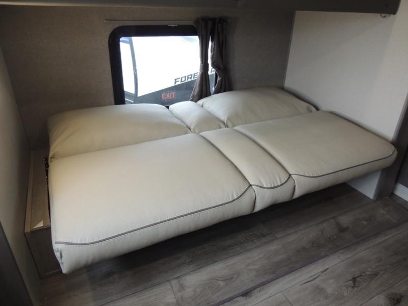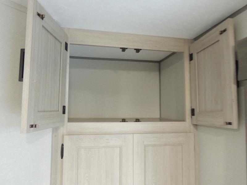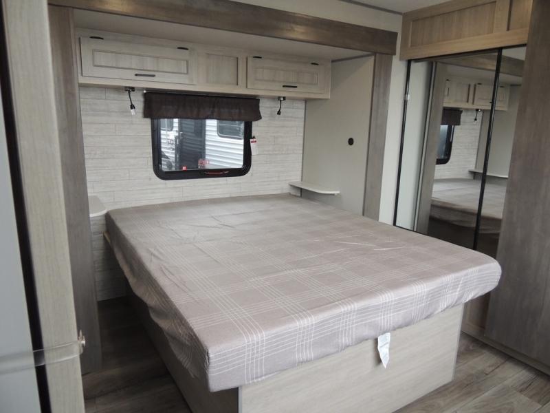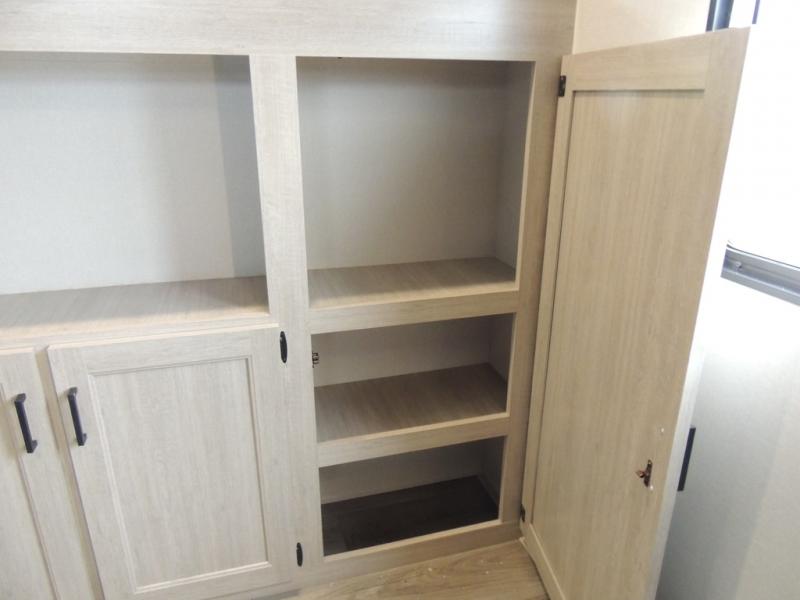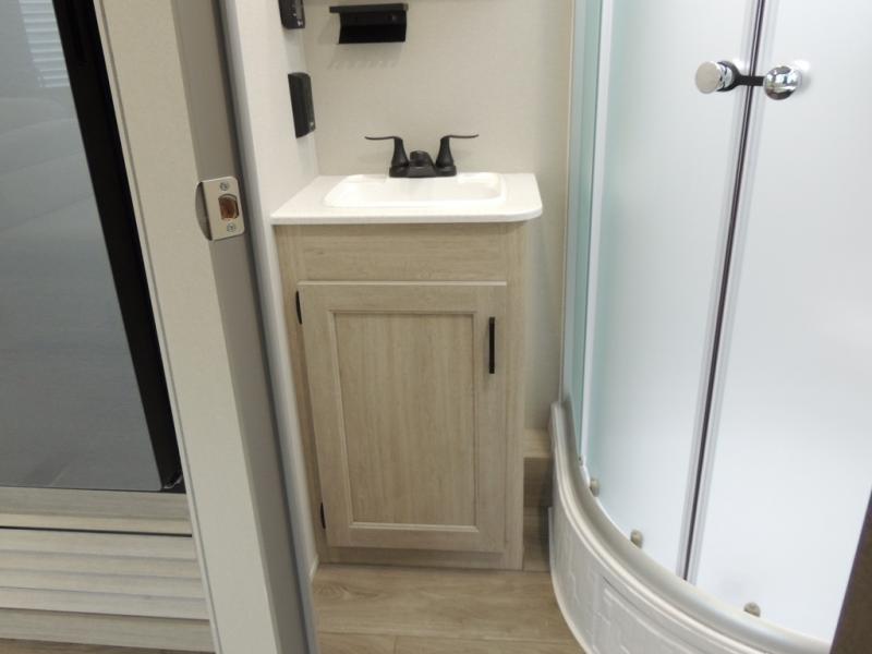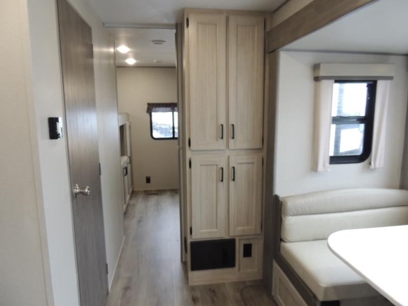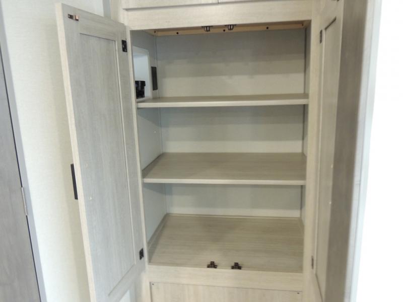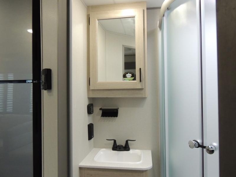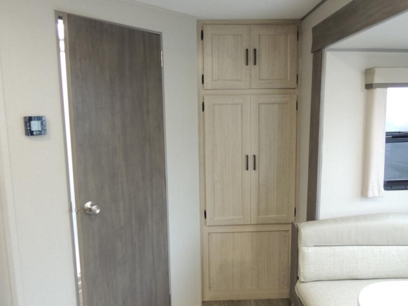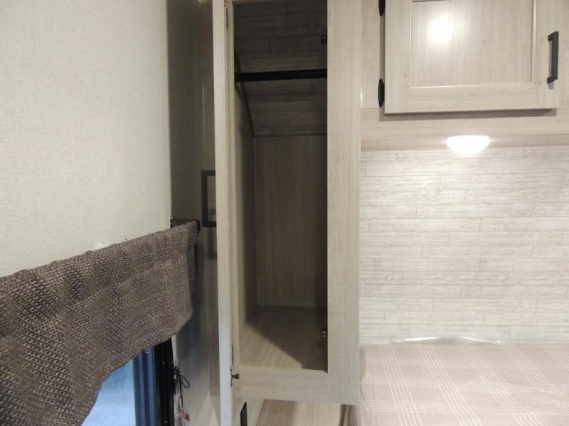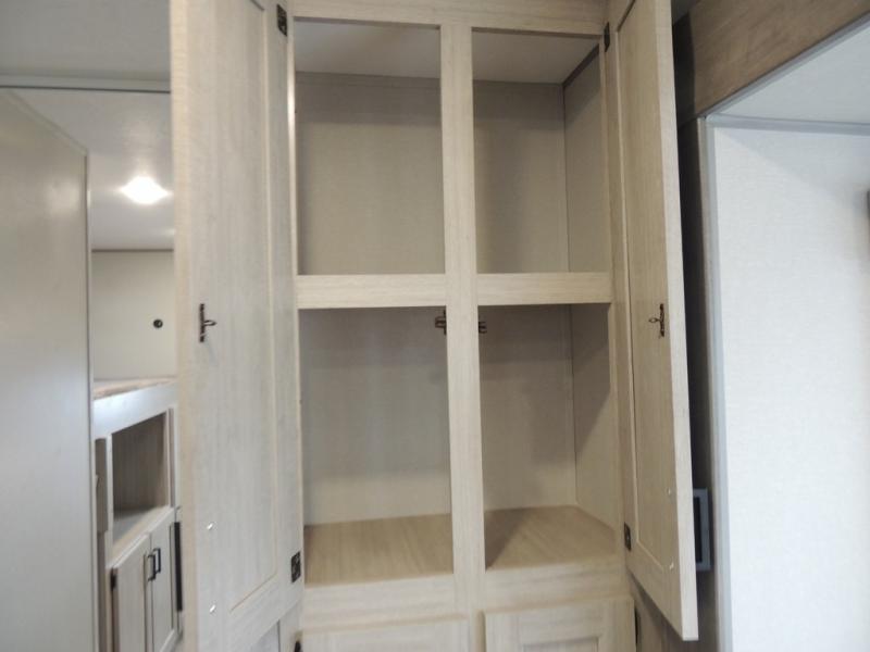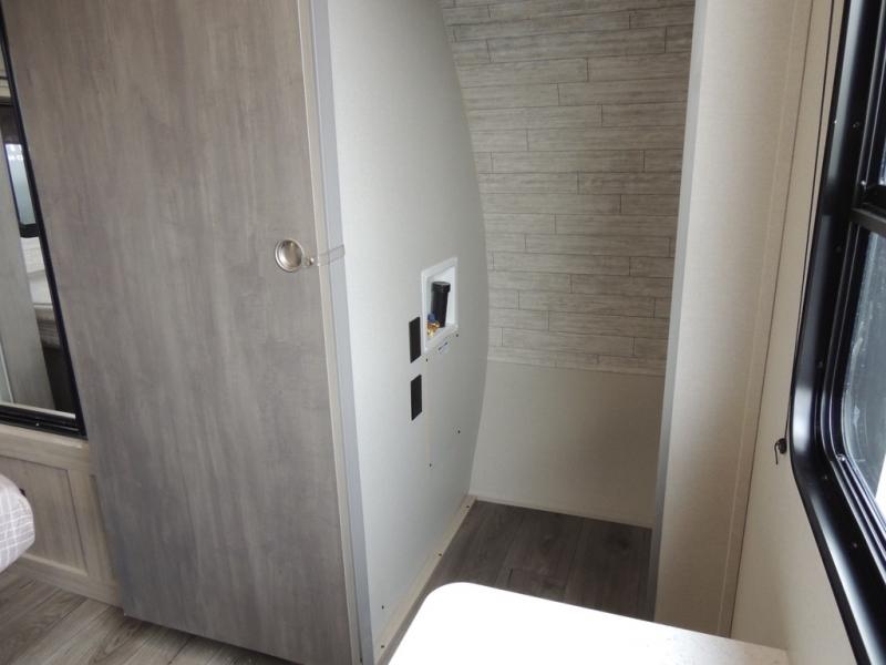 This family-friendly trailer offers lots of floor space thanks to the triple slides throughout! You and your family will love the combined living and kitchen area with a slide out booth dinette and a sofa with drink holders. The L-shaped kitchen counter allows the cook to make meals without moving for anyone trying to get to the full bathroom or the rear bunkhouse. The kids will have their own privacy, two bunk beds, a jack knife sofa with storage totes below plus a TV/wardrobe cabinet. The front private bedroom allows you to sleep like royalty and offers a large closet for your clothing and another closet prepped for a washer/dryer. And don't forget about the full-size camper kitchen and the 21' power awning with multicolor LED lights when you are outside.