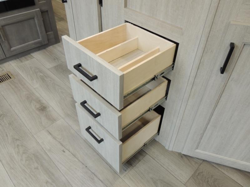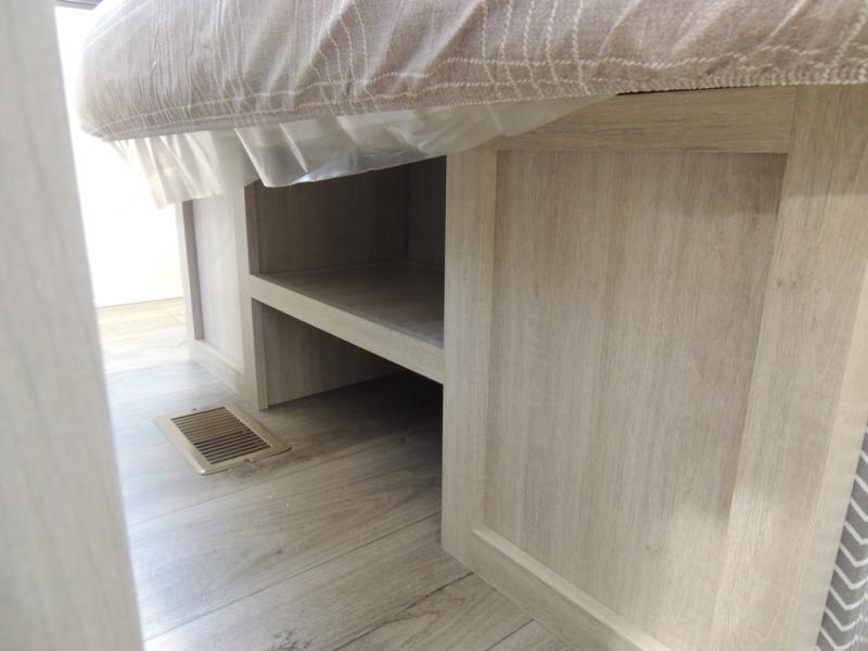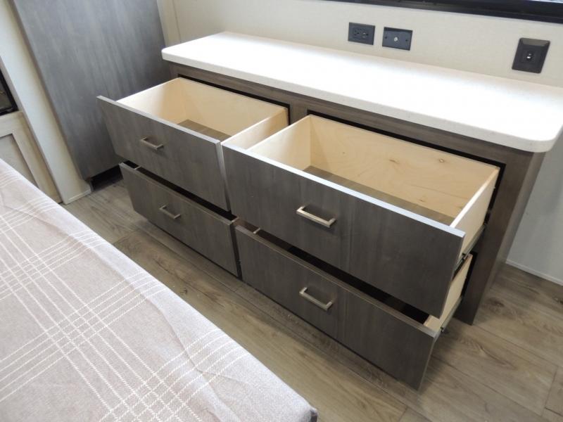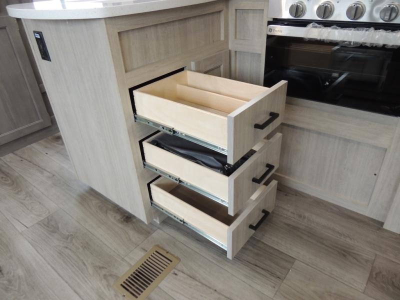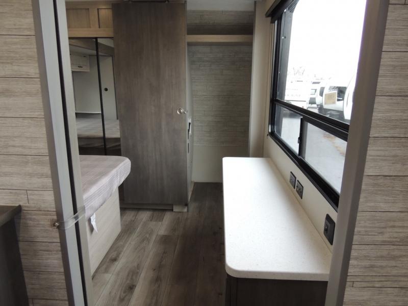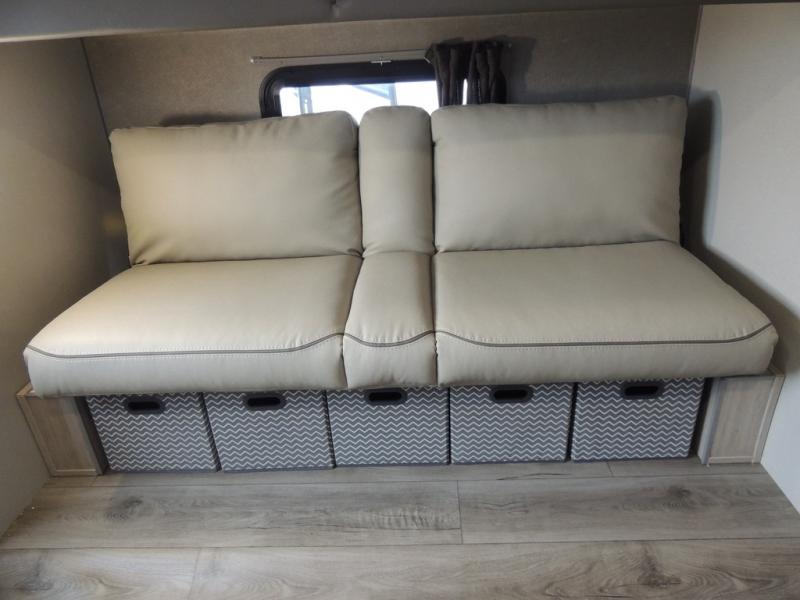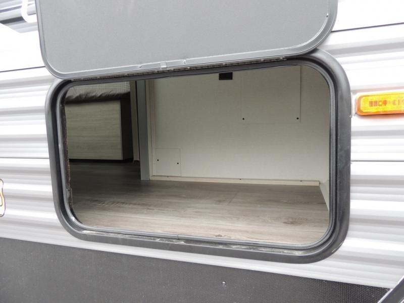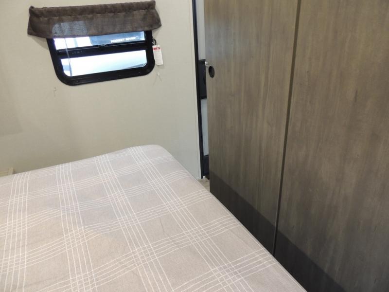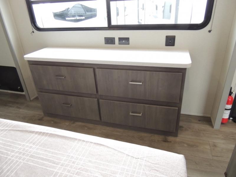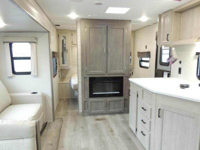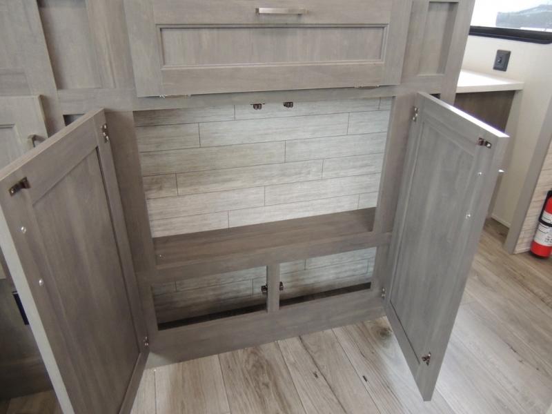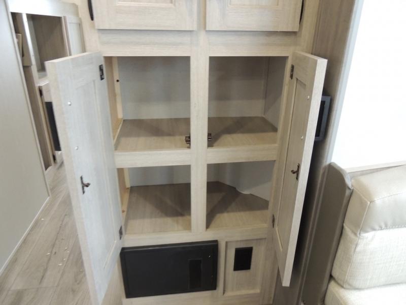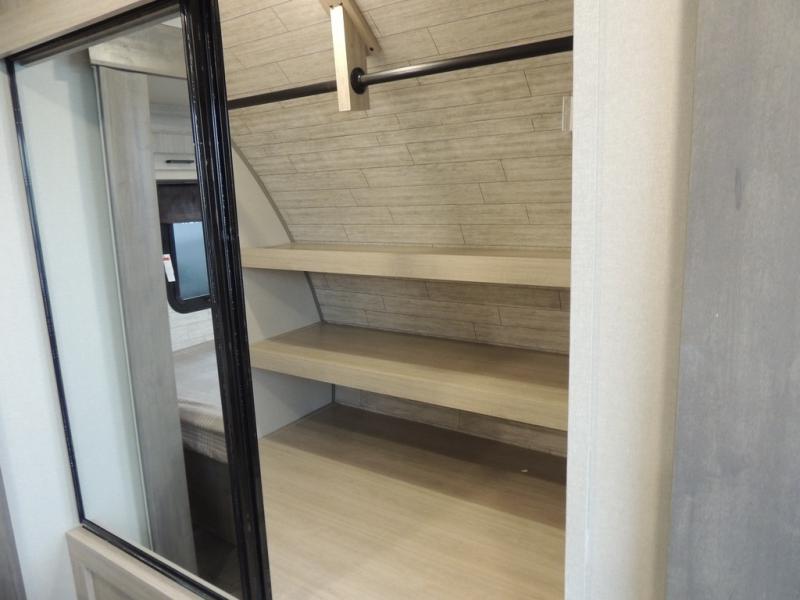 This family-friendly trailer offers lots of floor space thanks to the triple slides throughout! You and your family will love the combined living and kitchen area with a slide out booth dinette and a sofa with drink holders. The L-shaped kitchen counter allows the cook to make meals without moving for anyone trying to get to the full bathroom or the rear bunkhouse. The kids will have their own privacy, two bunk beds, a jack knife sofa with storage totes below plus a TV/wardrobe cabinet. The front private bedroom allows you to sleep like royalty and offers a large closet for your clothing and another closet prepped for a washer/dryer. And don't forget about the full-size camper kitchen and the 21' power awning with multicolor LED lights when you are outside.