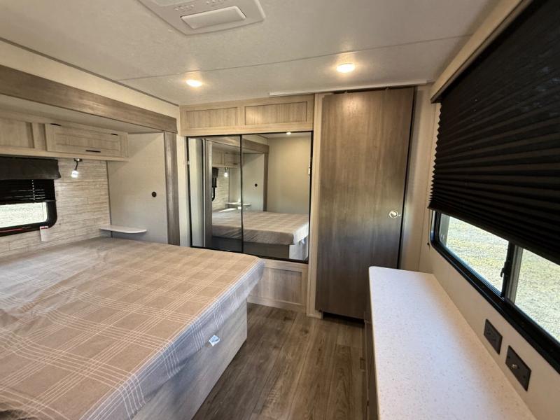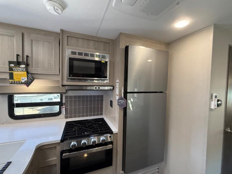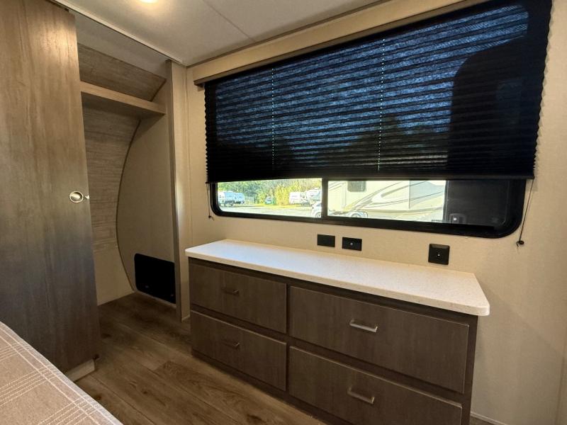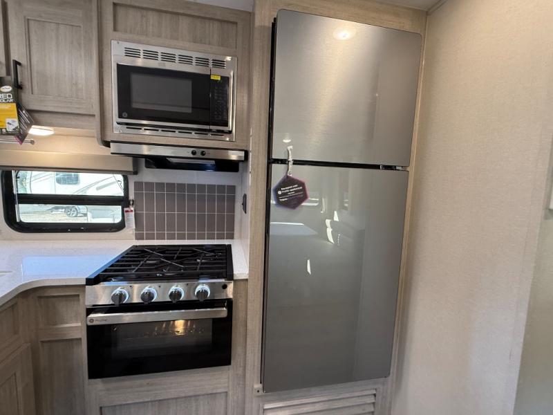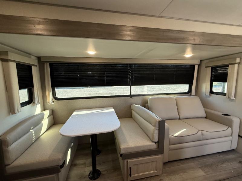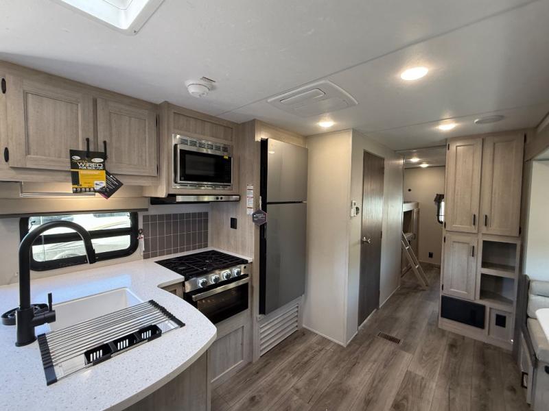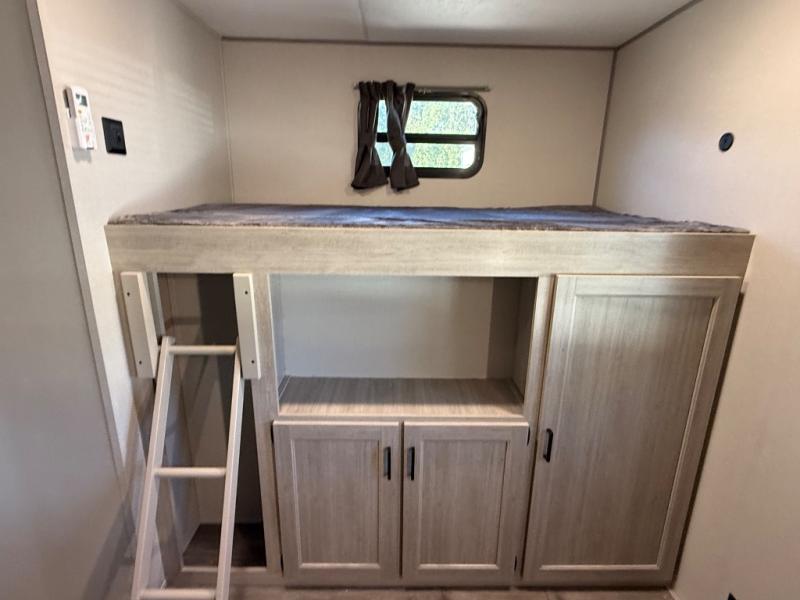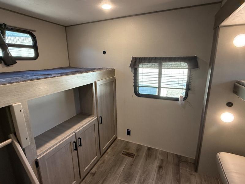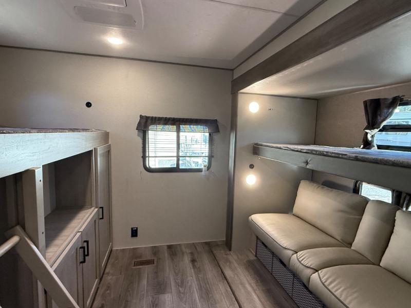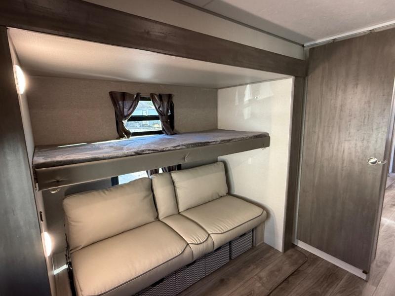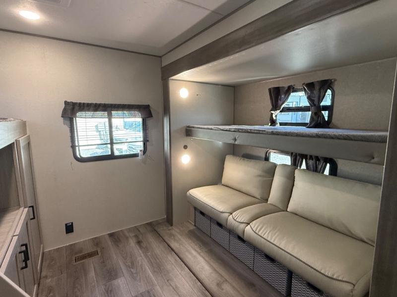 This family-friendly trailer offers lots of floor space thanks to the triple slides throughout! You and your family will love the combined living and kitchen area with a slide out booth dinette and a sofa with drink holders. The L-shaped kitchen counter allows the cook to make meals without moving for anyone trying to get to the full bathroom or the rear bunkhouse. The kids will have their own privacy, two bunk beds, a jack knife sofa with storage totes below plus a TV/wardrobe cabinet. The front private bedroom allows you to sleep like royalty and offers a large closet for your clothing and another closet prepped for a washer/dryer. And don't forget about the full-size camper kitchen and the 21' power awning with multicolor LED lights when you are outside.