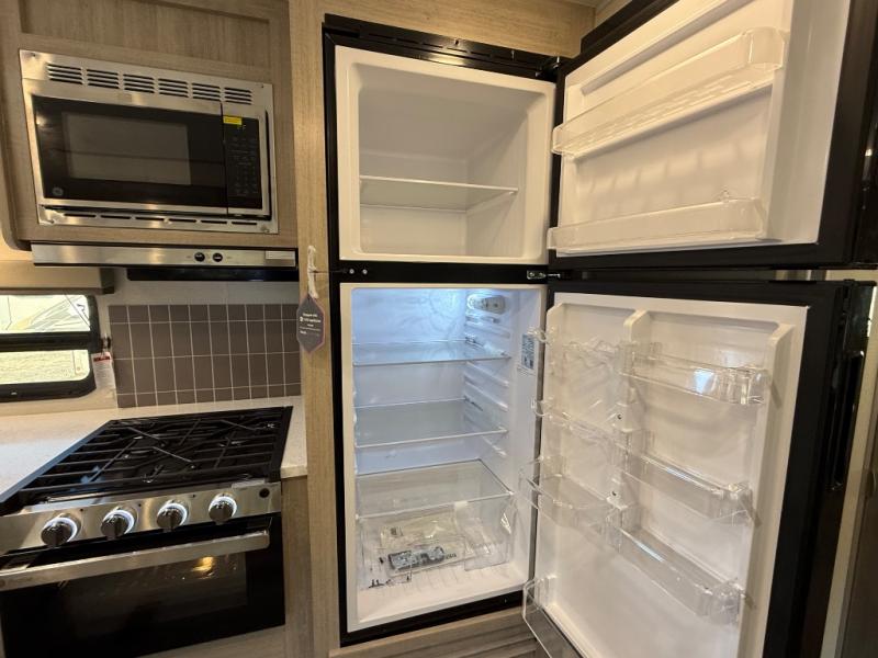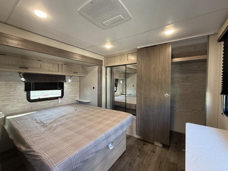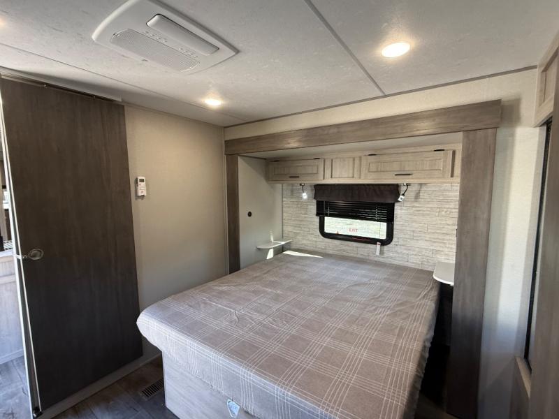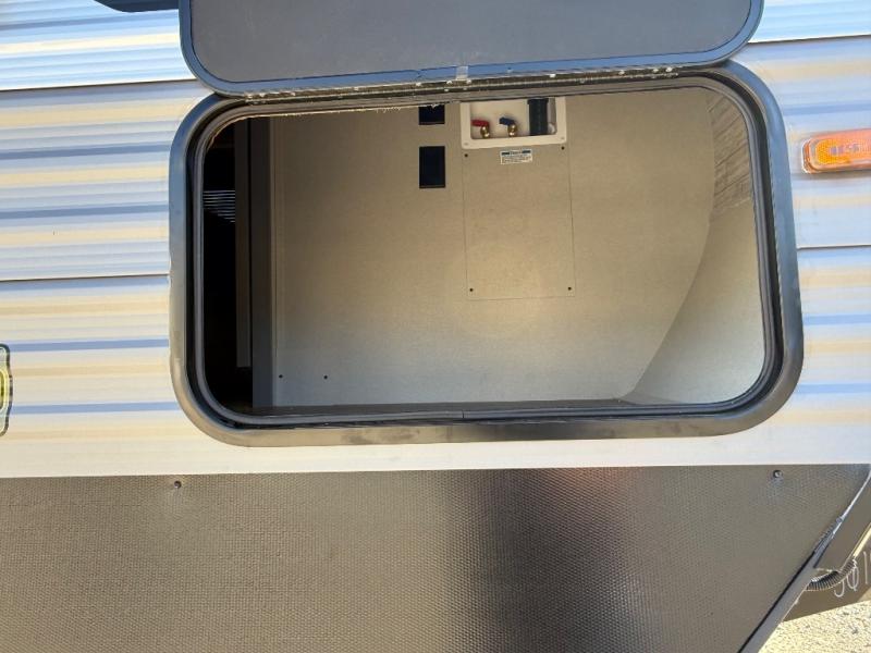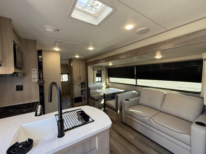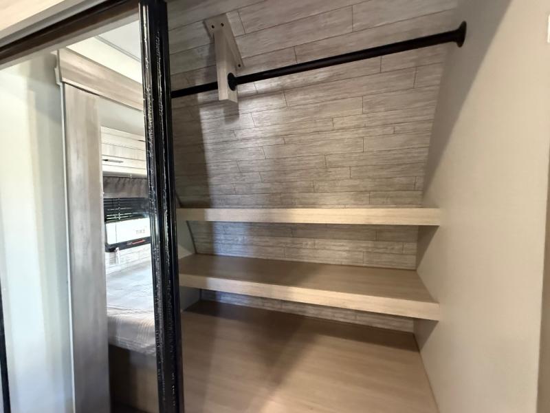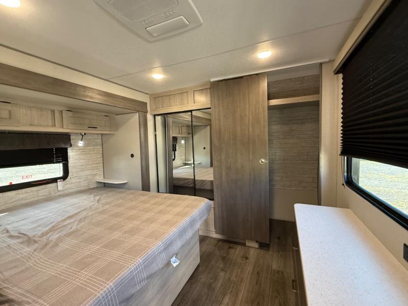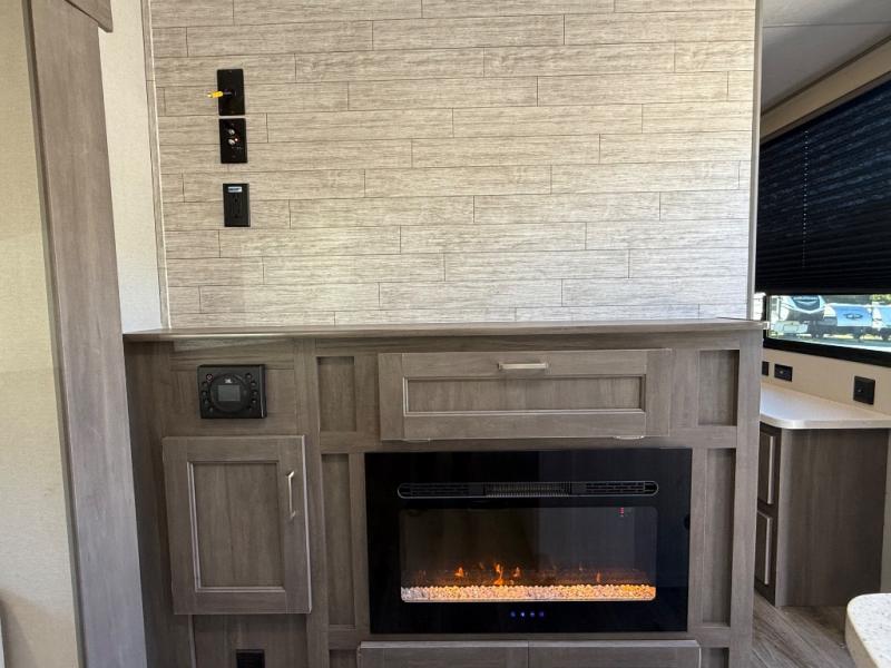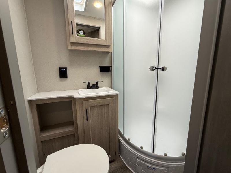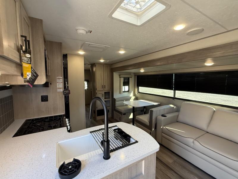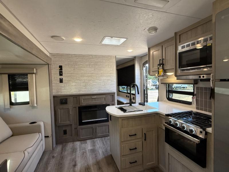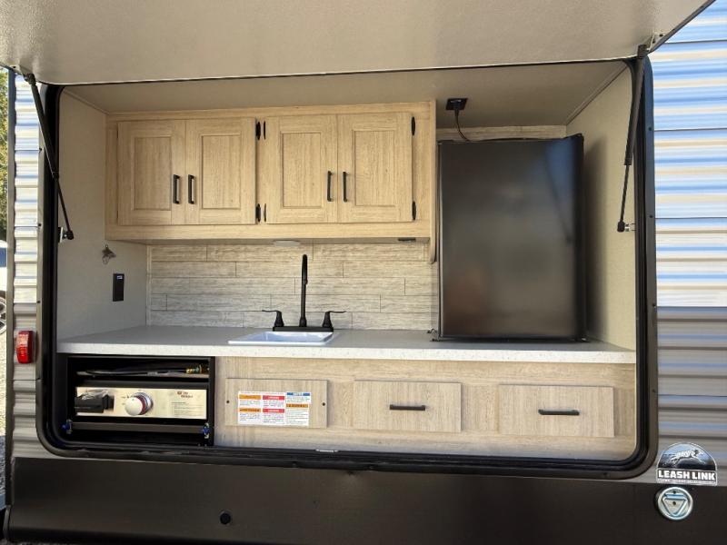 This family-friendly trailer offers lots of floor space thanks to the triple slides throughout! You and your family will love the combined living and kitchen area with a slide out booth dinette and a sofa with drink holders. The L-shaped kitchen counter allows the cook to make meals without moving for anyone trying to get to the full bathroom or the rear bunkhouse. The kids will have their own privacy, two bunk beds, a jack knife sofa with storage totes below plus a TV/wardrobe cabinet. The front private bedroom allows you to sleep like royalty and offers a large closet for your clothing and another closet prepped for a washer/dryer. And don't forget about the full-size camper kitchen and the 21' power awning with multicolor LED lights when you are outside.