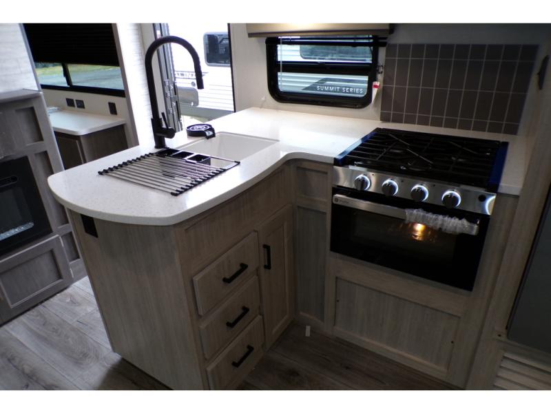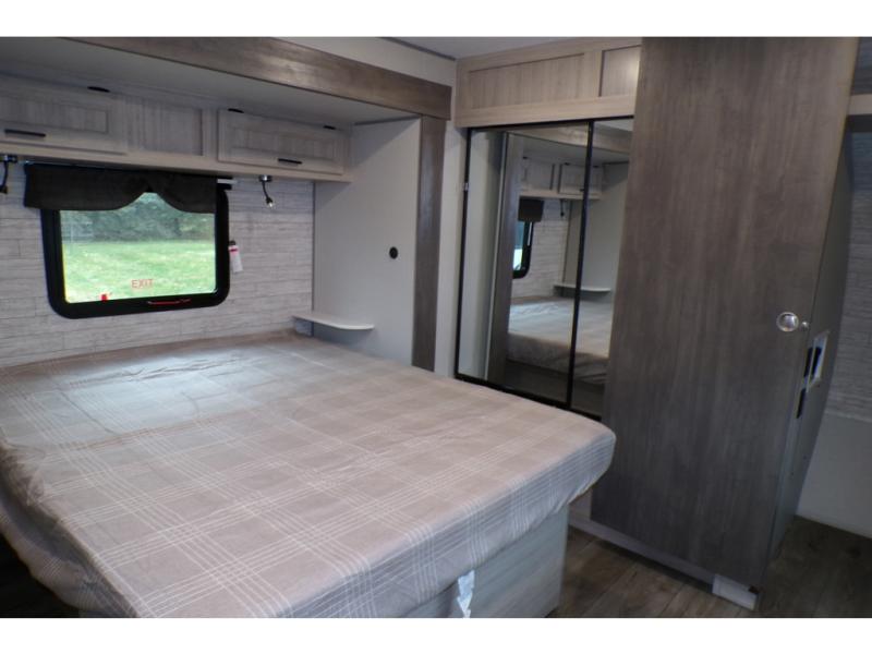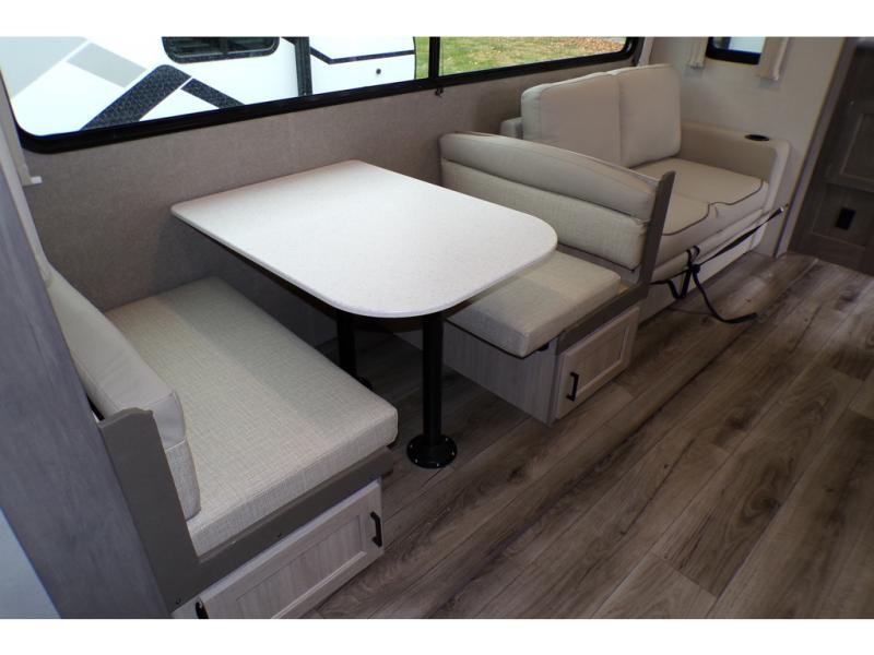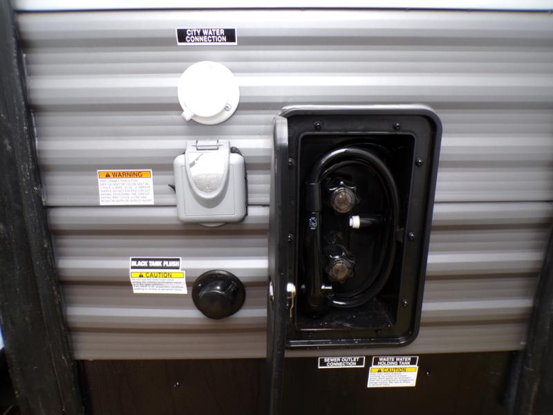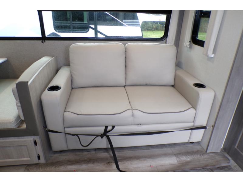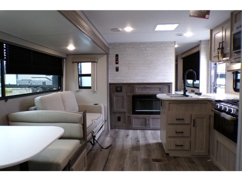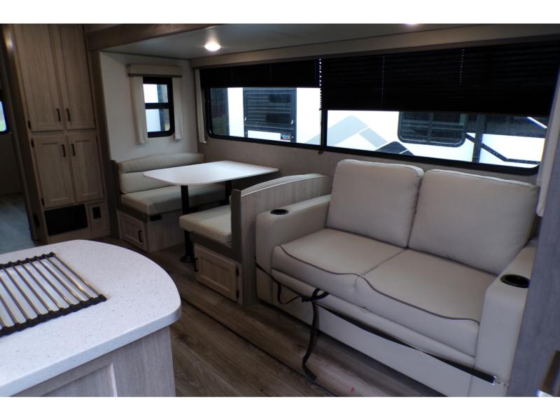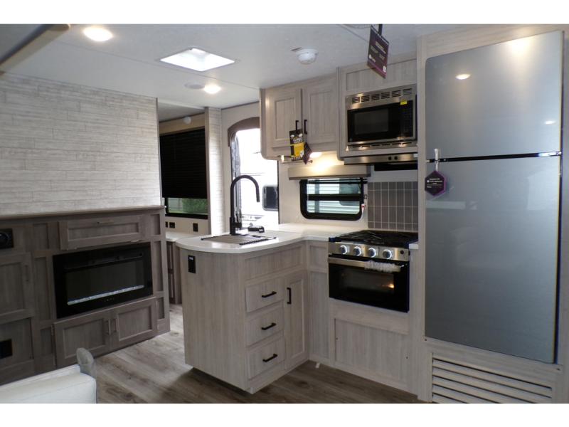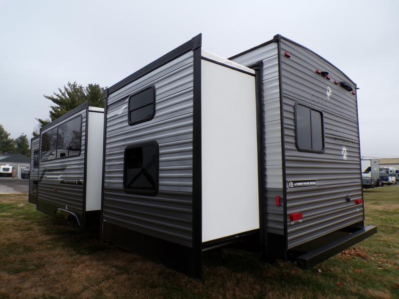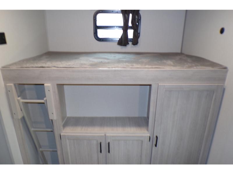 This family-friendly trailer offers lots of floor space thanks to the triple slides throughout! You and your family will love the combined living and kitchen area with a slide out booth dinette and a sofa with drink holders. The L-shaped kitchen counter allows the cook to make meals without moving for anyone trying to get to the full bathroom or the rear bunkhouse. The kids will have their own privacy, two bunk beds, a jack knife sofa with storage totes below plus a TV/wardrobe cabinet. The front private bedroom allows you to sleep like royalty and offers a large closet for your clothing and another closet prepped for a washer/dryer. And don't forget about the full-size camper kitchen and the 21' power awning with multicolor LED lights when you are outside.