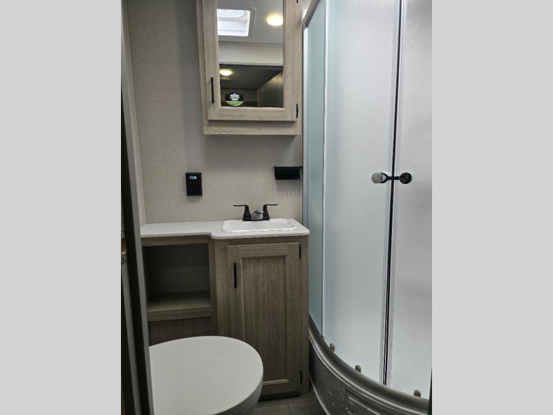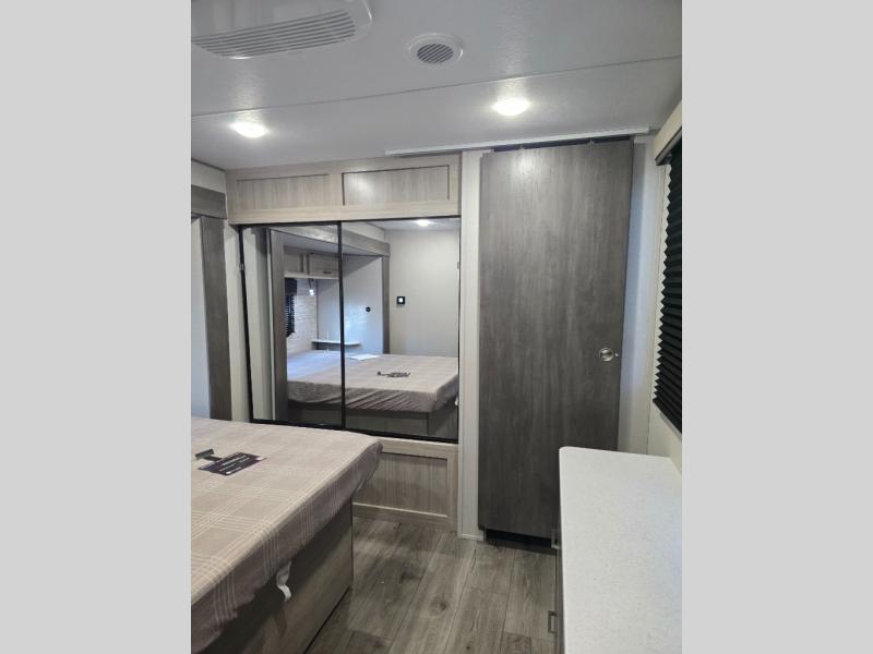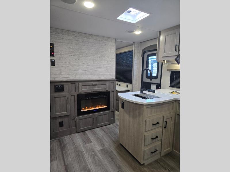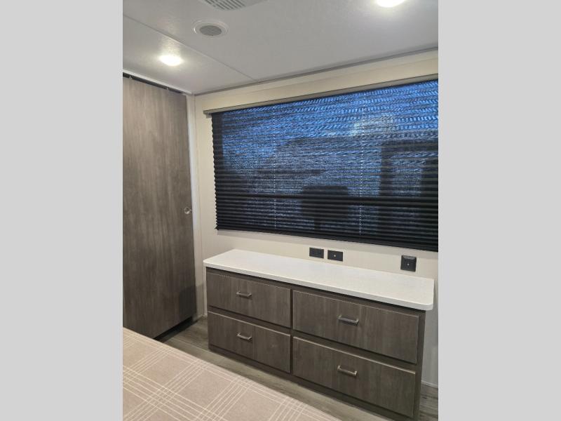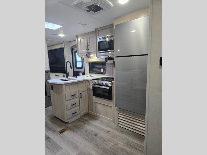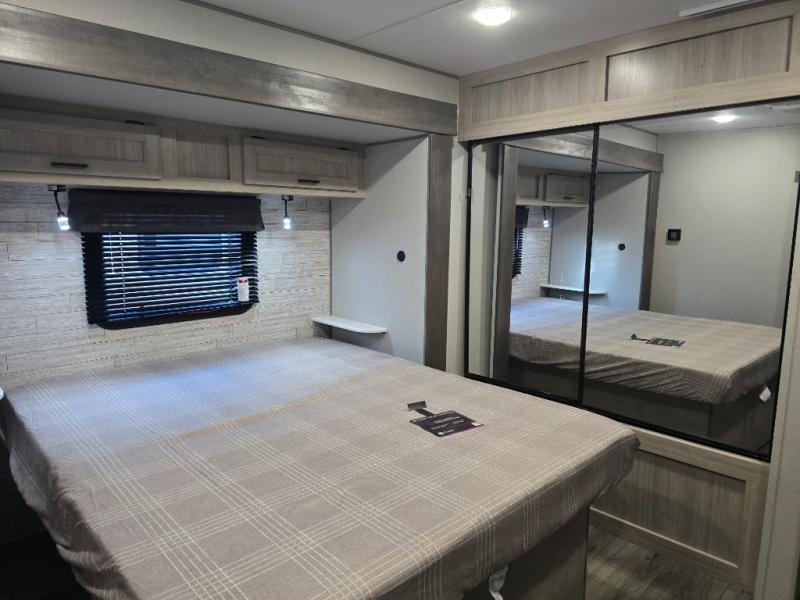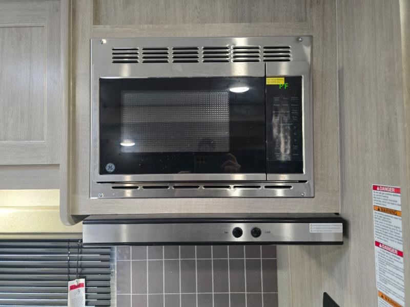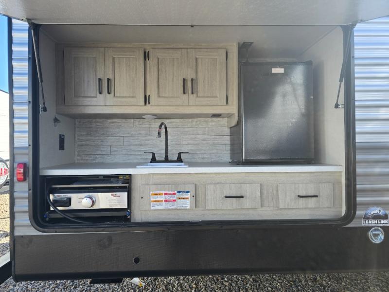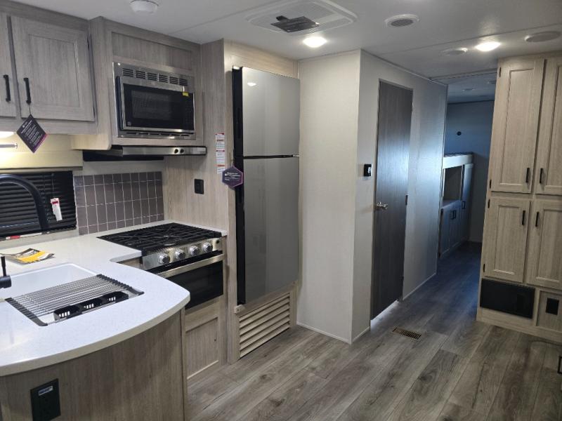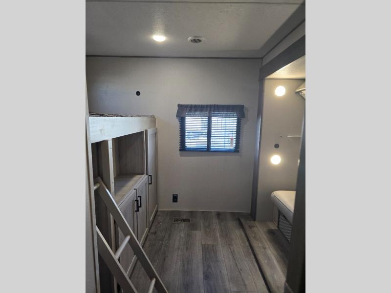 This family-friendly trailer offers lots of floor space thanks to the triple slides throughout! You and your family will love the combined living and kitchen area with a slide out booth dinette and a sofa with drink holders. The L-shaped kitchen counter allows the cook to make meals without moving for anyone trying to get to the full bathroom or the rear bunkhouse. The kids will have their own privacy, two bunk beds, a jack knife sofa with storage totes below plus a TV/wardrobe cabinet. The front private bedroom allows you to sleep like royalty and offers a large closet for your clothing and another closet prepped for a washer/dryer. And don't forget about the full-size camper kitchen and the 21' power awning with multicolor LED lights when you are outside.