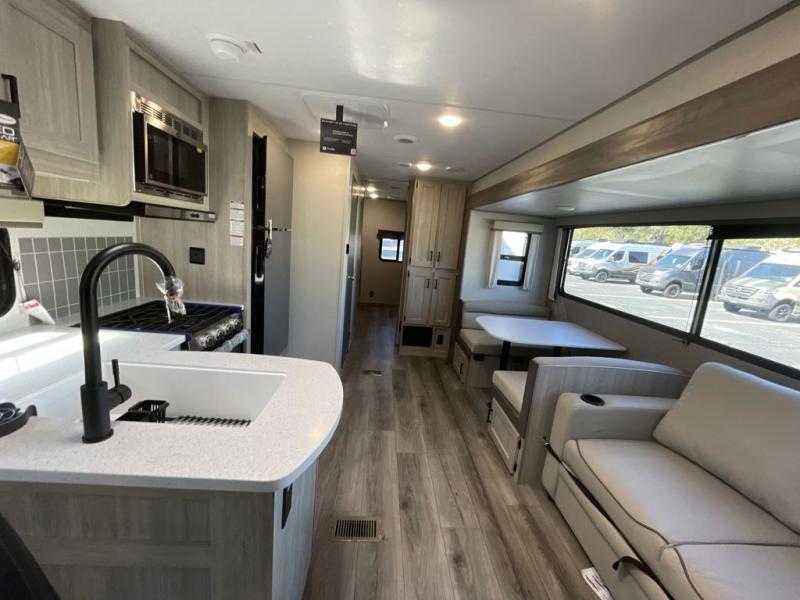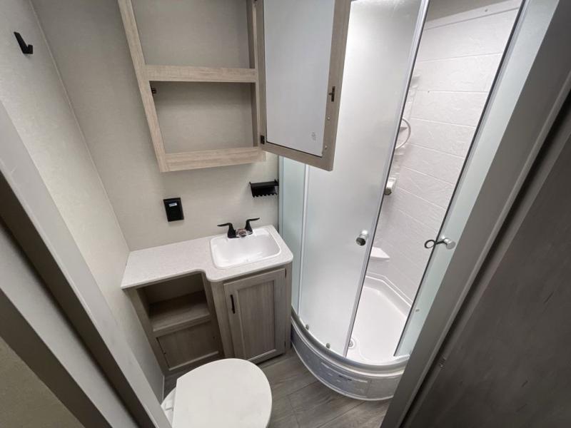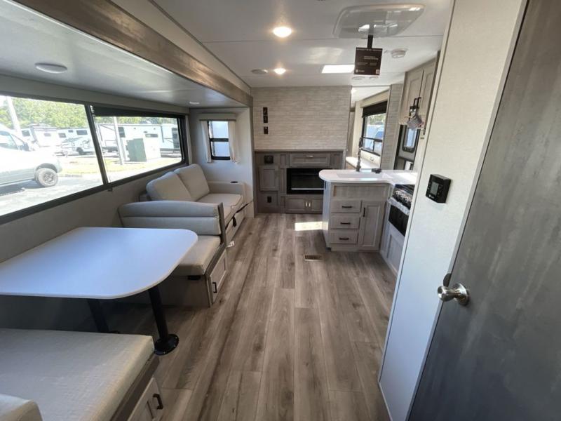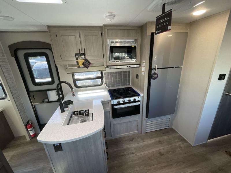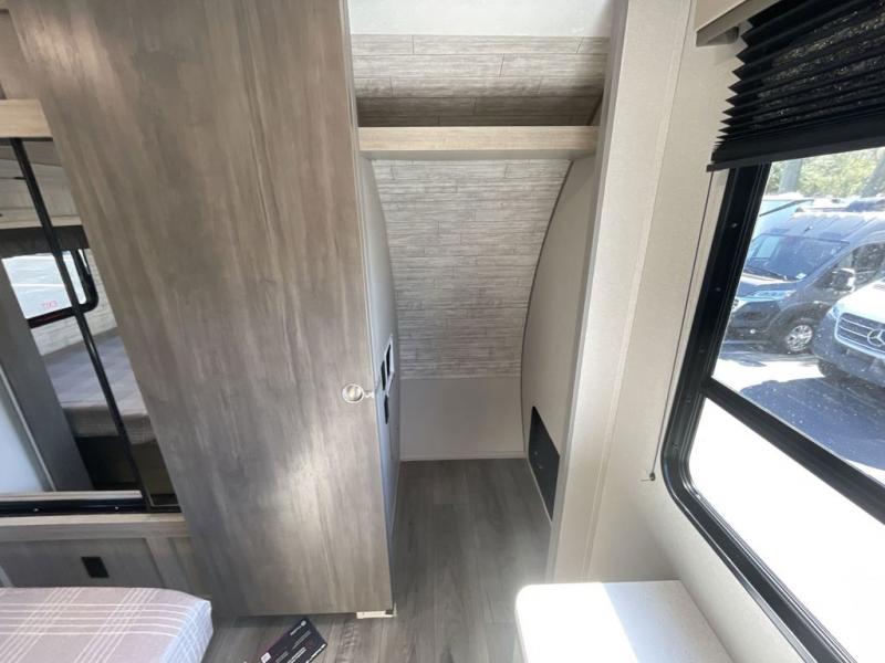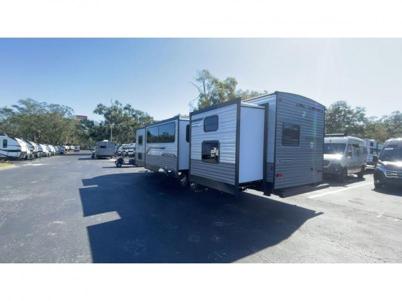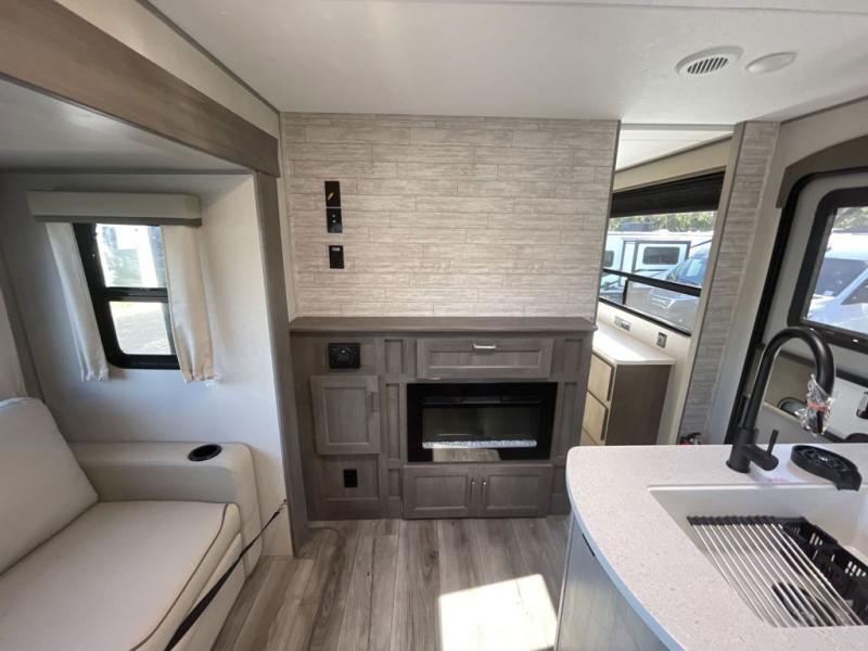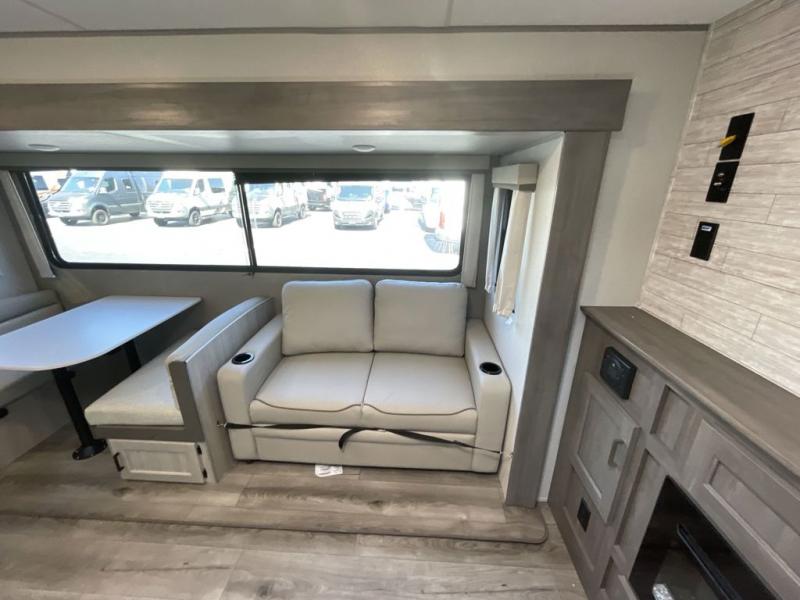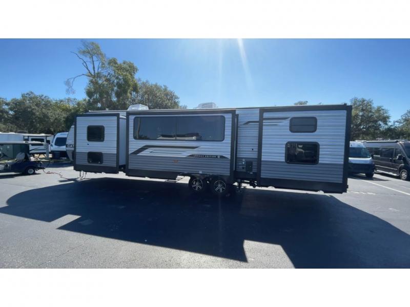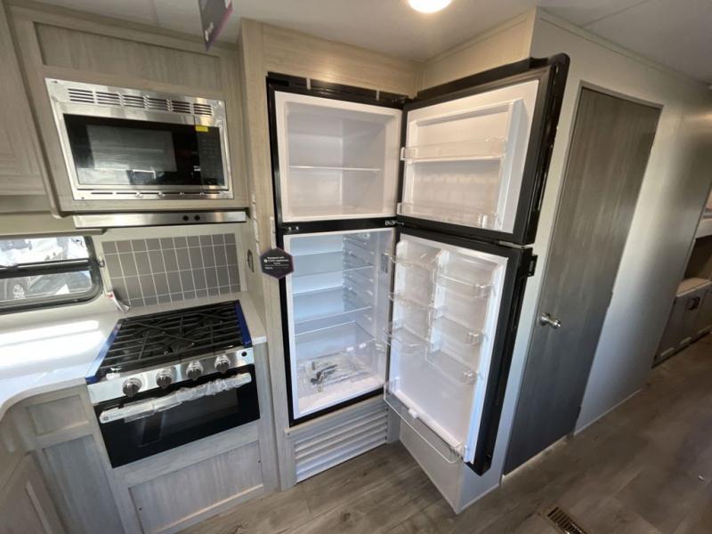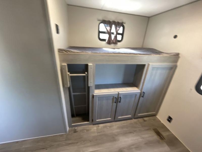 This family-friendly trailer offers lots of floor space thanks to the triple slides throughout! You and your family will love the combined living and kitchen area with a slide out booth dinette and a sofa with drink holders. The L-shaped kitchen counter allows the cook to make meals without moving for anyone trying to get to the full bathroom or the rear bunkhouse. The kids will have their own privacy, two bunk beds, a jack knife sofa with storage totes below plus a TV/wardrobe cabinet. The front private bedroom allows you to sleep like royalty and offers a large closet for your clothing and another closet prepped for a washer/dryer. And don't forget about the full-size camper kitchen and the 21' power awning with multicolor LED lights when you are outside.