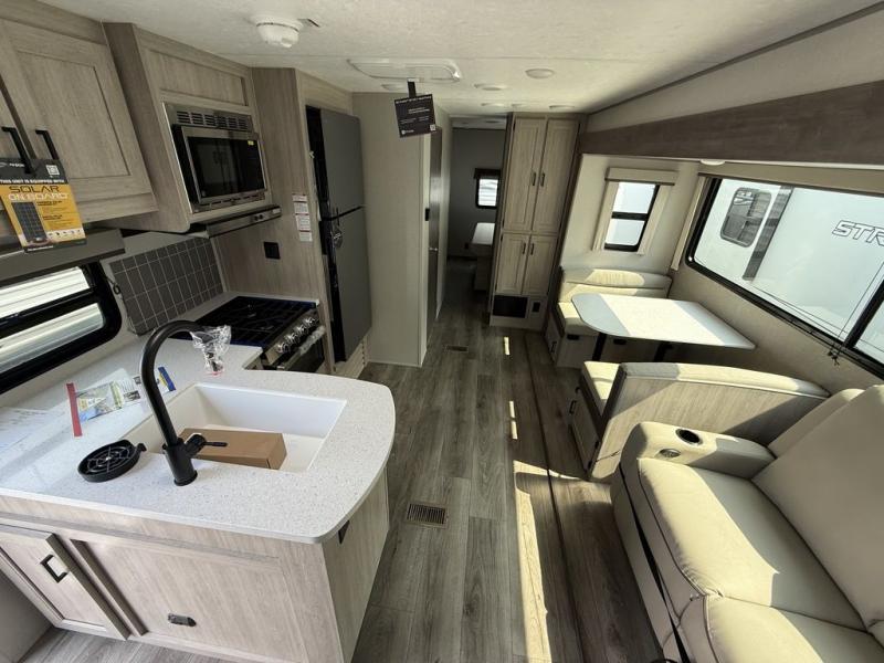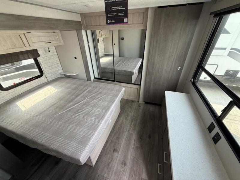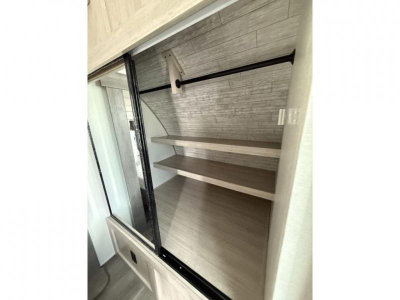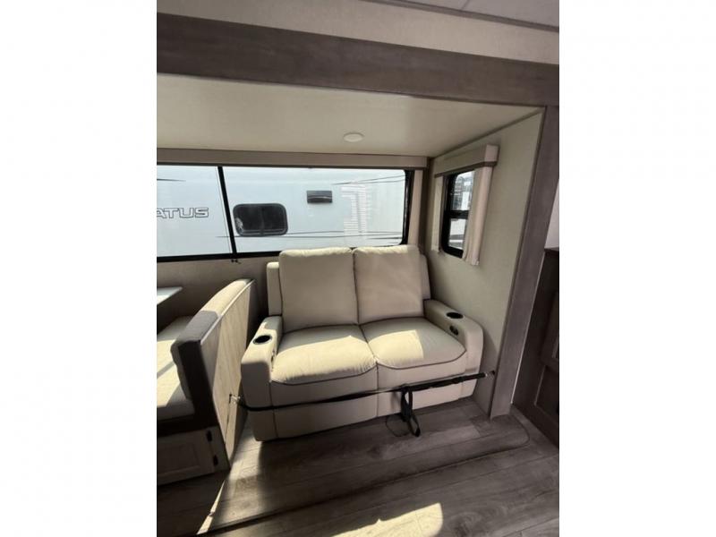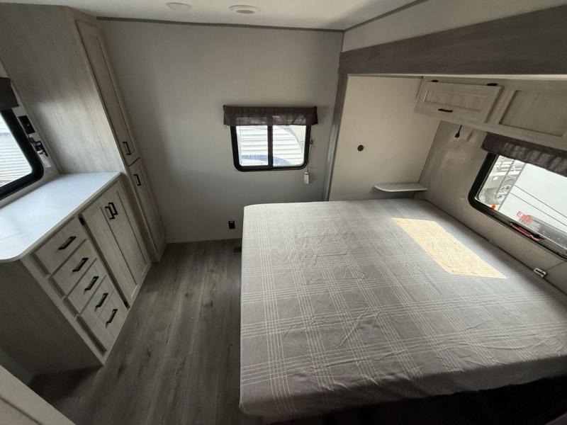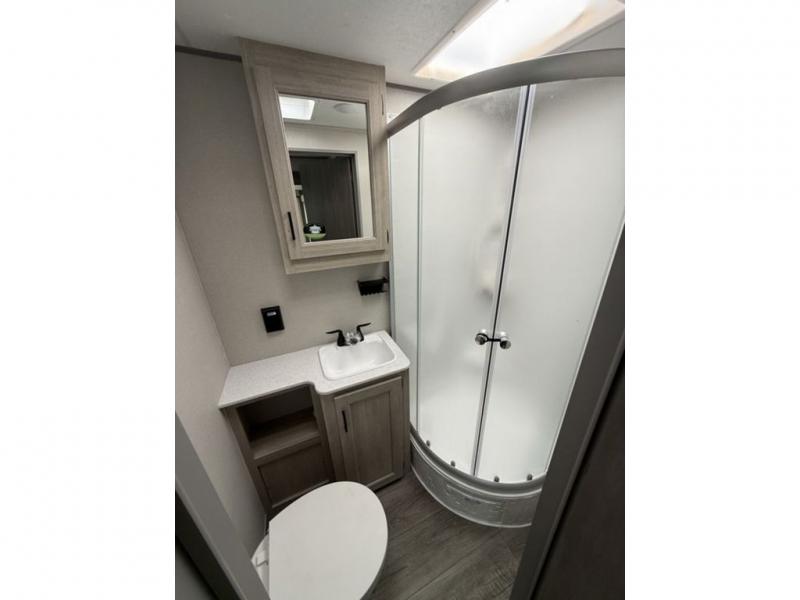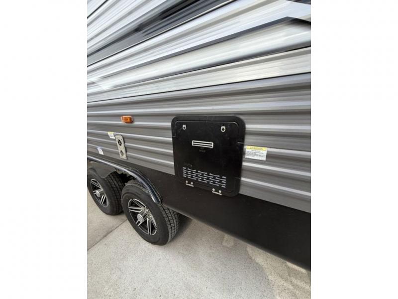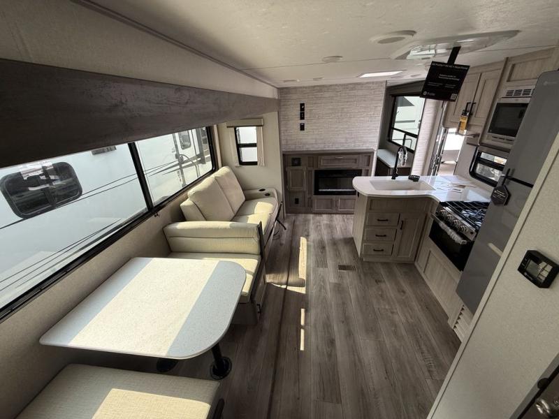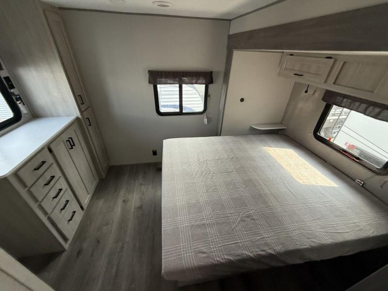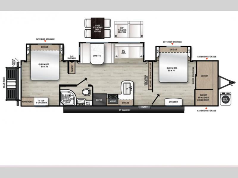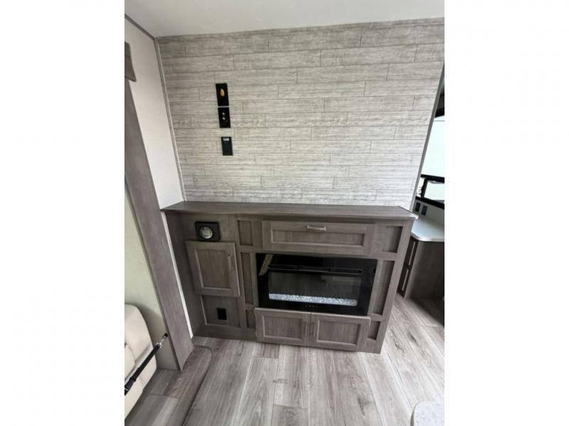 This family-friendly trailer offers lots of floor space thanks to the triple slides throughout! You and your family will love the combined living and kitchen area with a slide out booth dinette and a sofa with drink holders. The L-shaped kitchen counter allows the cook to make meals without moving for anyone trying to get to the full bathroom or the rear bunkhouse. The kids will have their own privacy, two bunk beds, a jack knife sofa with storage totes below plus a TV/wardrobe cabinet. The front private bedroom allows you to sleep like royalty and offers a large closet for your clothing and another closet prepped for a washer/dryer. And don't forget about the full-size camper kitchen and the 21' power awning with multicolor LED lights when you are outside.