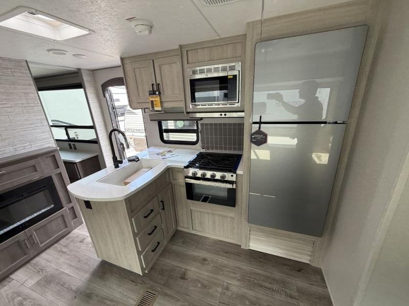 Each Catalina Legacy travel trailer by Coachmen is constructed with a cambered structural steel I-beam frame for added strength and support, plus an enclosed and fully sealed corrugated underbelly to extend your camping season. There is also a seamless Alpha roof membrane, R-7 insulation throughout, full length frame outriggers, plus many more durable construction materials. You will love the 6' 9" interior height, along with Congoleum woodplank linoleum flooring, solid surface kitchen countertops, and hard valance window treatments. Choose a Catalina Legacy today!