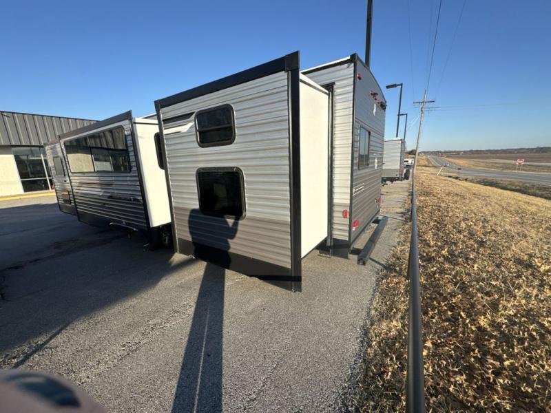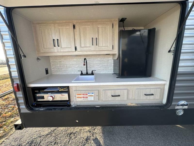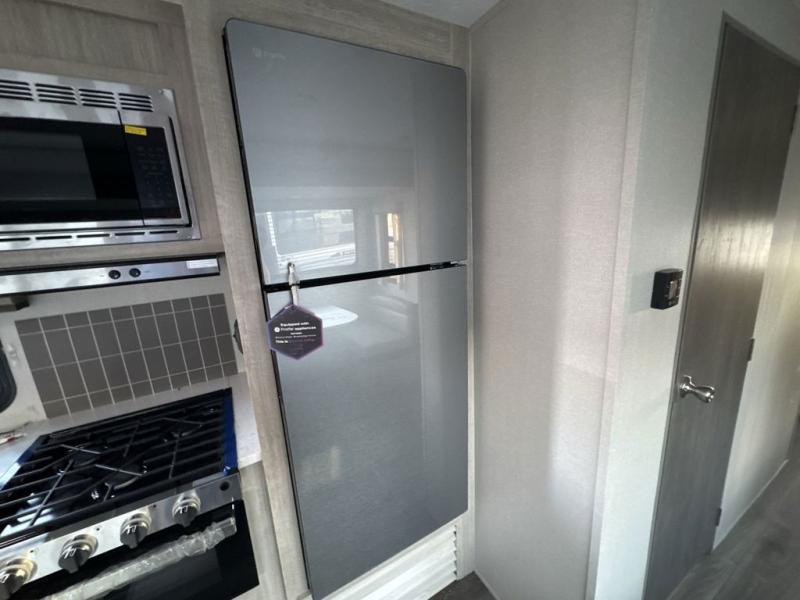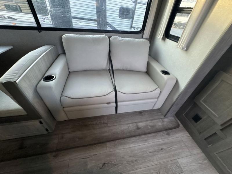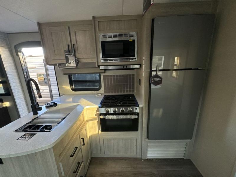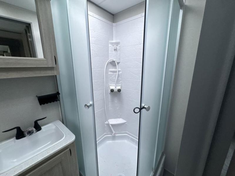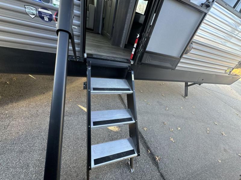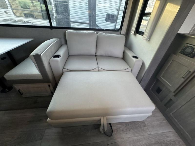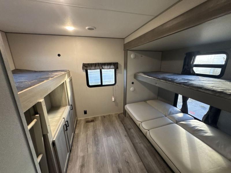 This family-friendly trailer offers lots of floor space thanks to the triple slides throughout! You and your family will love the combined living and kitchen area with a slide out booth dinette and a sofa with drink holders. The L-shaped kitchen counter allows the cook to make meals without moving for anyone trying to get to the full bathroom or the rear bunkhouse. The kids will have their own privacy, two bunk beds, a jack knife sofa with storage totes below plus a TV/wardrobe cabinet. The front private bedroom allows you to sleep like royalty and offers a large closet for your clothing and another closet prepped for a washer/dryer. And don't forget about the full-size camper kitchen and the 21' power awning with multicolor LED lights when you are outside.