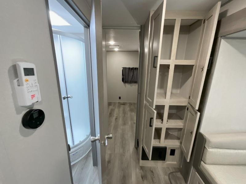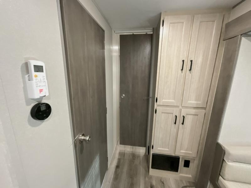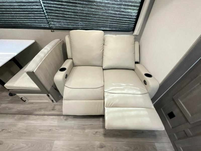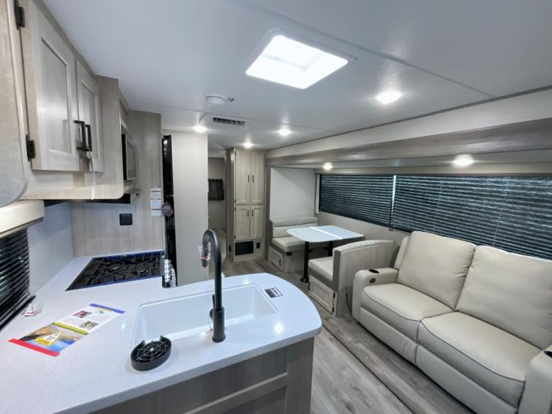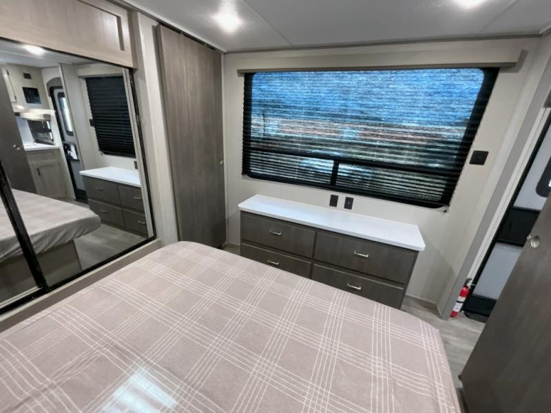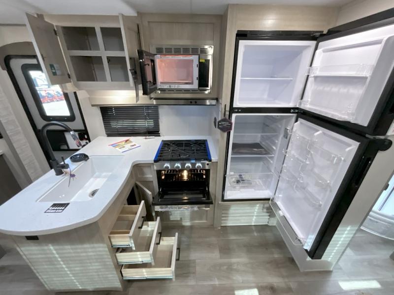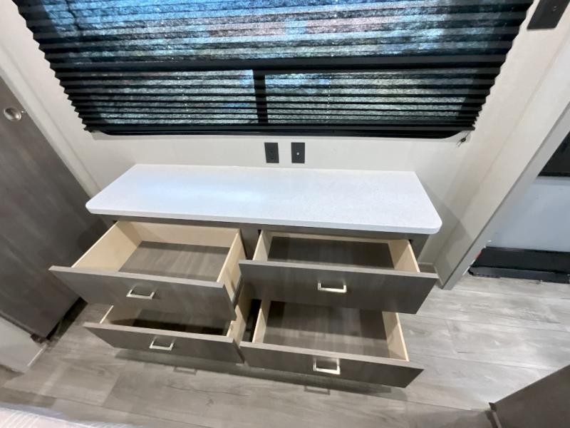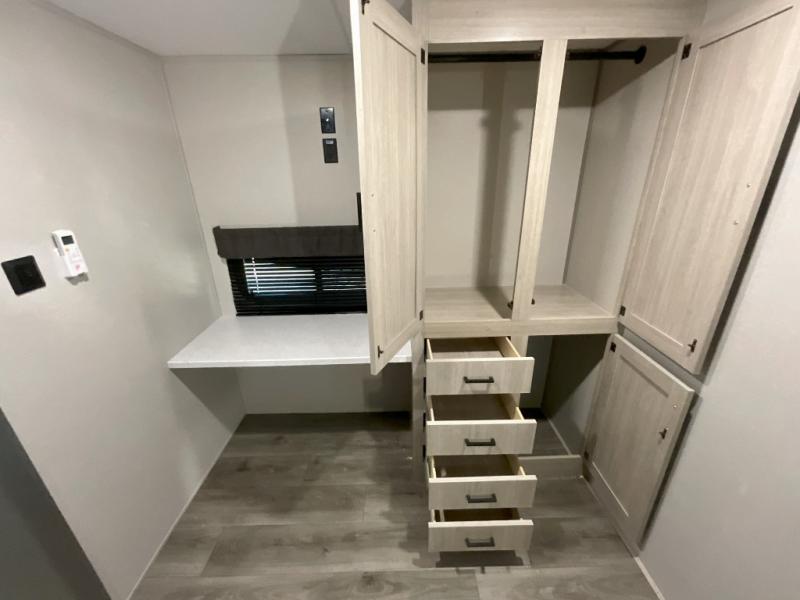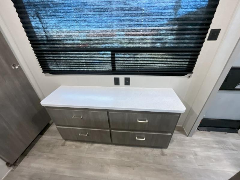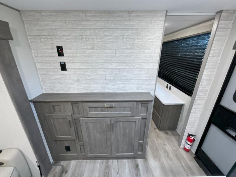 This trailer offers lots of floor space thanks to the triple slides throughout! You and your family will love the combined living and kitchen area with a slide out booth dinette and a sofa with drink holders. The L-shaped kitchen counter allows the cook to make meals without moving for anyone trying to get to the full bathroom and rear den. Here, you'll find a Murphy bed slide, a wardrobe and a workstation with TV hookups if you want to add entertainment. The front private bedroom allows you to sleep like royalty, and offers a large closet for your clothing and another closet prepped for a washer/dryer.