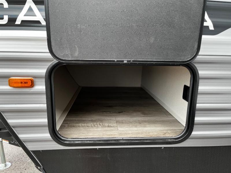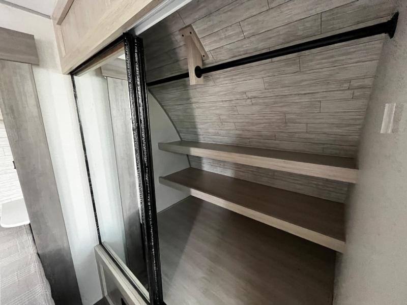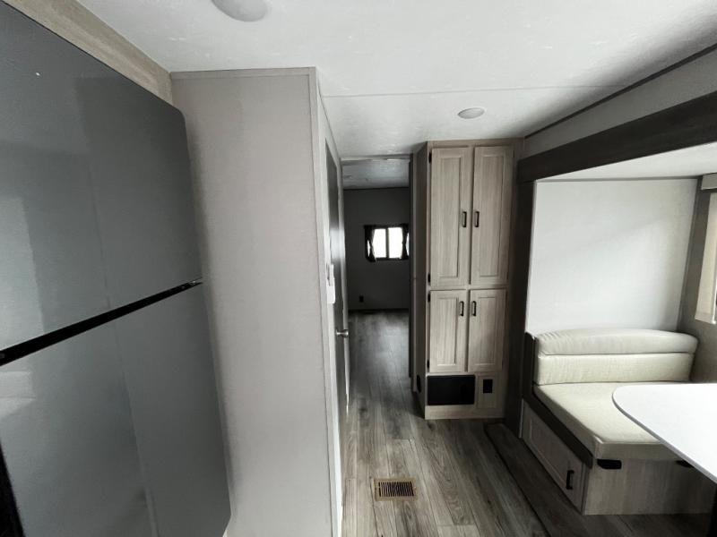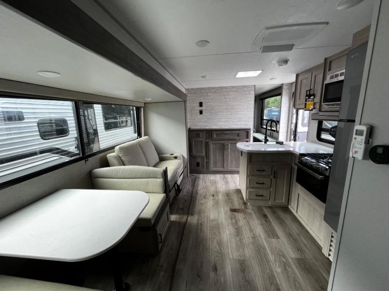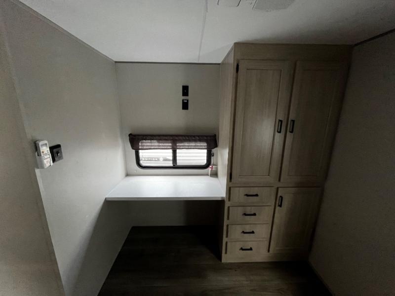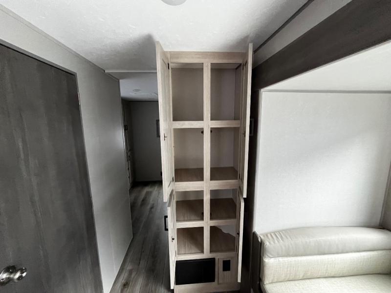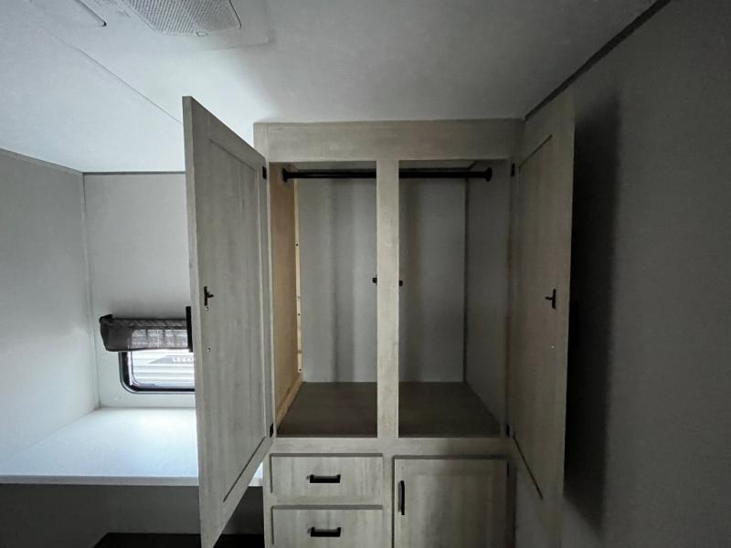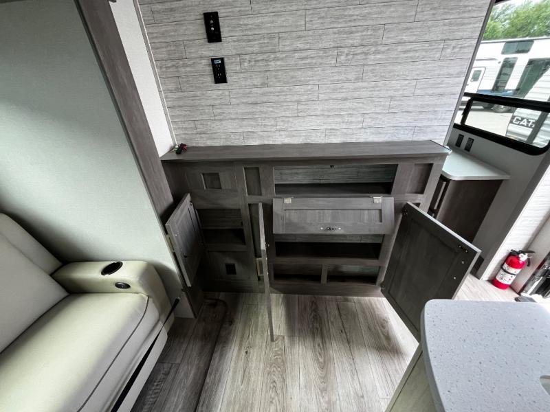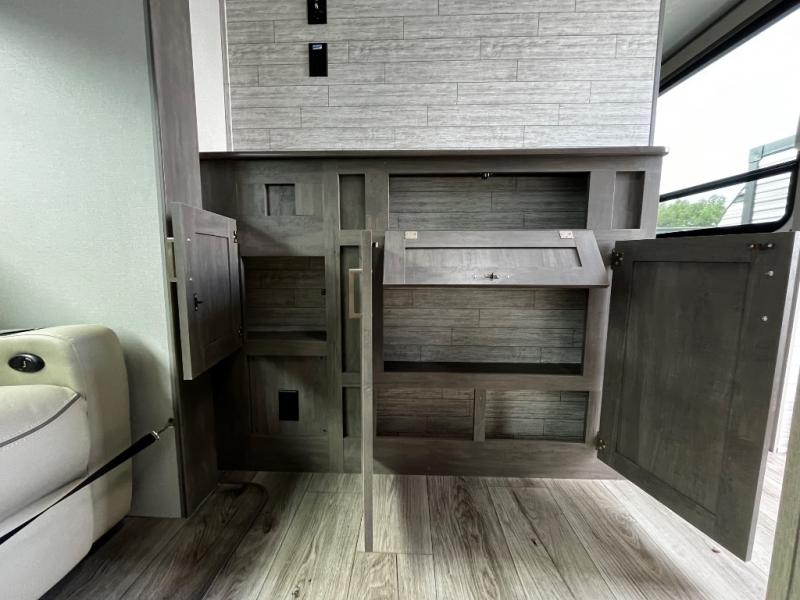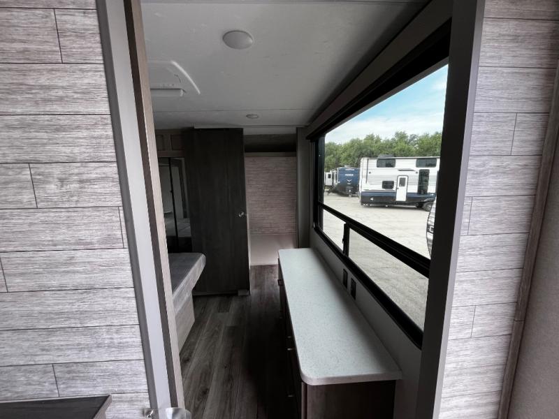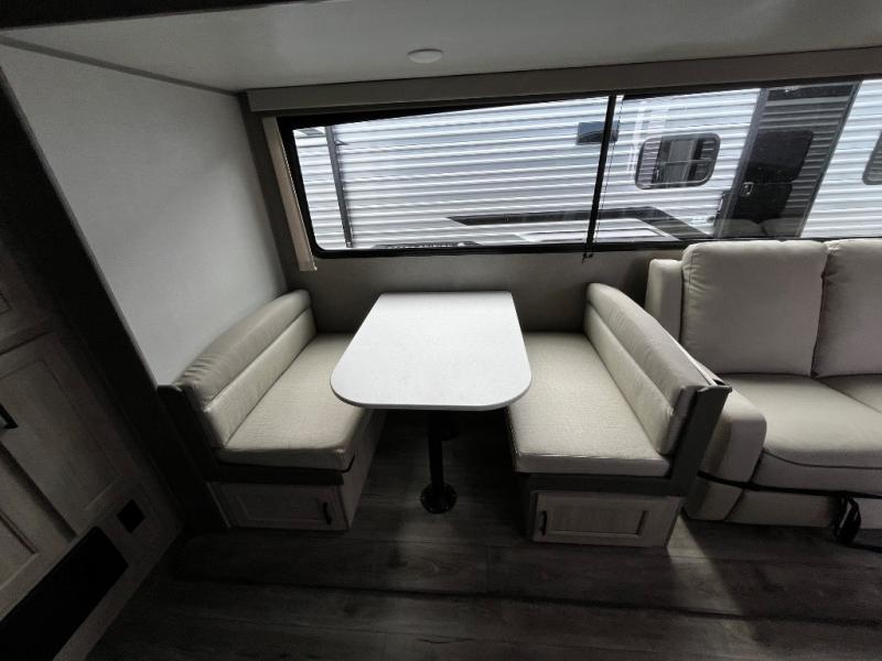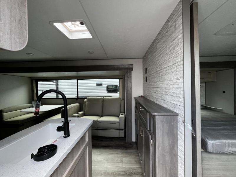 This trailer offers lots of floor space thanks to the triple slides throughout! You and your family will love the combined living and kitchen area with a slide out booth dinette and a sofa with drink holders. The L-shaped kitchen counter allows the cook to make meals without moving for anyone trying to get to the full bathroom and rear den. Here, you'll find a tri-fold hide-a-bed sofa slide, a wardrobe and a workstation if you need to telecommute. The front private bedroom allows you to sleep like royalty and offers a large closet for your clothing and another closet prepped for a washer/dryer.