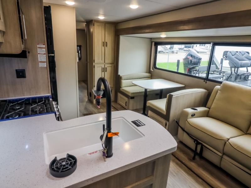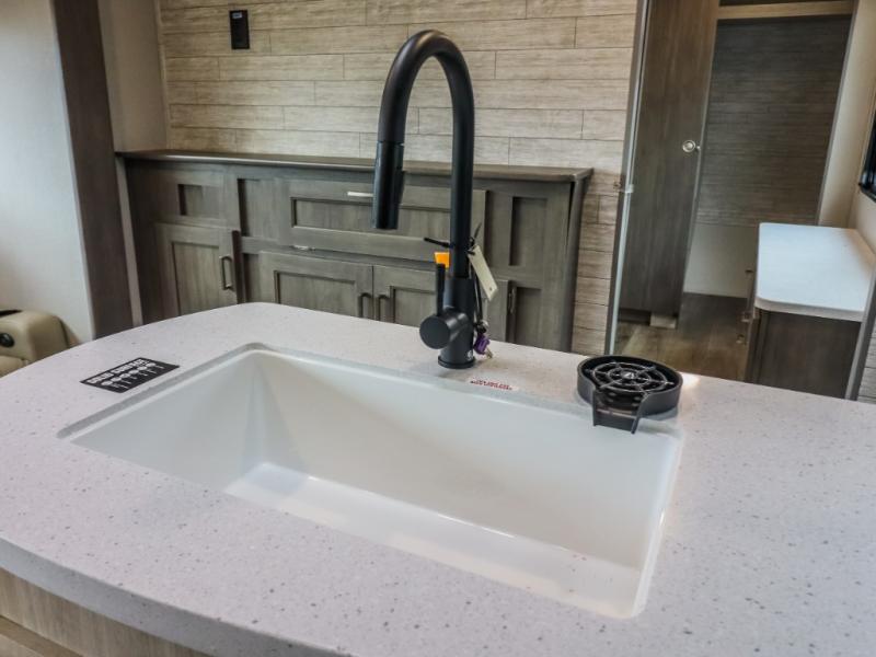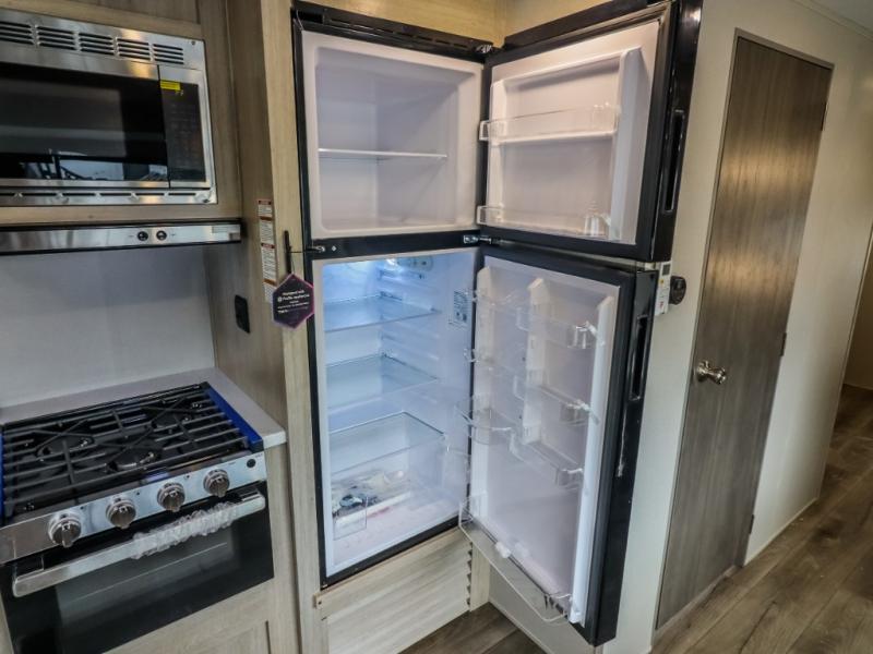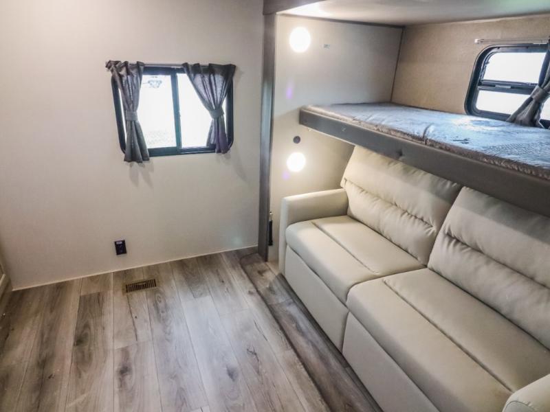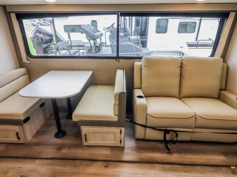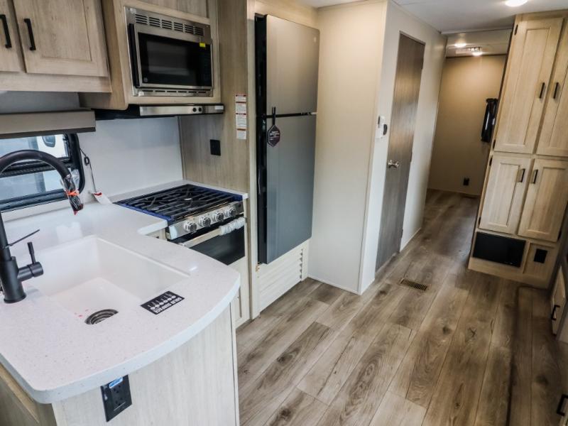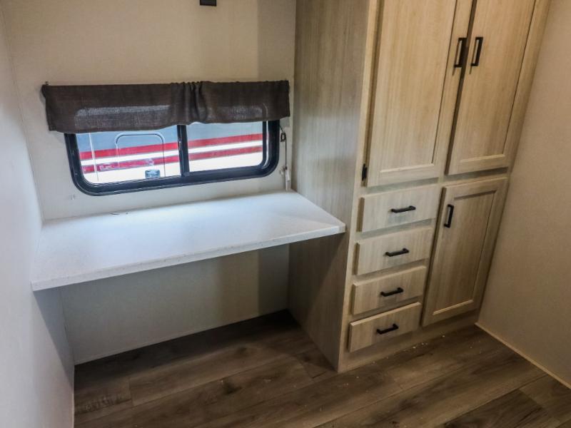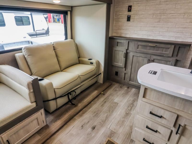This trailer offers lots of floor space thanks to the triple slides throughout! You and your family will love the combined living and kitchen area with a slide out booth dinette and a sofa with drink holders. The L-shaped kitchen counter allows the cook to make meals without moving for anyone trying to get to the full bathroom and rear den. Here, you'll find a tri-fold hide-a-bed sofa slide, a wardrobe and a workstation if you need to telecommute. The front private bedroom allows you to sleep like royalty and offers a large closet for your clothing and another closet prepped for a washer/dryer.