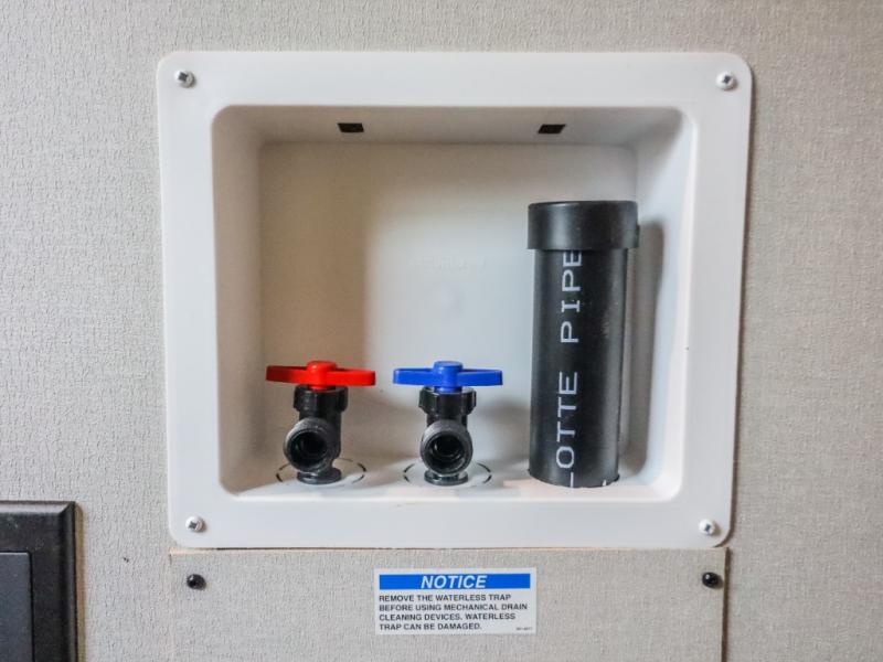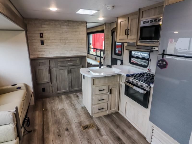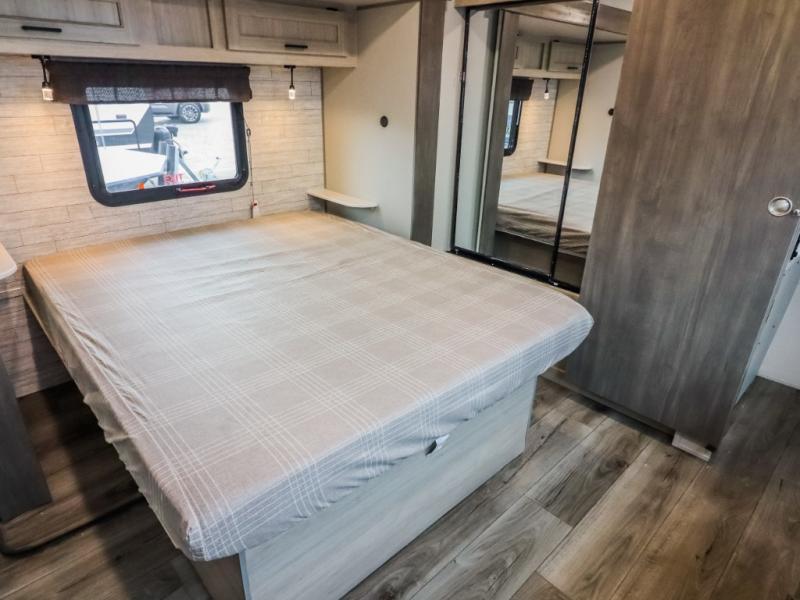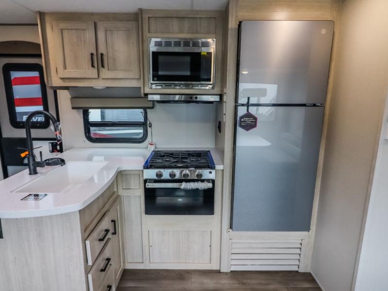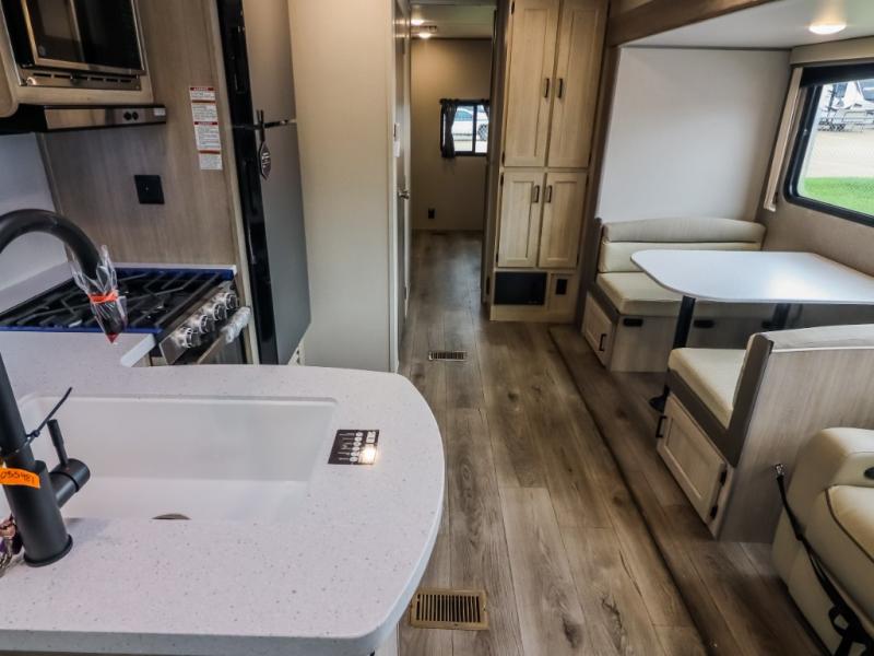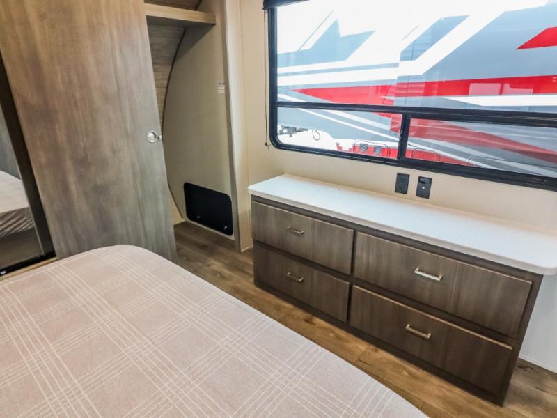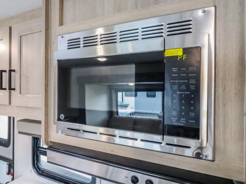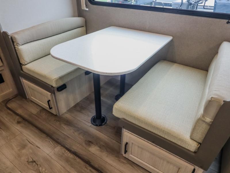 This trailer offers lots of floor space thanks to the triple slides throughout! You and your family will love the combined living and kitchen area with a slide out booth dinette and a sofa with drink holders. The L-shaped kitchen counter allows the cook to make meals without moving for anyone trying to get to the full bathroom and rear den. Here, you'll find a tri-fold hide-a-bed sofa slide, a wardrobe and a workstation if you need to telecommute. The front private bedroom allows you to sleep like royalty and offers a large closet for your clothing and another closet prepped for a washer/dryer.