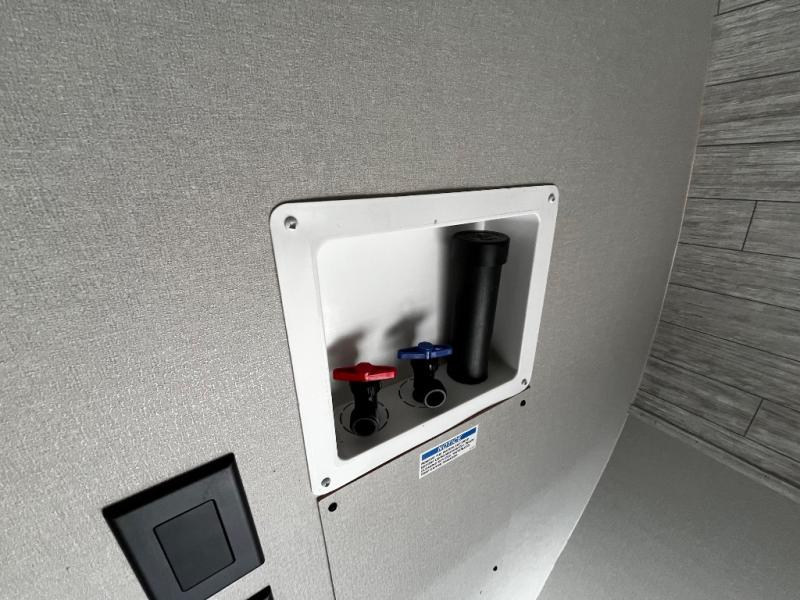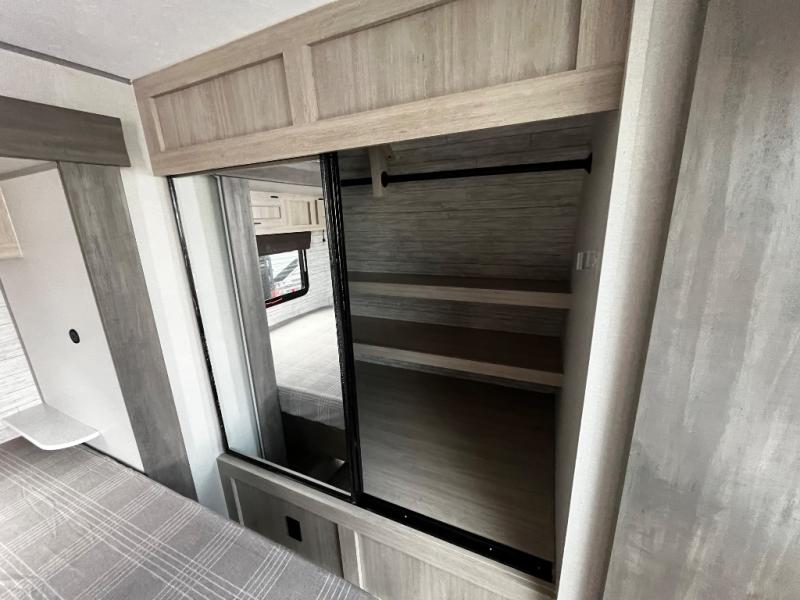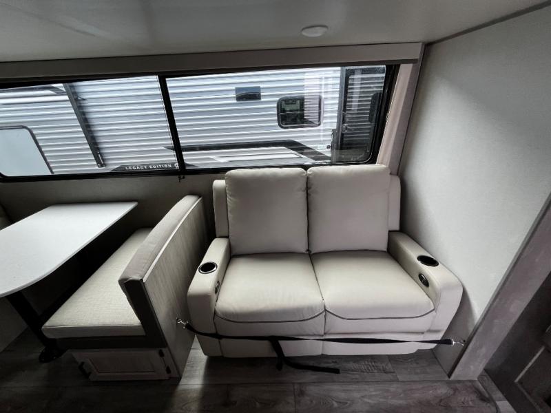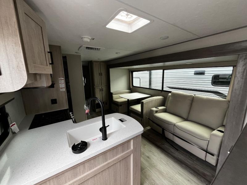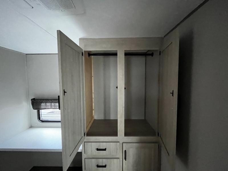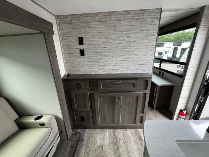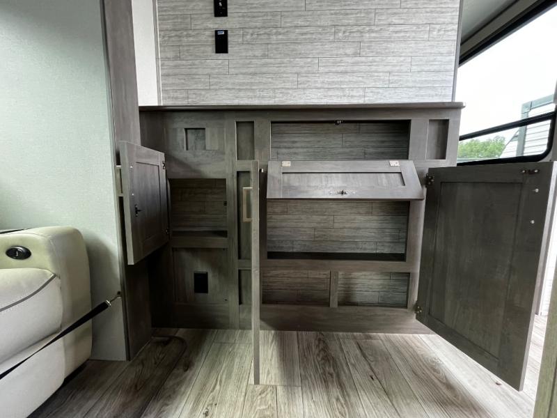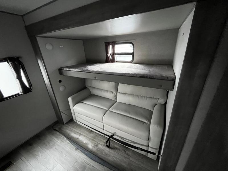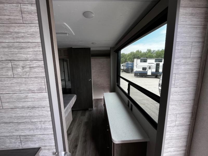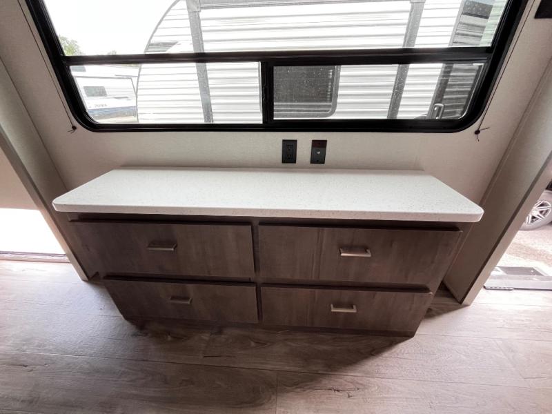 This trailer offers lots of floor space thanks to the triple slides throughout! You and your family will love the combined living and kitchen area with a slide out booth dinette and a sofa with drink holders. The L-shaped kitchen counter allows the cook to make meals without moving for anyone trying to get to the full bathroom and rear den. Here, you'll find a tri-fold hide-a-bed sofa slide, a wardrobe and a workstation if you need to telecommute. The front private bedroom allows you to sleep like royalty and offers a large closet for your clothing and another closet prepped for a washer/dryer.