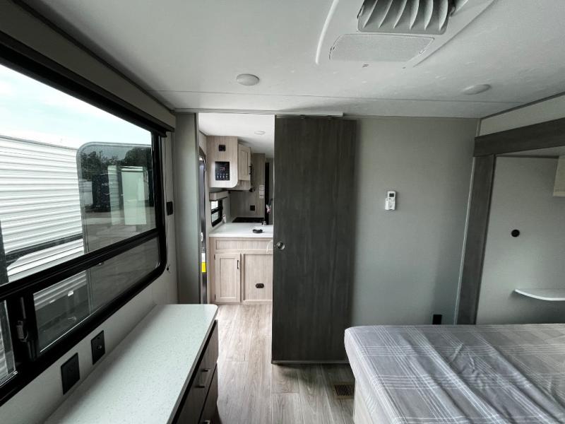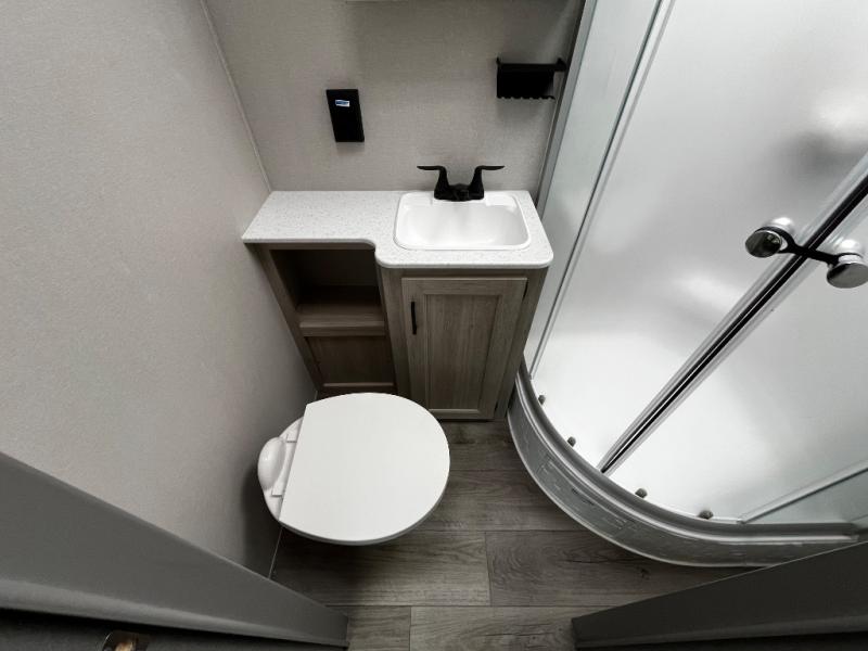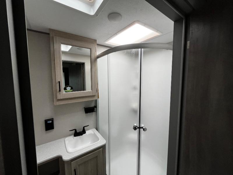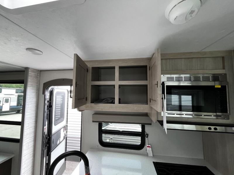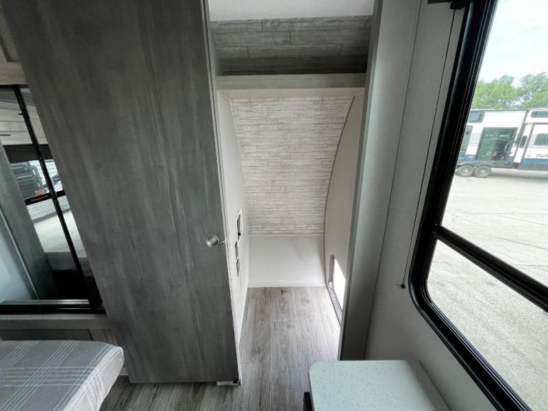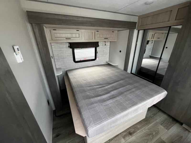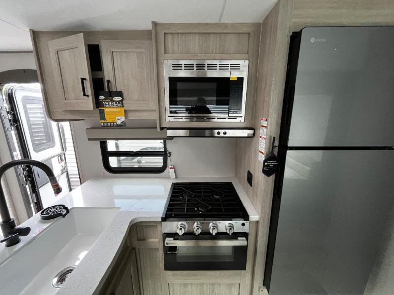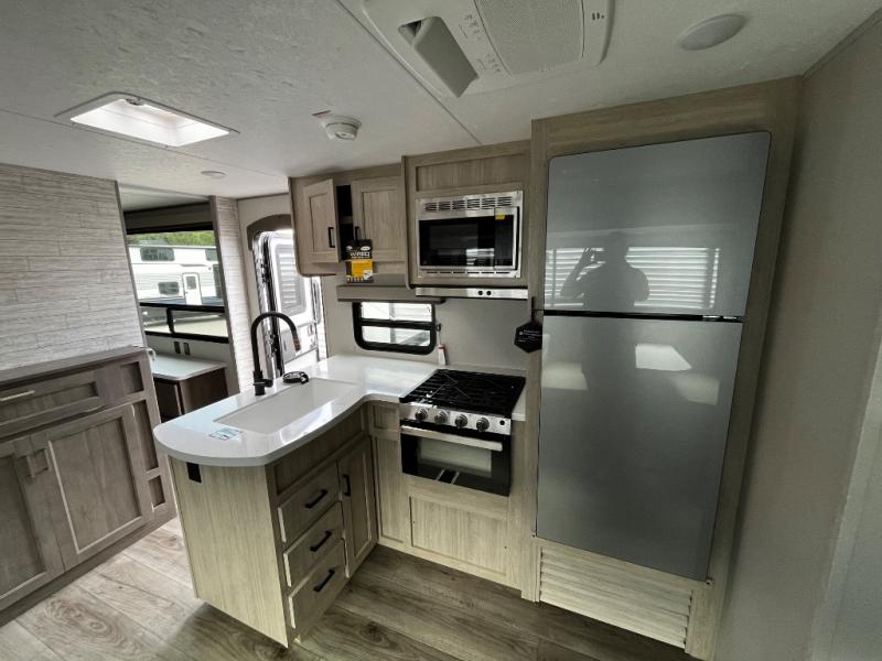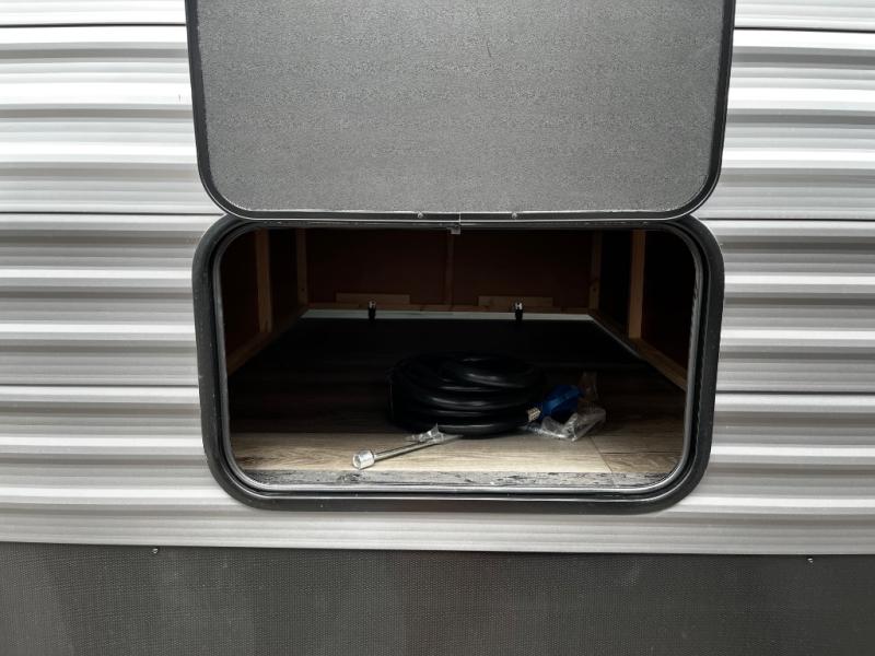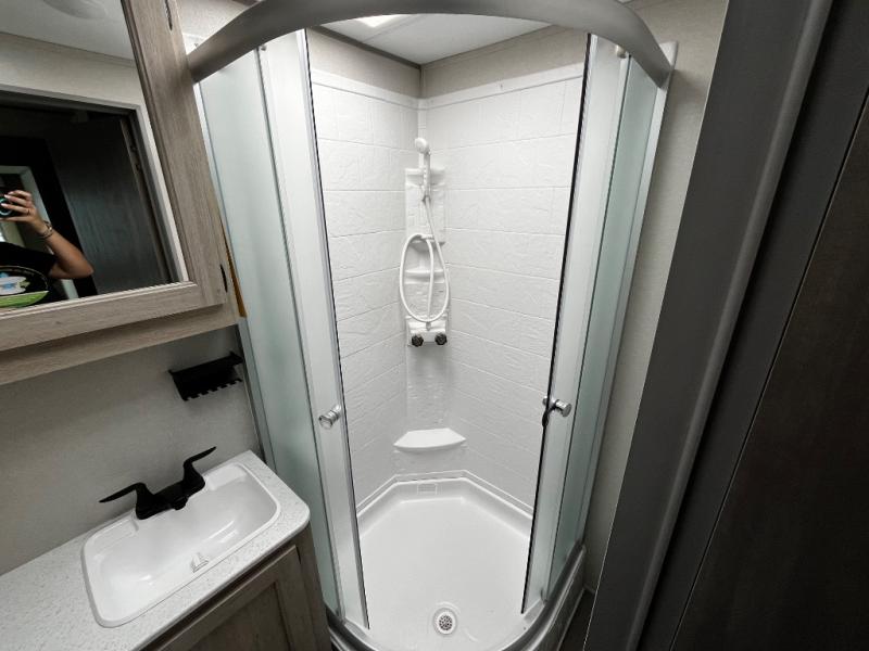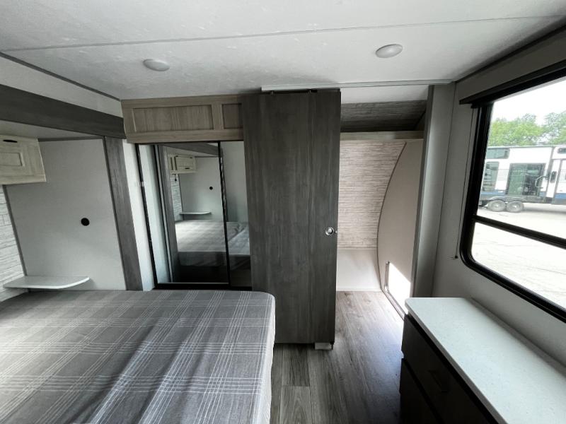 This trailer offers lots of floor space thanks to the triple slides throughout! You and your family will love the combined living and kitchen area with a slide out booth dinette and a sofa with drink holders. The L-shaped kitchen counter allows the cook to make meals without moving for anyone trying to get to the full bathroom and rear den. Here, you'll find a tri-fold hide-a-bed sofa slide, a wardrobe and a workstation if you need to telecommute. The front private bedroom allows you to sleep like royalty and offers a large closet for your clothing and another closet prepped for a washer/dryer.