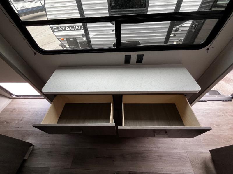 Each Catalina Legacy travel trailer by Coachmen is constructed with a cambered structural steel I-beam frame for added strength and support, plus an enclosed and fully sealed corrugated underbelly to extend your camping season. There is also a seamless Alpha roof membrane, R-7 insulation throughout, full length frame outriggers, plus many more durable construction materials. You will love the 6' 9" interior height, along with Congoleum woodplank linoleum flooring, solid surface kitchen countertops, and hard valance window treatments. Choose a Catalina Legacy today!