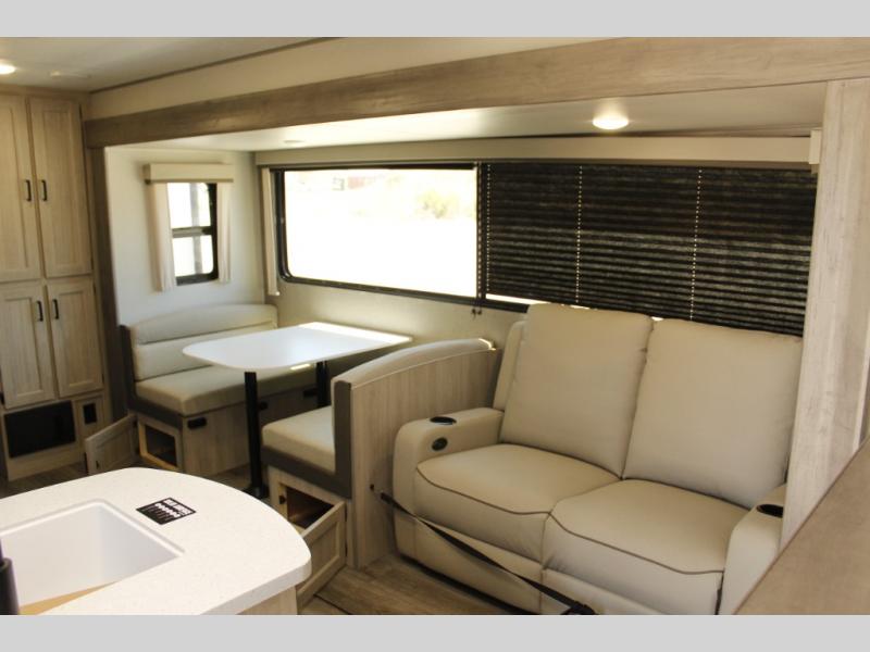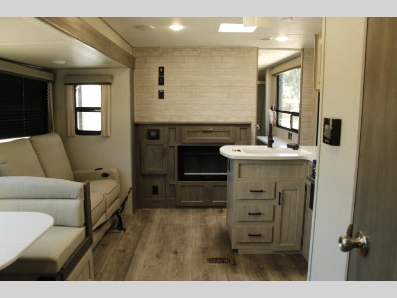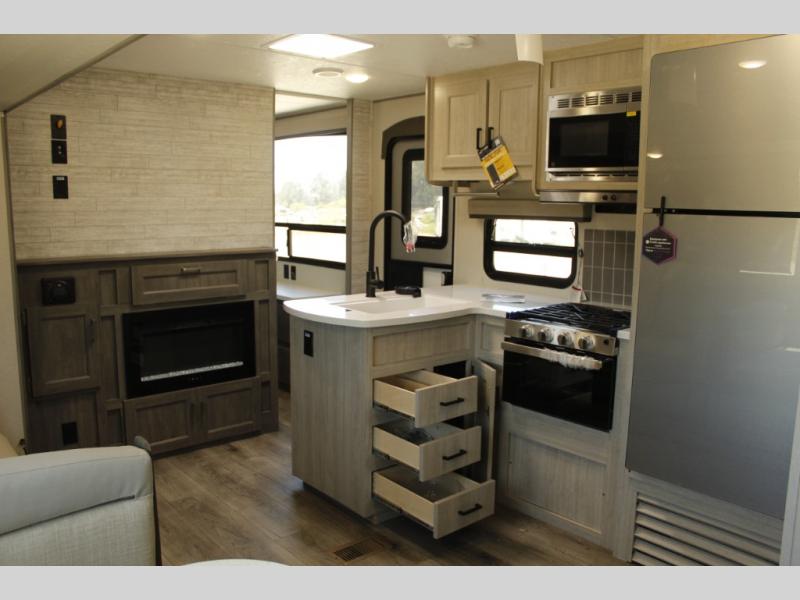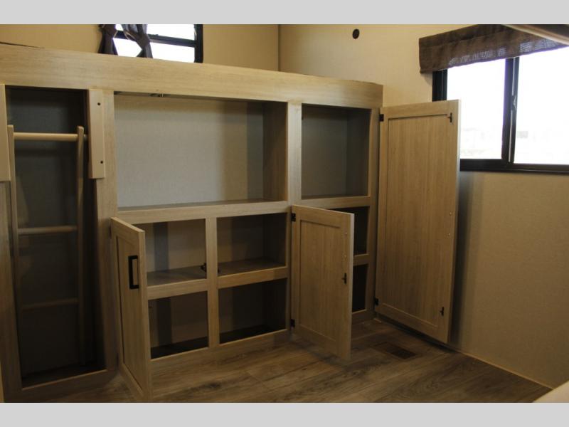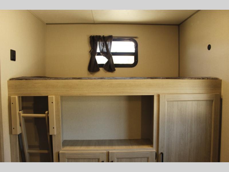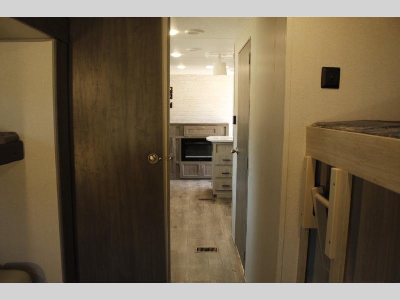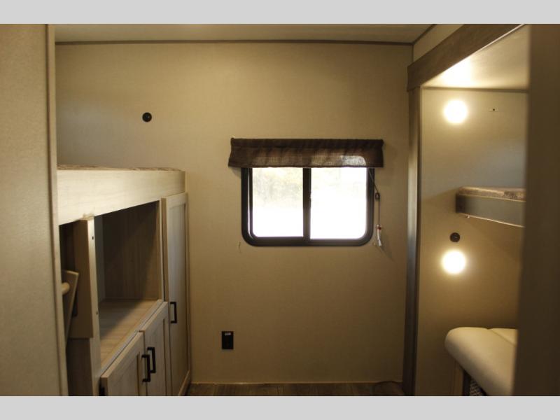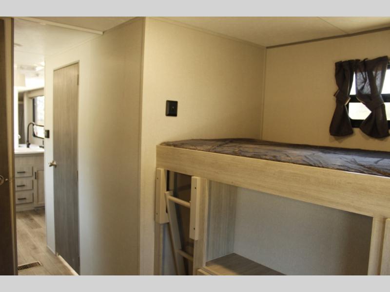This family-friendly trailer offers lots of floor space thanks to the triple slides throughout! You and your family will love the combined living and kitchen area with a slide out booth dinette and a sofa with drink holders. The L-shaped kitchen counter allows the cook to make meals without moving for anyone trying to get to the full bathroom or the rear bunkhouse. The kids will have their own privacy, two bunk beds, a jack knife sofa with storage totes below plus a TV/wardrobe cabinet. The front private bedroom allows you to sleep like royalty, and offers a large closet for your clothing and another closet prepped for a washer/dryer. And don't forget about the full size camper kitchen and the 21' power awning with multicolor LED lights when you are outside.