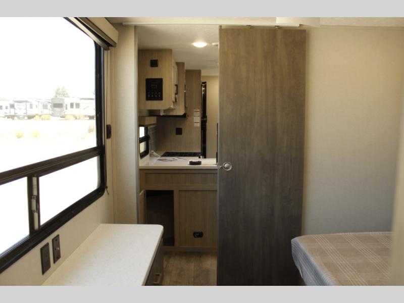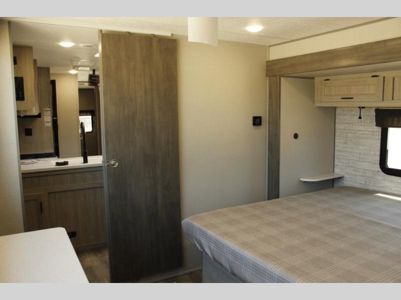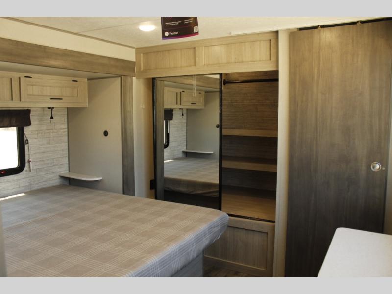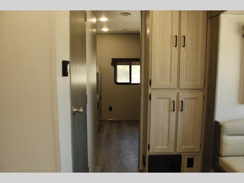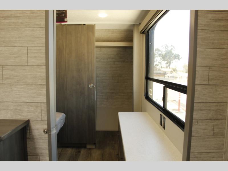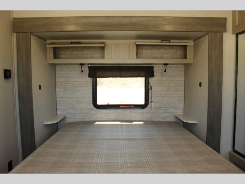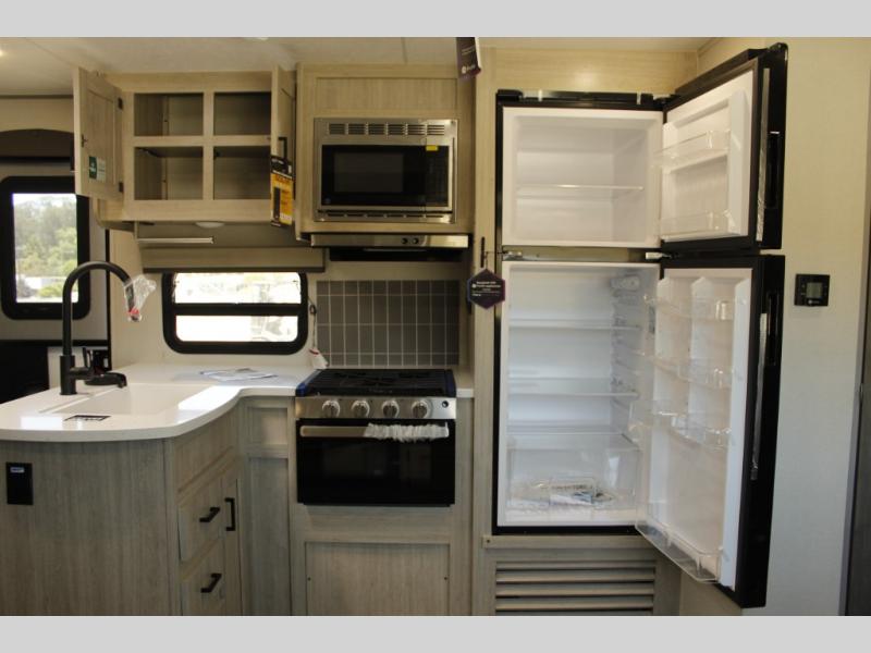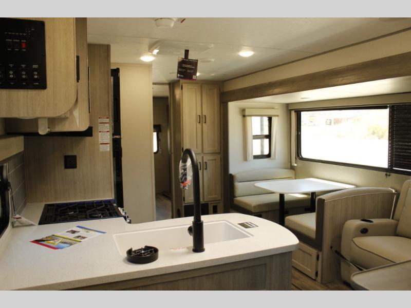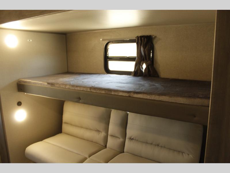 This family-friendly trailer offers lots of floor space thanks to the triple slides throughout! You and your family will love the combined living and kitchen area with a slide out booth dinette and a sofa with drink holders. The L-shaped kitchen counter allows the cook to make meals without moving for anyone trying to get to the full bathroom or the rear bunkhouse. The kids will have their own privacy, two bunk beds, a jack knife sofa with storage totes below plus a TV/wardrobe cabinet. The front private bedroom allows you to sleep like royalty, and offers a large closet for your clothing and another closet prepped for a washer/dryer. And don't forget about the full size camper kitchen and the 21' power awning with multicolor LED lights when you are outside.