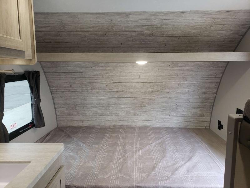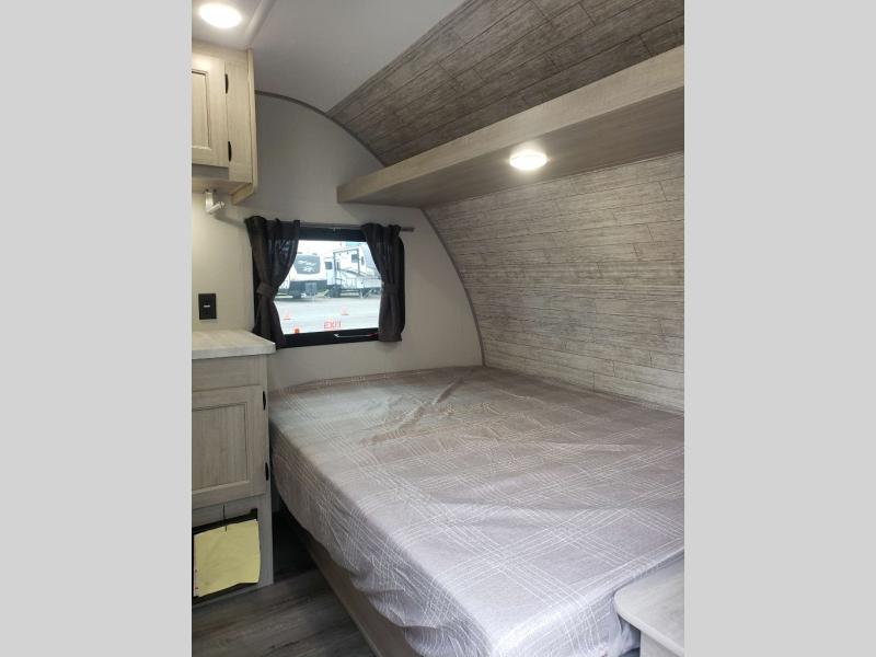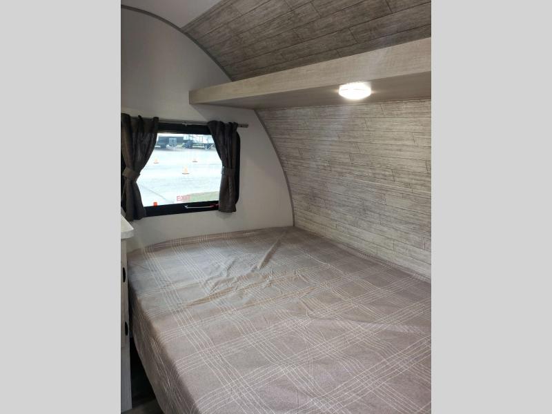 Lightweight camping is easier than you think with this travel trailer in tow! The front 54" x 74" queen bed will provide a great night's rest each night, while the little ones or your guests take the bunk beds. There is a handy shelf above the front bed for your belongings plus additional bedroom storage. A private bath includes a 24" x 32" shower and a toilet with a mirror behind it so you can freshen up each day. You'll also find a two burner cooktop and microwave oven to make meals each day plus a 3.3 cu. ft. 12V refrigerator for food storage!