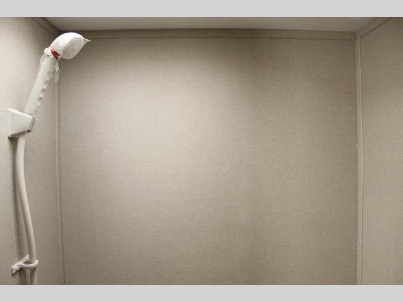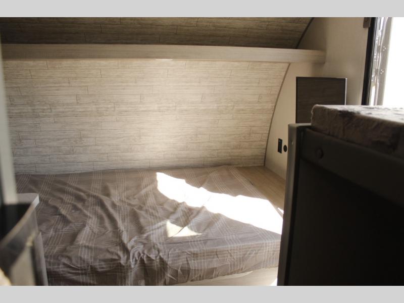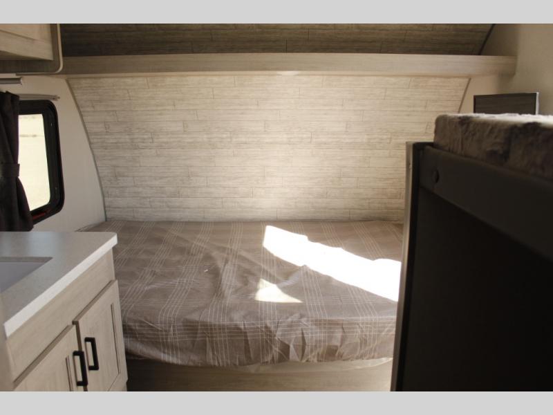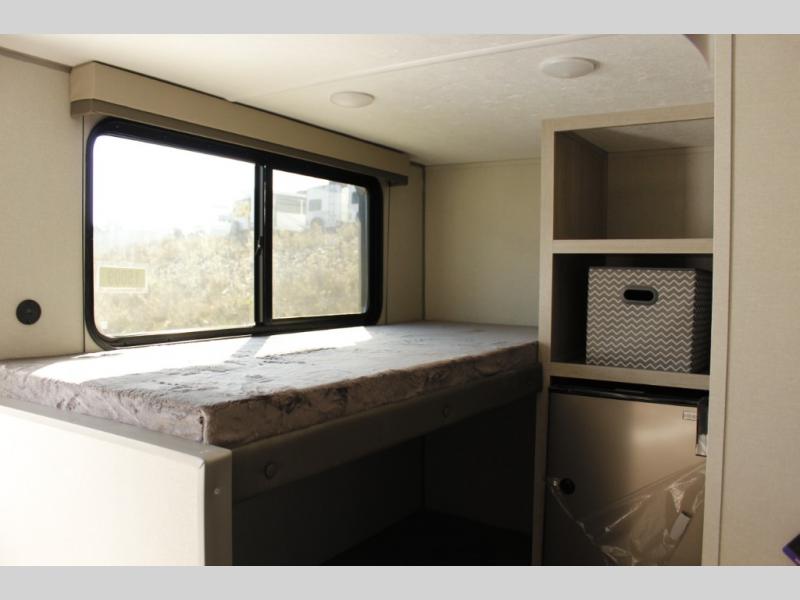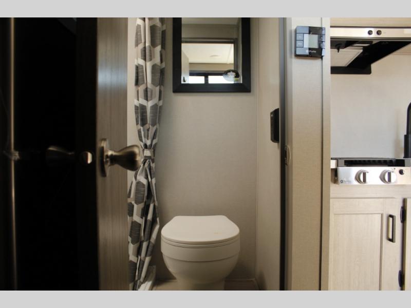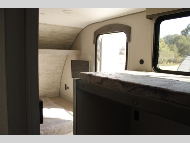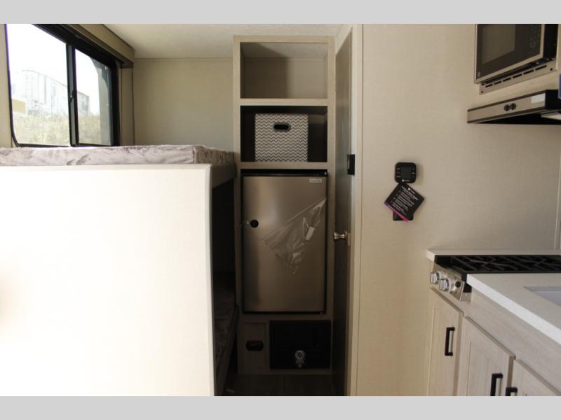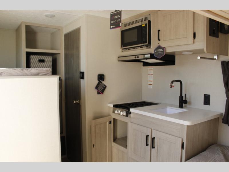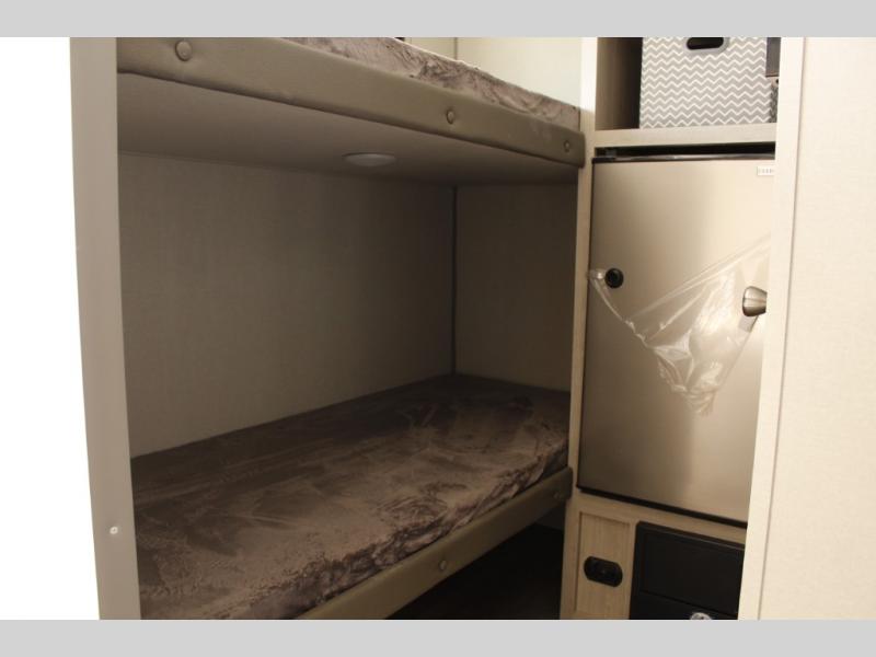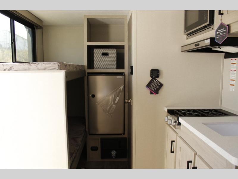 Lightweight camping is easier than you think with this travel trailer in tow! The front 54" x 74" queen bed will provide a great night's rest each night, while the little ones or your guests take the bunk beds. There is a handy shelf above the front bed for your belongings plus additional bedroom storage. A private bath includes a 24" x 32" shower and a toilet with a mirror behind it so you can freshen up each day. You'll also find a two burner cooktop and microwave oven to make meals each day plus a 3.3 cu. ft. 12V refrigerator for food storage!