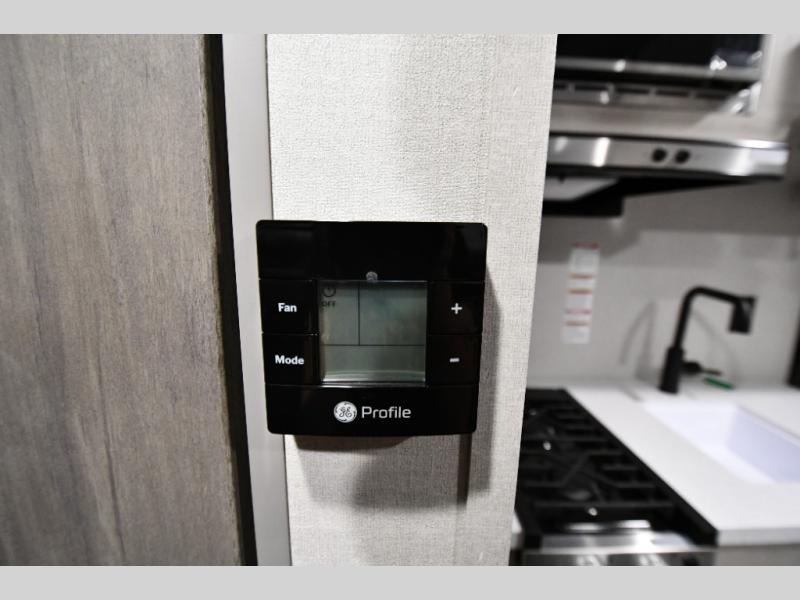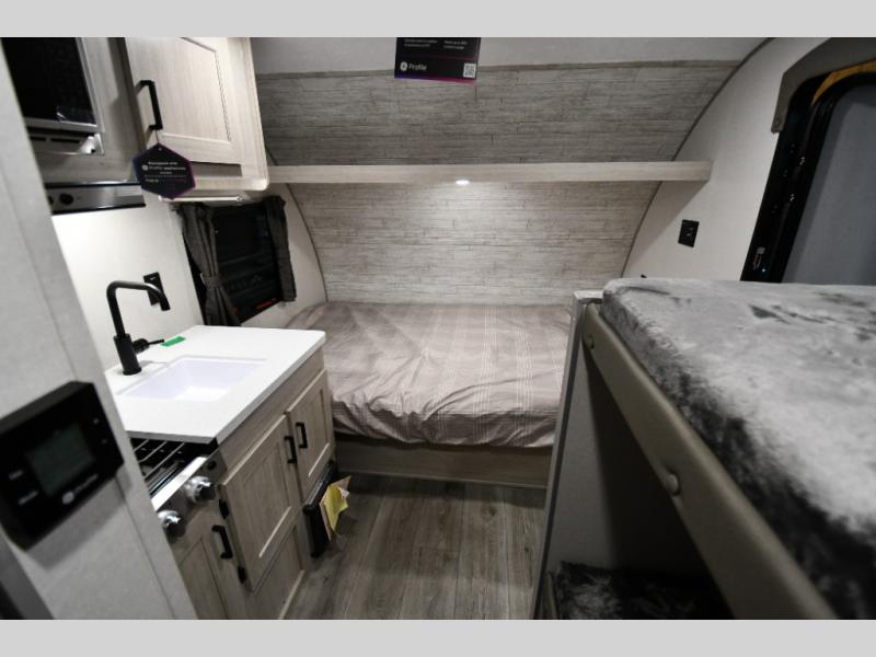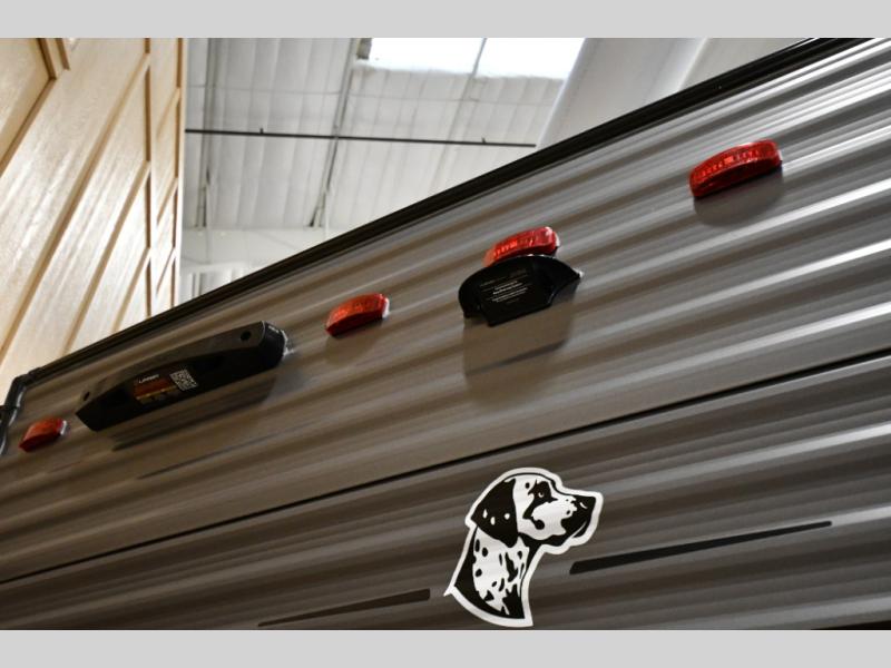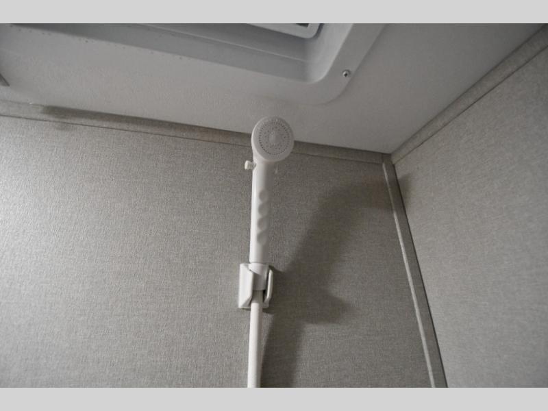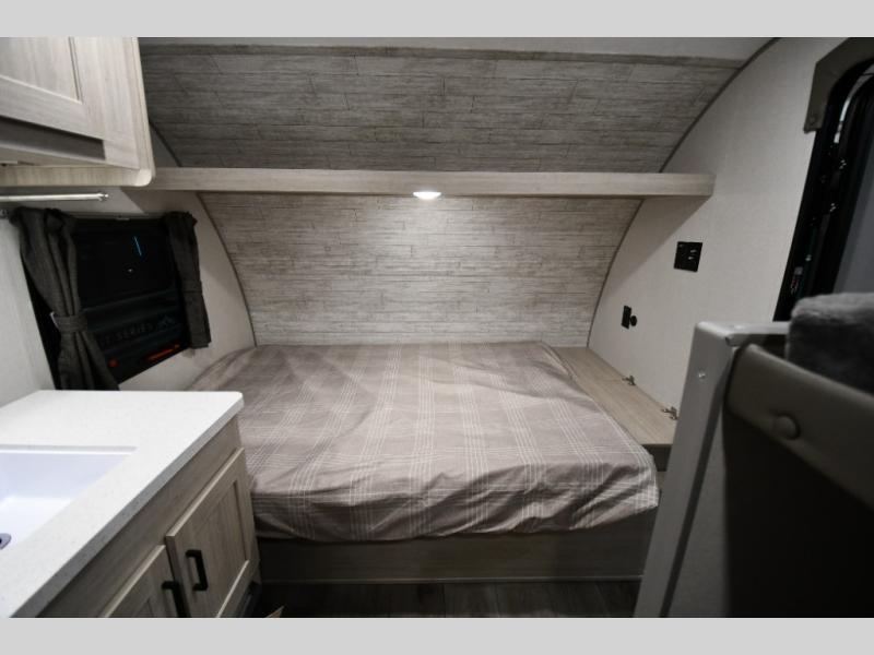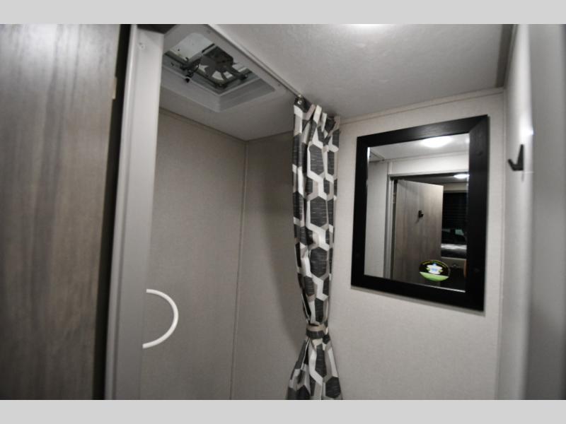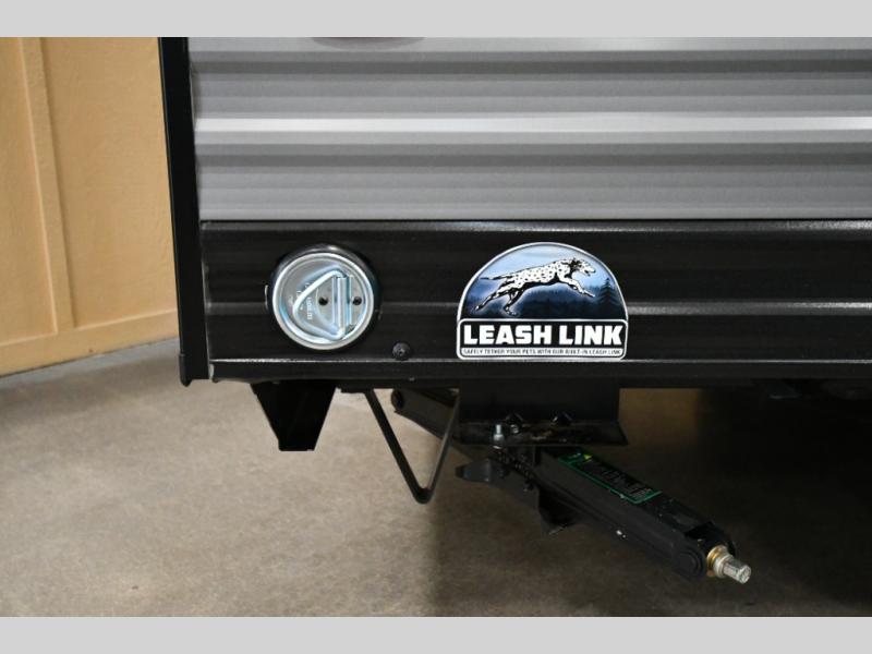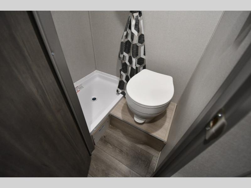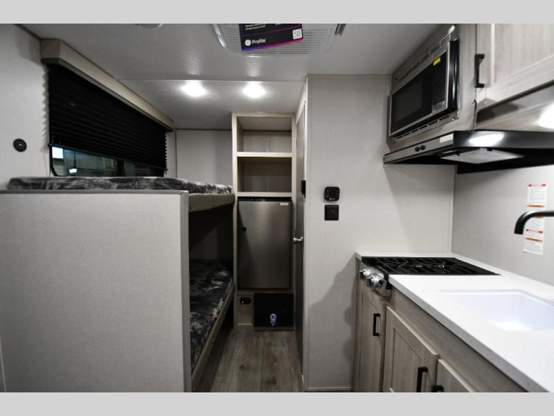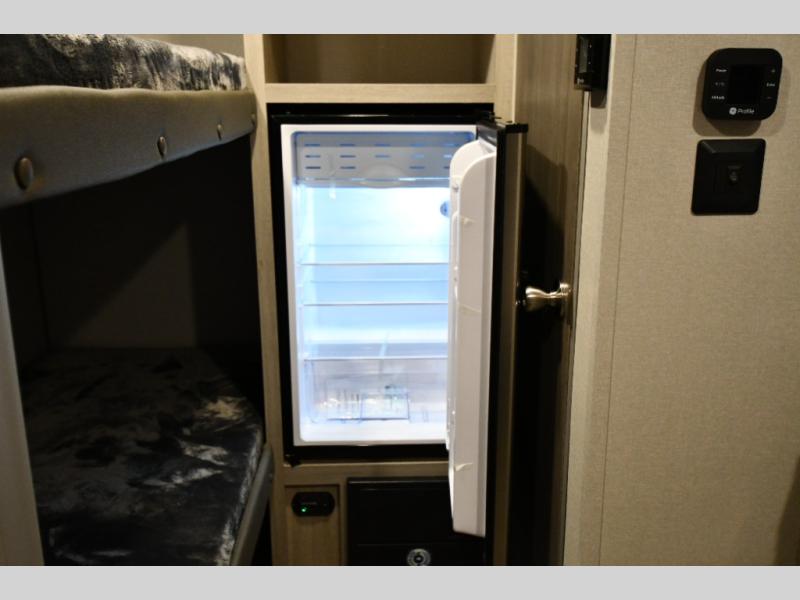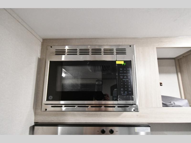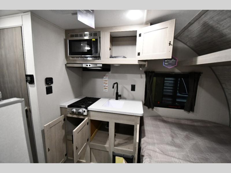 Lightweight camping is easier than you think with this travel trailer in tow! The front 54" x 74" bed will provide a great night's rest each night, while the little ones or your guests take the bunk beds. There is a handy shelf above the front bed for your belongings plus additional bedroom storage. A private bath includes a 24" x 32" shower and a toilet with a mirror behind it so you can freshen up each day. You'll also find a two burner cooktop and microwave oven to make meals each day plus a 3.3 cu. ft. 12V refrigerator for food storage!