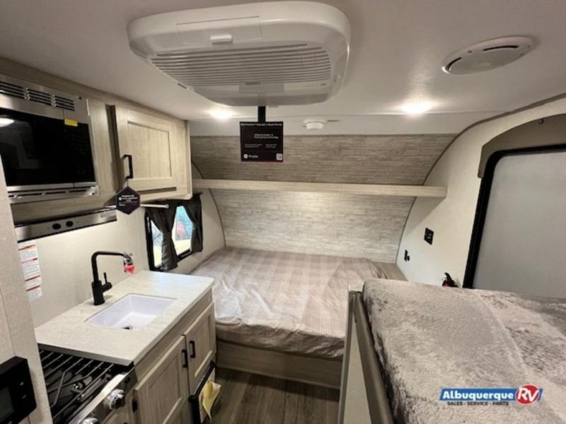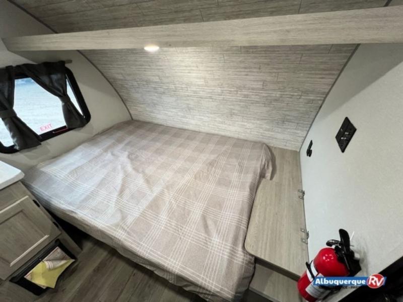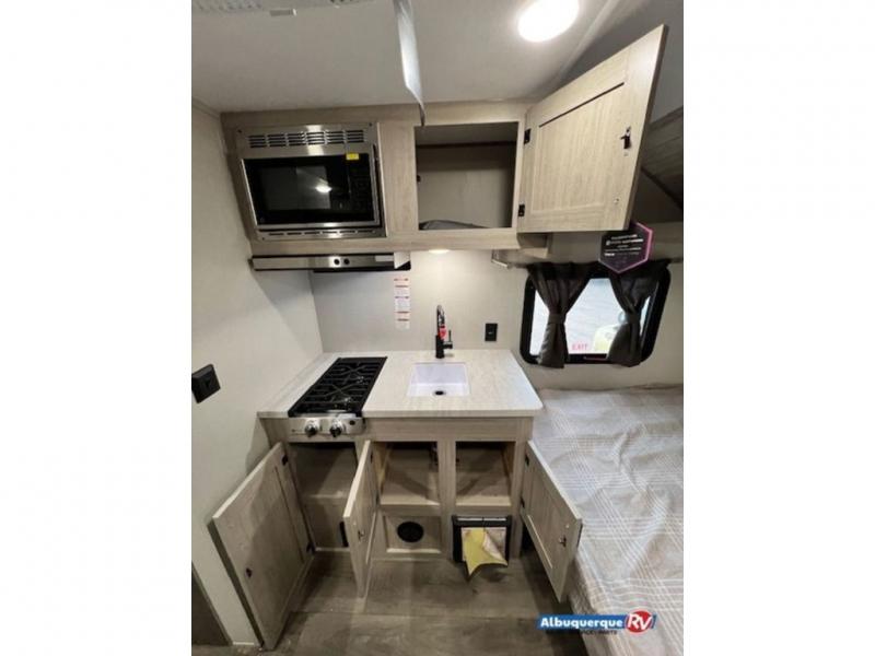 Lightweight camping is easier than you think with this travel trailer in tow! The front 54" x 74" bed will provide a great night's rest each night, while the little ones or your guests take the bunk beds. There is a handy shelf above the front bed for your belongings plus additional bedroom storage. A private bath includes a 24" x 32" shower and a toilet with a mirror behind it so you can freshen up each day. You'll also find a two burner cooktop and microwave oven to make meals each day plus a 3.3 cu. ft. 12V refrigerator for food storage!