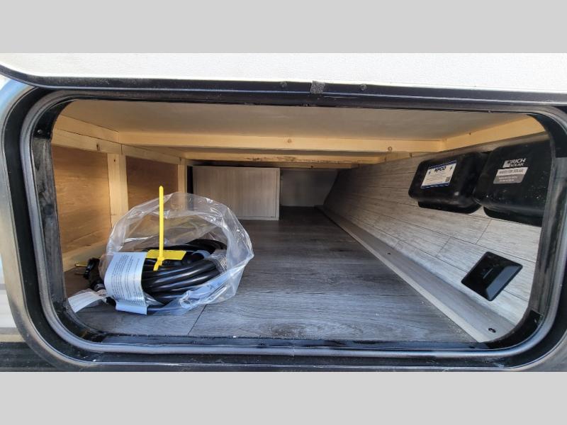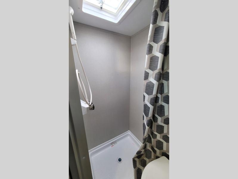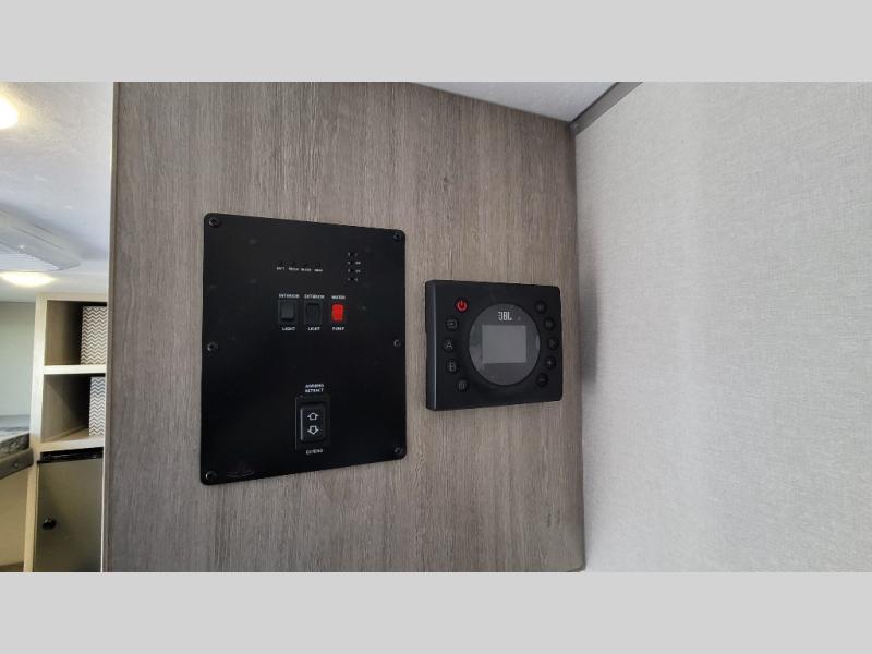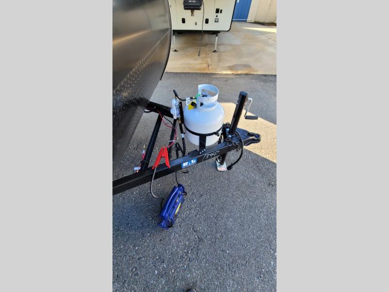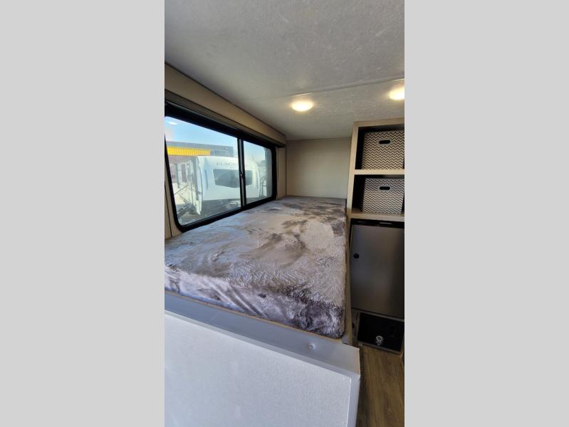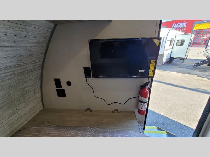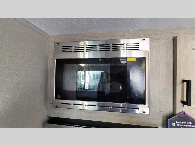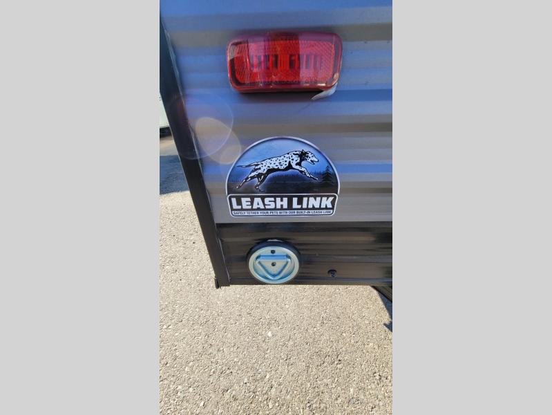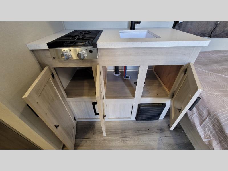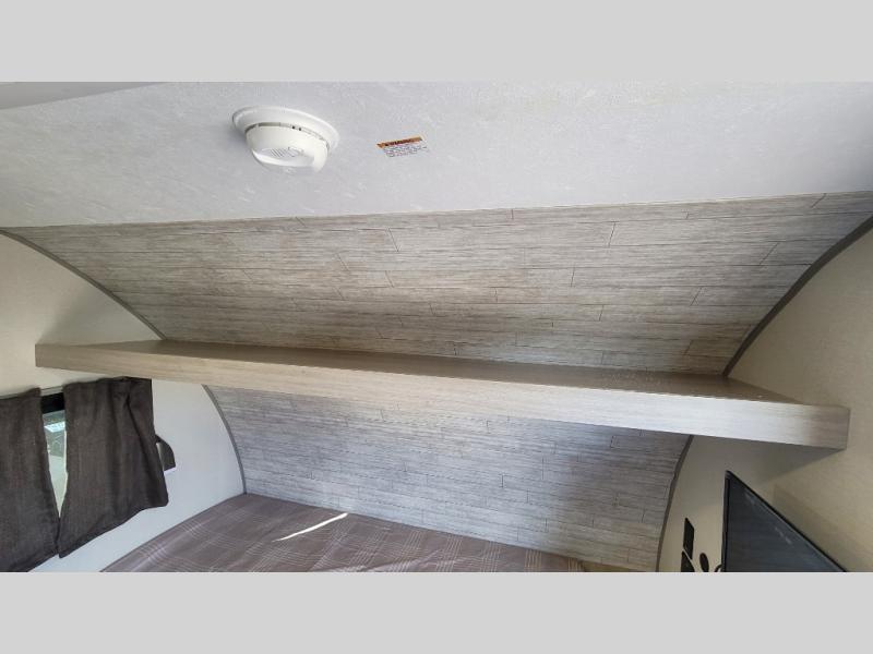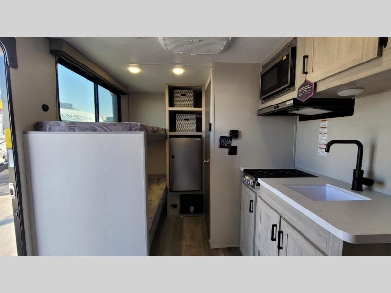 Lightweight camping is easier than you think with this travel trailer in tow! The front 54" x 74" bed will provide a great night's rest each night, while the little ones or your guests take the bunk beds. There is a handy shelf above the front bed for your belongings plus additional bedroom storage. A private bath includes a 24" x 32" shower and a toilet with a mirror behind it so you can freshen up each day. You'll also find a two burner cooktop and microwave oven to make meals each day plus a 3.3 cu. ft. 12V refrigerator for food storage!