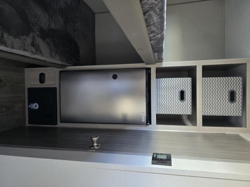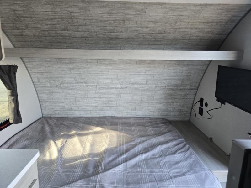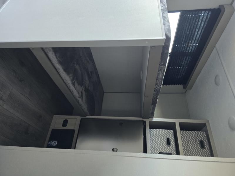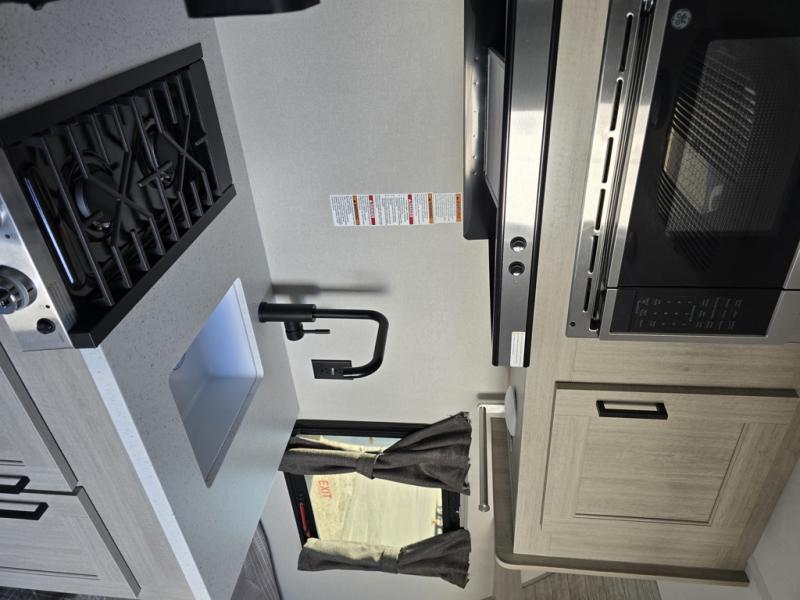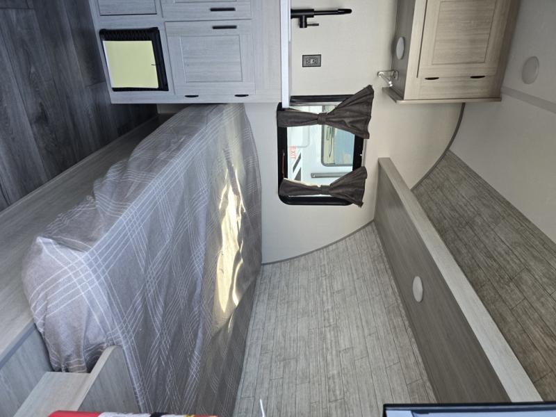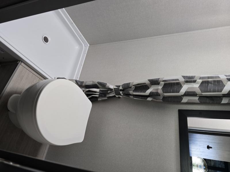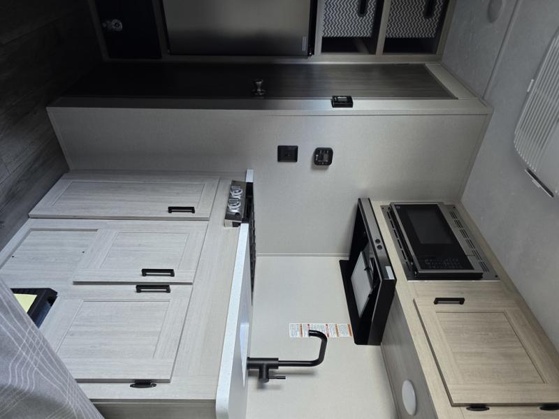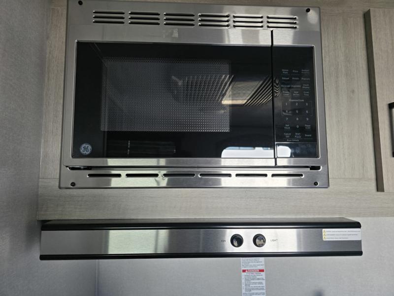 Lightweight camping is easier than you think with this travel trailer in tow! The front 54" x 74" bed will provide a great night's rest each night, while the little ones or your guests take the bunk beds. There is a handy shelf above the front bed for your belongings plus additional bedroom storage. A private bath includes a 24" x 32" shower and a toilet with a mirror behind it so you can freshen up each day. You'll also find a two burner cooktop and microwave oven to make meals each day plus a 3.3 cu. ft. 12V refrigerator for food storage!