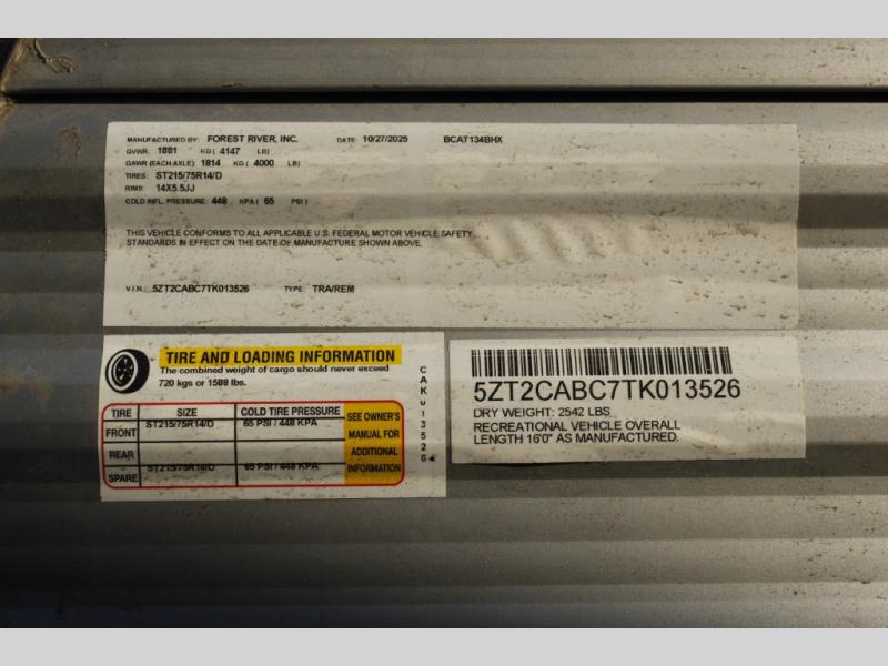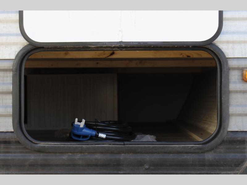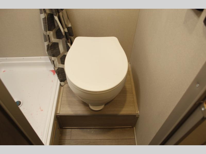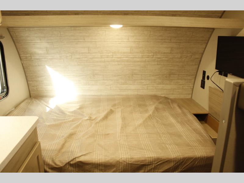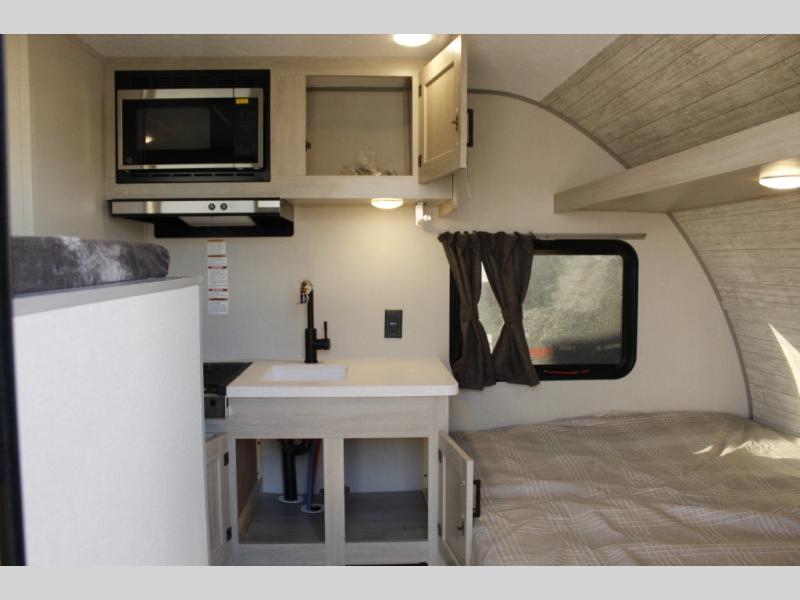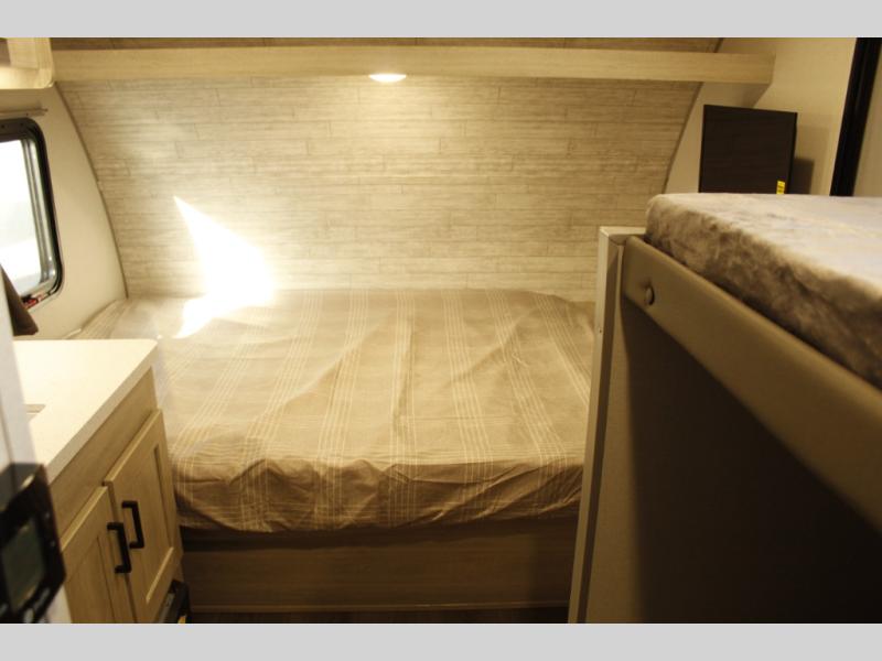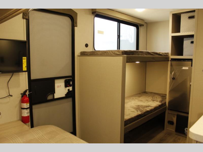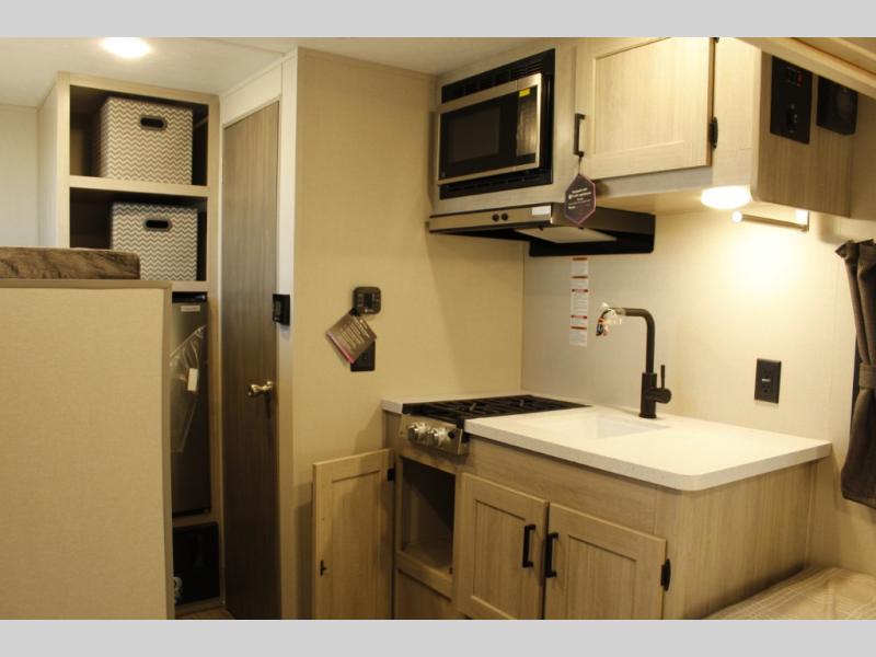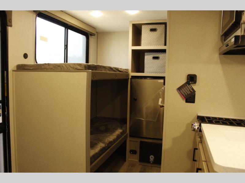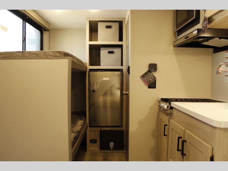 Lightweight camping is easier than you think with this travel trailer in tow! The front 54" x 74" bed will provide a great night's rest each night, while the little ones or your guests take the bunk beds. There is a handy shelf above the front bed for your belongings plus additional bedroom storage. A private bath includes a 24" x 32" shower and a toilet with a mirror behind it so you can freshen up each day. You'll also find a two burner cooktop and microwave oven to make meals each day plus a 3.3 cu. ft. 12V refrigerator for food storage!