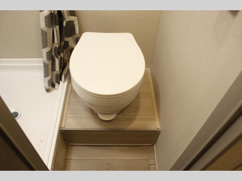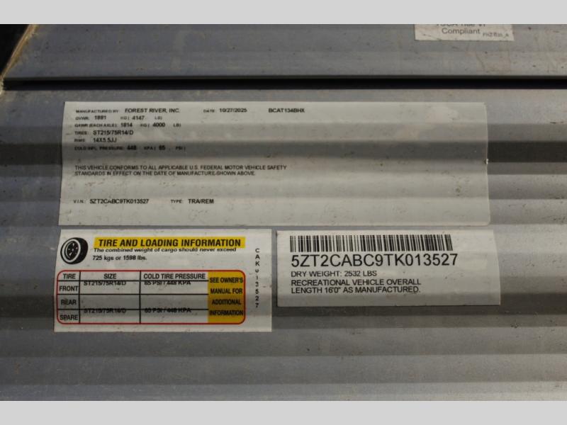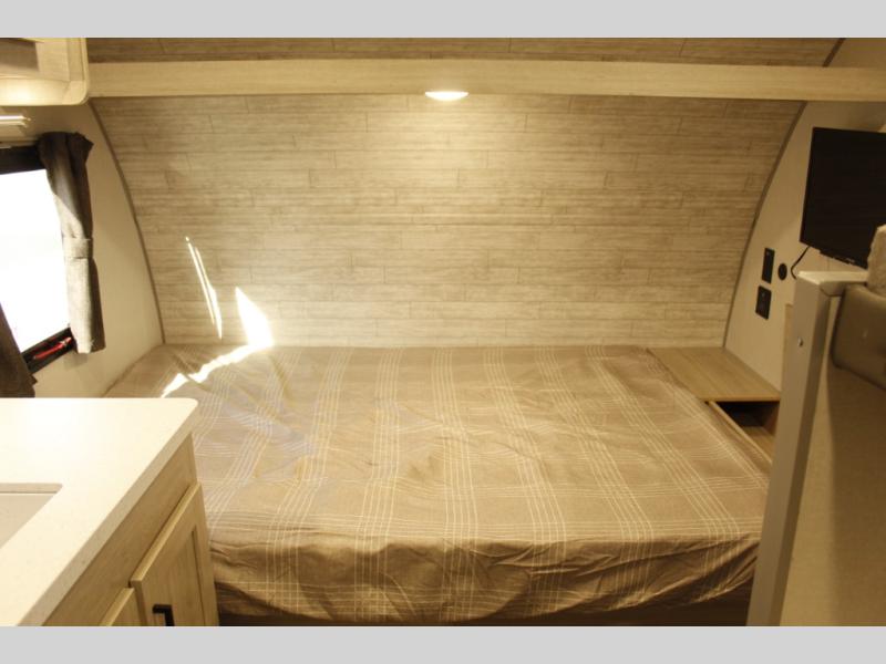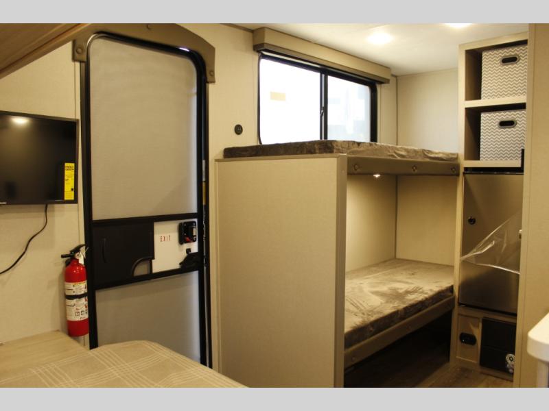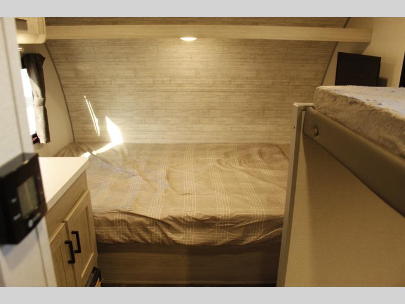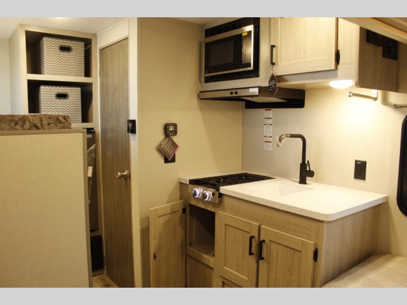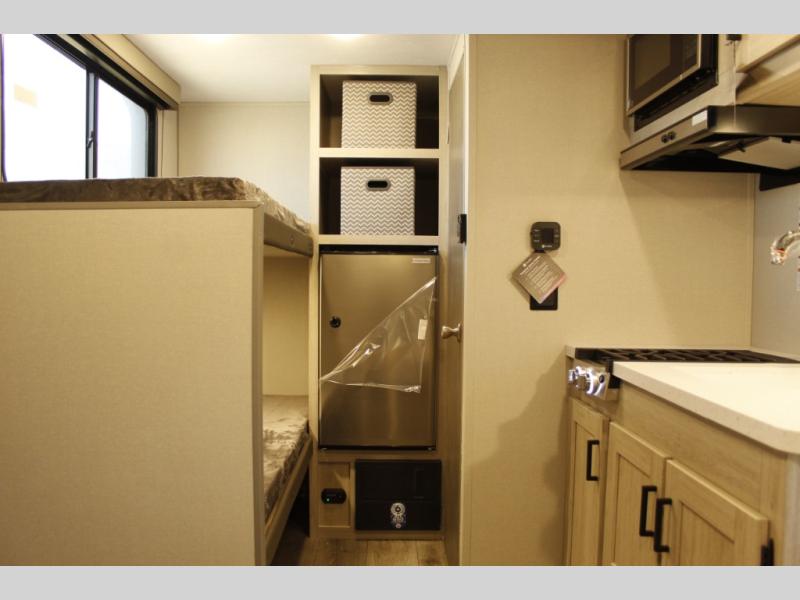 Lightweight camping is easier than you think with this travel trailer in tow! The front 54" x 74" bed will provide a great night's rest each night, while the little ones or your guests take the bunk beds. There is a handy shelf above the front bed for your belongings plus additional bedroom storage. A private bath includes a 24" x 32" shower and a toilet with a mirror behind it so you can freshen up each day. You'll also find a two burner cooktop and microwave oven to make meals each day plus a 3.3 cu. ft. 12V refrigerator for food storage!