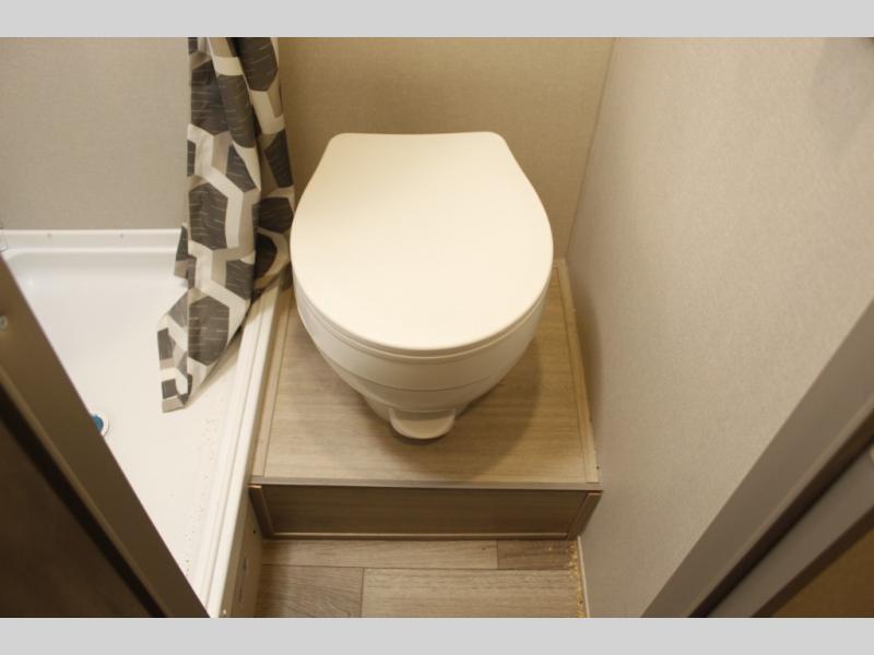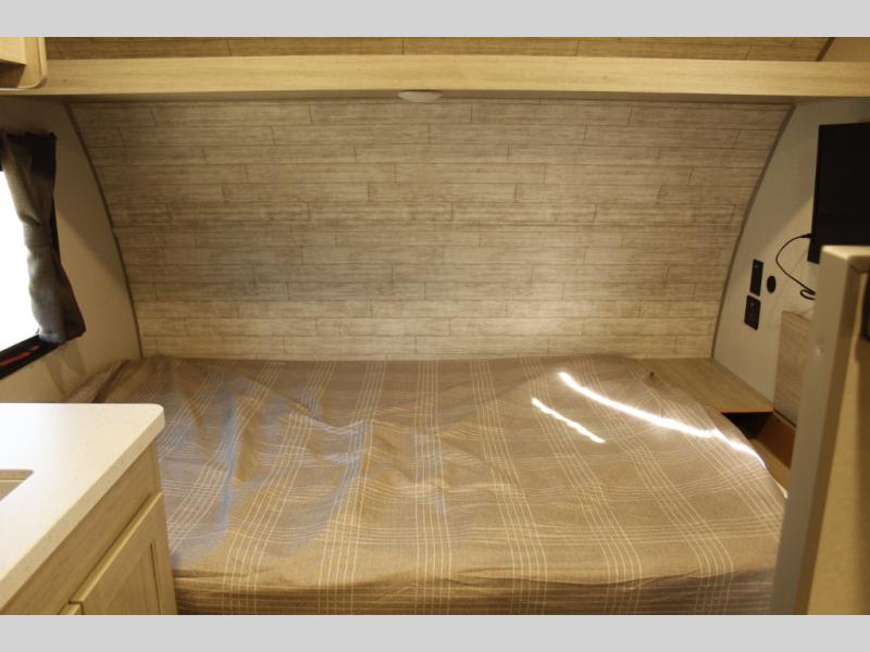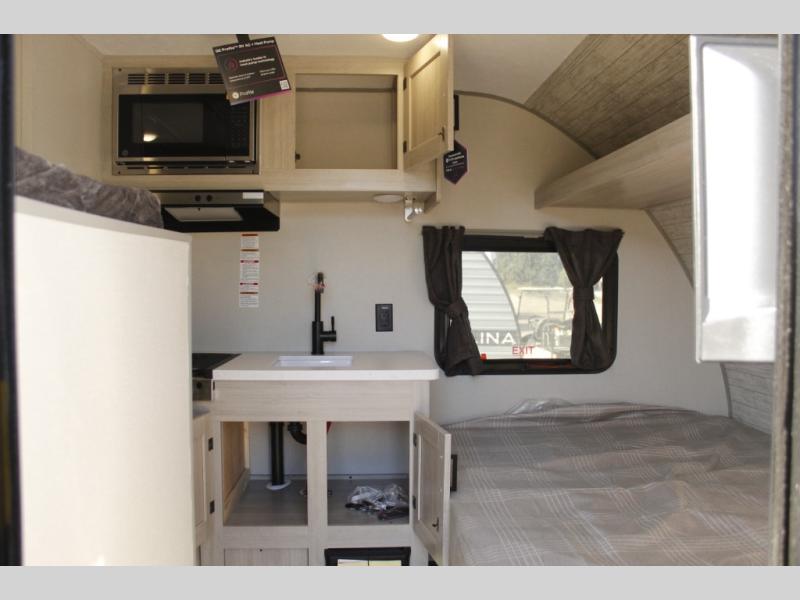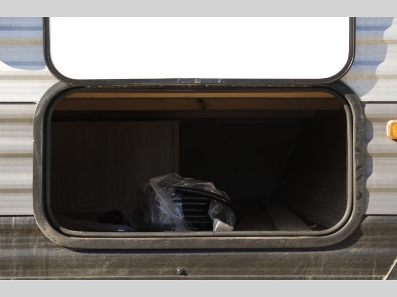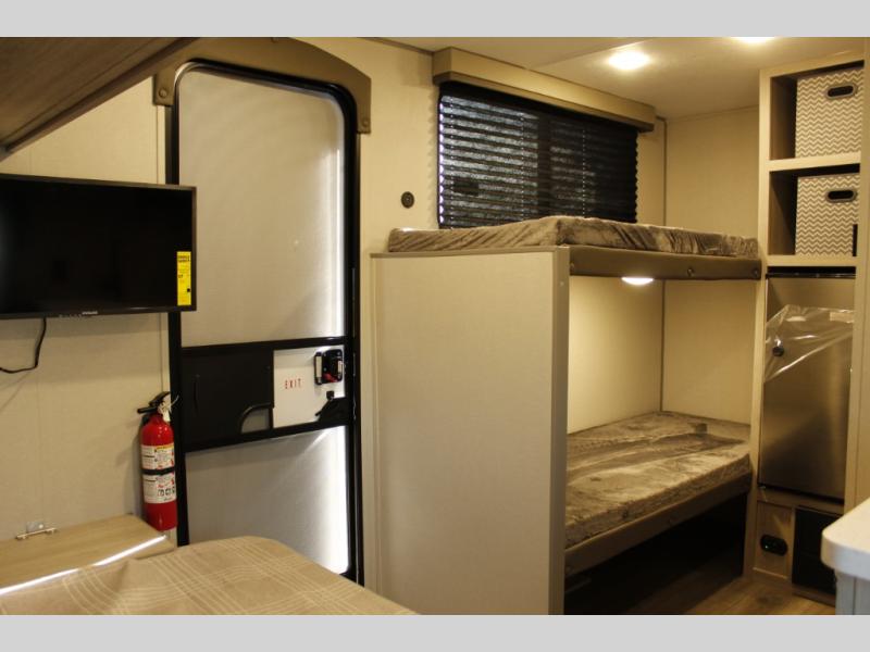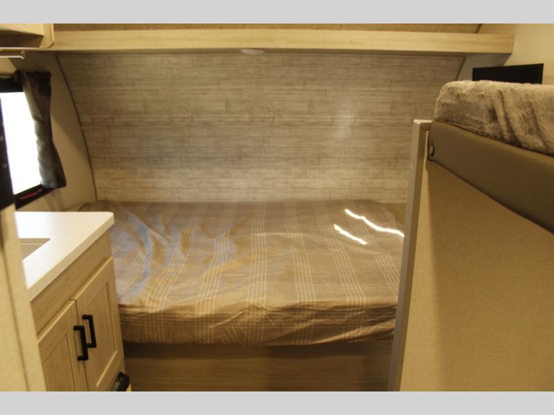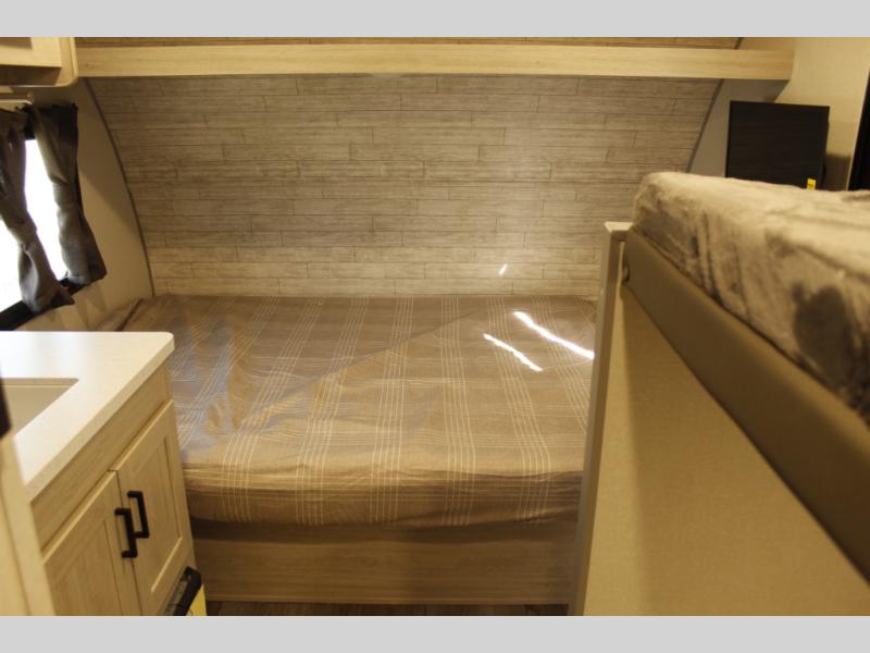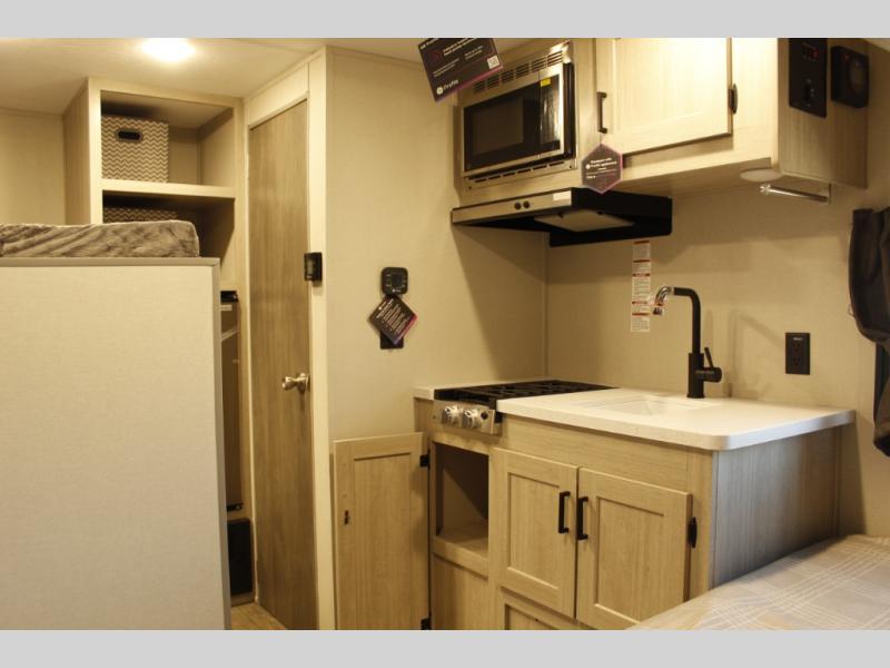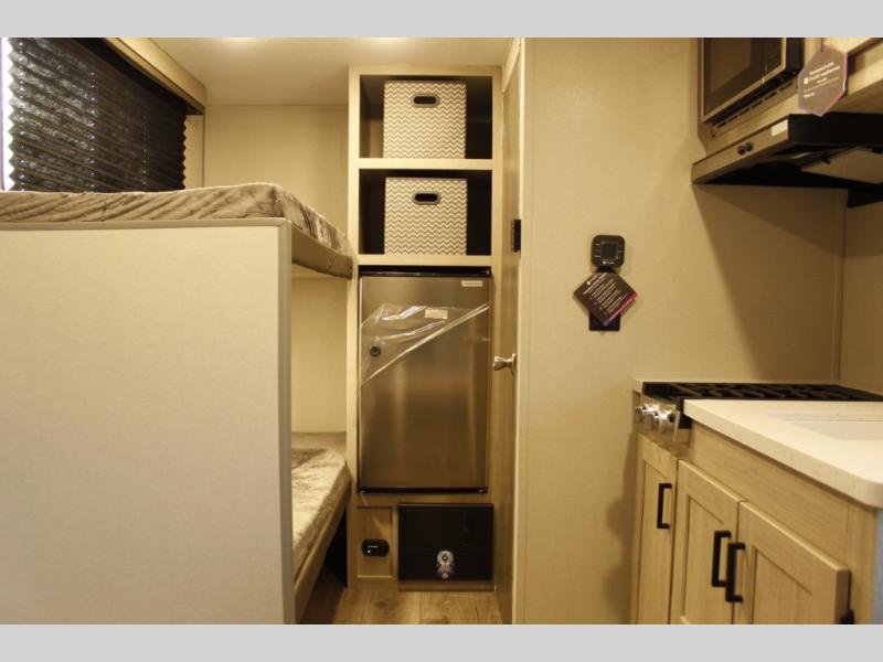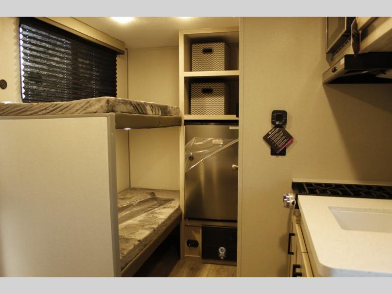 Lightweight camping is easier than you think with this travel trailer in tow! The front 54" x 74" bed will provide a great night's rest each night, while the little ones or your guests take the bunk beds. There is a handy shelf above the front bed for your belongings plus additional bedroom storage. A private bath includes a 24" x 32" shower and a toilet with a mirror behind it so you can freshen up each day. You'll also find a two burner cooktop and microwave oven to make meals each day plus a 3.3 cu. ft. 12V refrigerator for food storage!