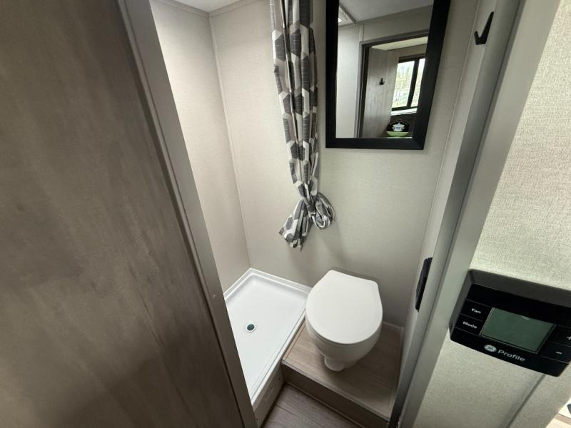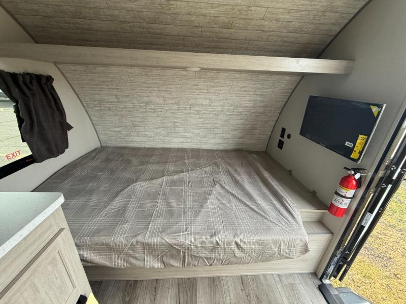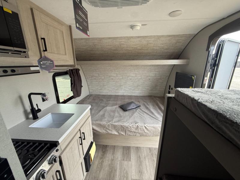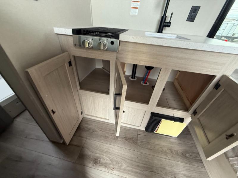 Lightweight camping is easier than you think with this travel trailer in tow! The front 54" x 74" bed will provide a great night's rest each night, while the little ones or your guests take the bunk beds. There is a handy shelf above the front bed for your belongings plus additional bedroom storage. A private bath includes a 24" x 32" shower and a toilet with a mirror behind it so you can freshen up each day. You'll also find a two burner cooktop and microwave oven to make meals each day plus a 3.3 cu. ft. 12V refrigerator for food storage!
