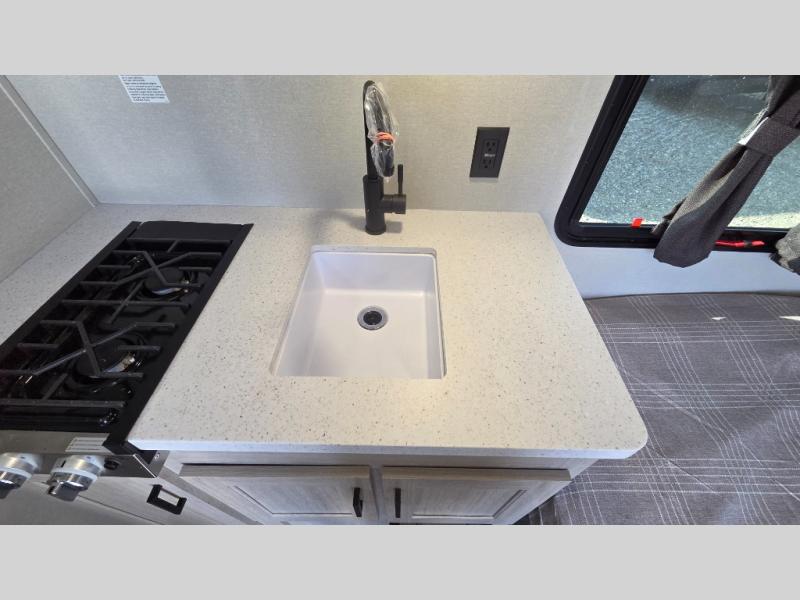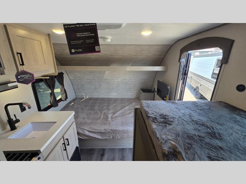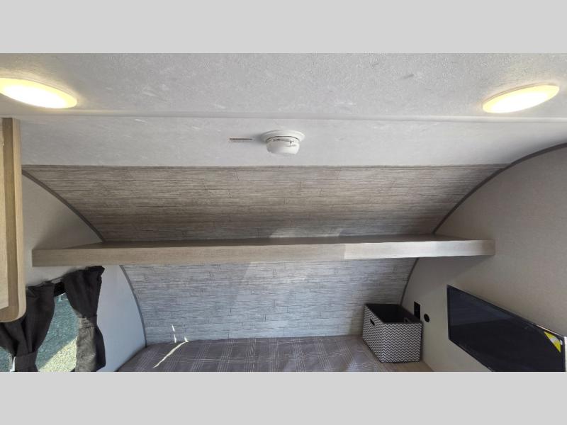 Lightweight camping is easier than you think with this travel trailer in tow! The front 54" x 74" bed will provide a great night's rest each night, while the little ones or your guests take the bunk beds. There is a handy shelf above the front bed for your belongings plus additional bedroom storage. A private bath includes a 24" x 32" shower and a toilet with a mirror behind it so you can freshen up each day. You'll also find a two burner cooktop and microwave oven to make meals each day plus a 3.3 cu. ft. 12V refrigerator for food storage!