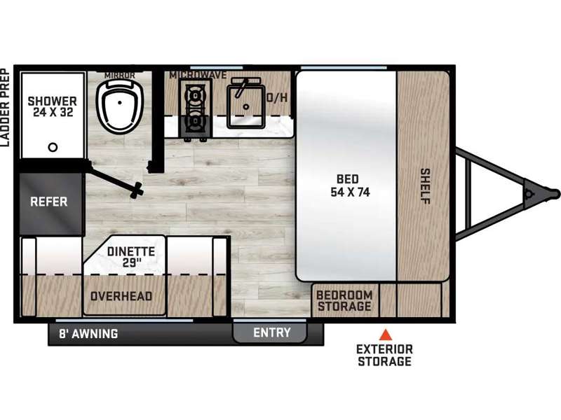 Lightweight camping is easier than you think with this travel trailer in tow! The front 54" x 74" queen bed will provide a great night's rest each night, while your overnight guest takes the booth dinette. There is a handy shelf above the front bed for your belongings plus additional bedroom storage. A private bath includes a 24" x 32" shower and a toilet with a mirror behind it so you can freshen up each day. You'll also find a two burner cooktop and microwave oven to make meals each day plus a 3.3 cu. ft. 12V refrigerator for food storage!