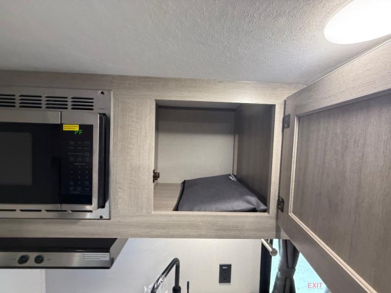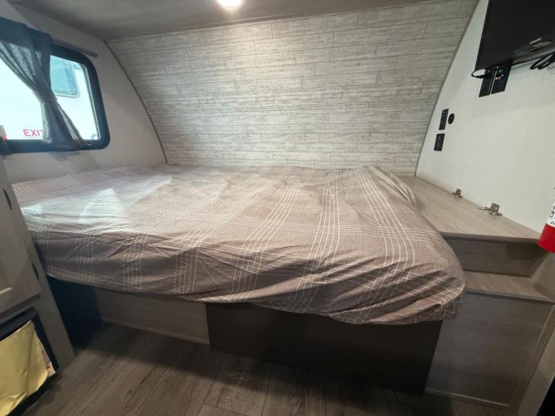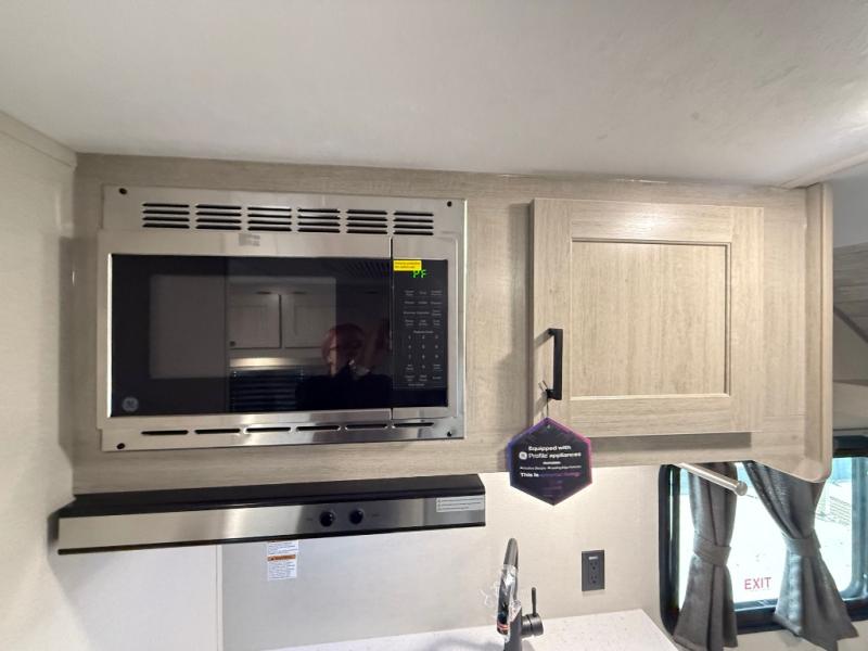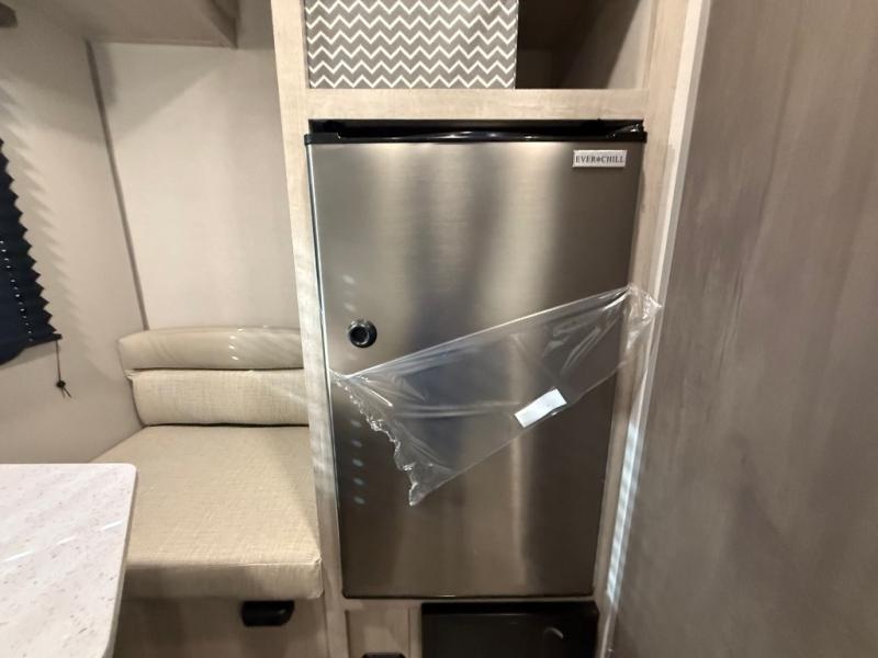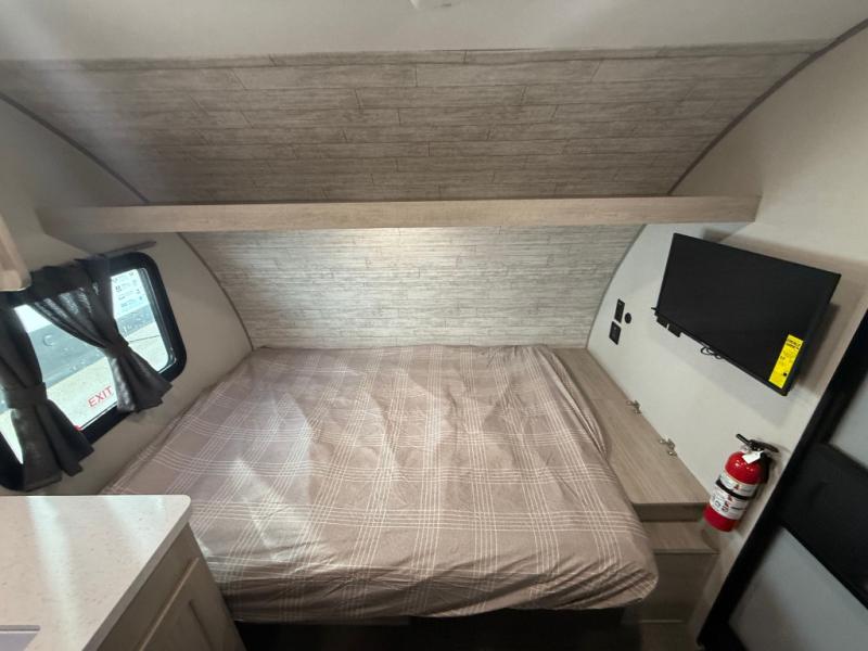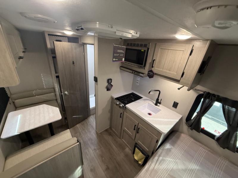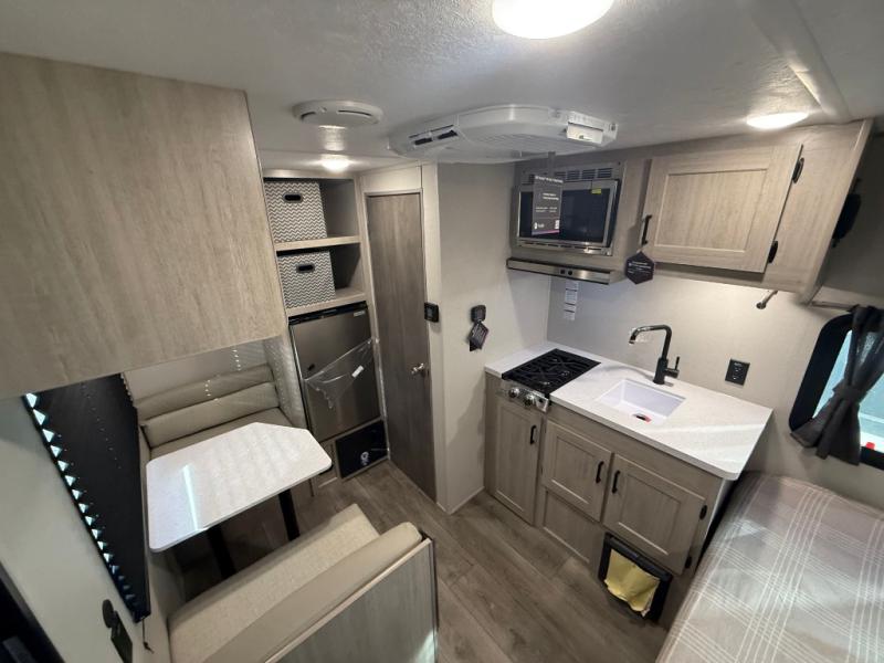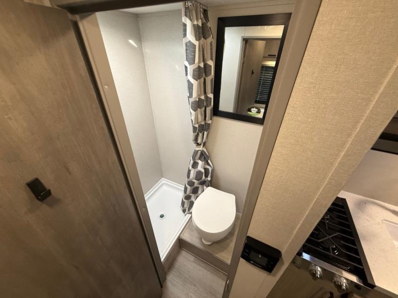 Lightweight camping is easier than you think with this travel trailer in tow! The front 54" x 74" queen bed will provide a great night's rest each night, while your overnight guest takes the booth dinette. There is a handy shelf above the front bed for your belongings plus additional bedroom storage. A private bath includes a 24" x 32" shower and a toilet with a mirror behind it so you can freshen up each day. You'll also find a two burner cooktop and microwave oven to make meals each day plus a 3.3 cu. ft. 12V refrigerator for food storage!