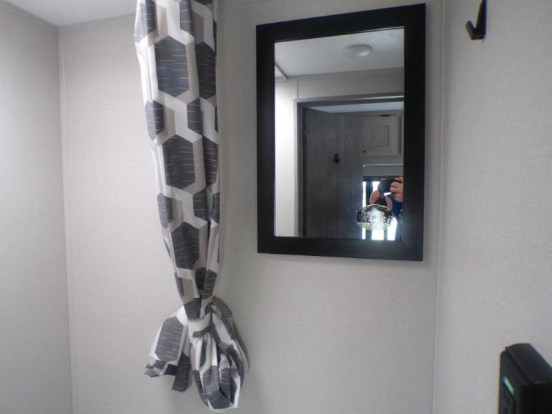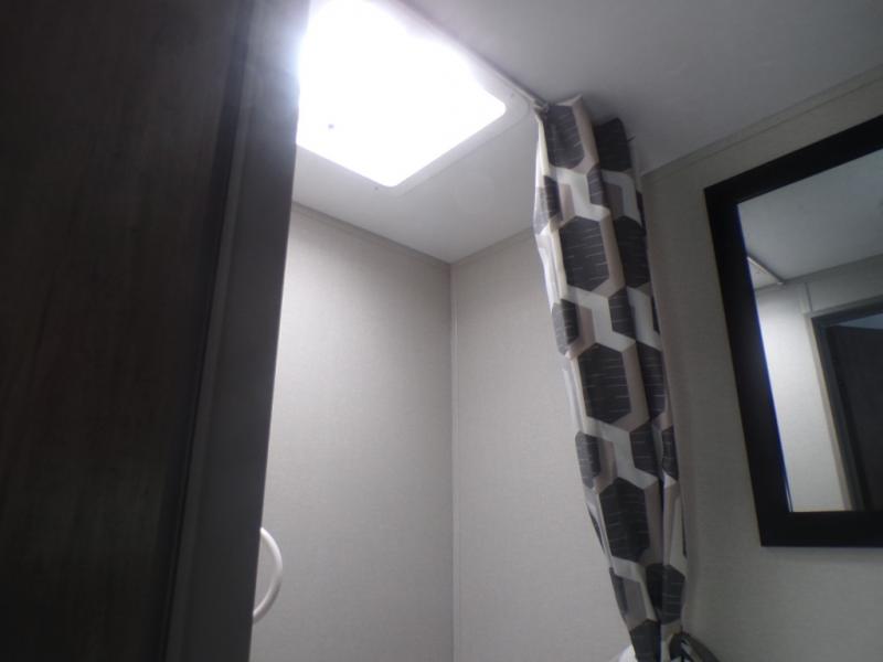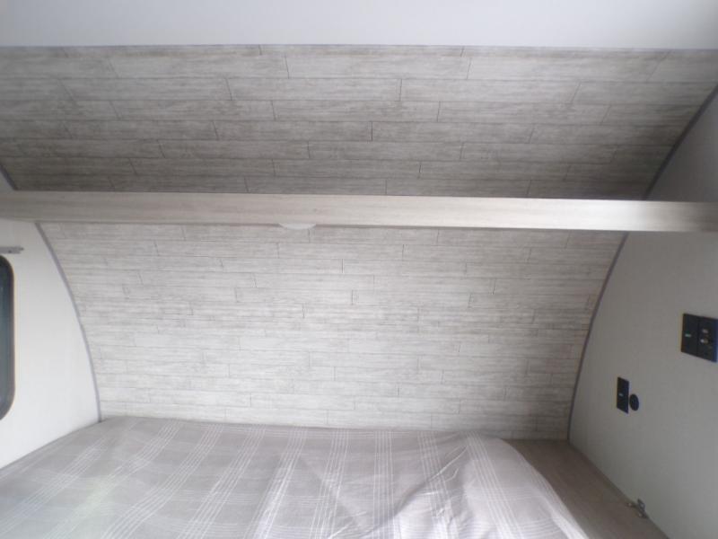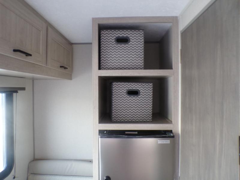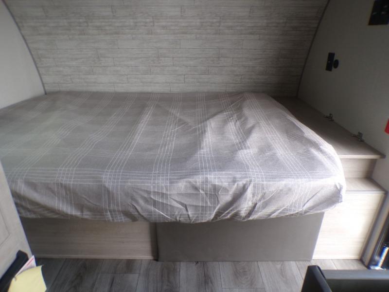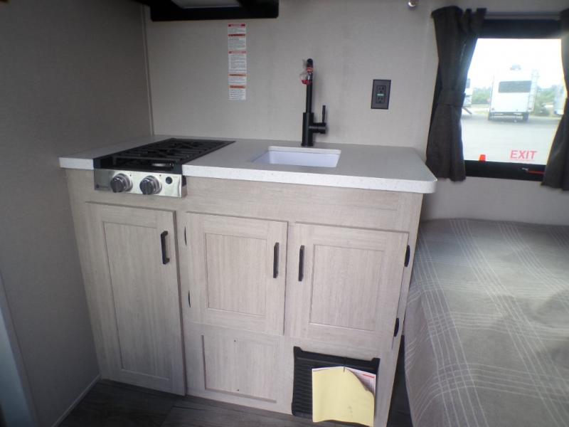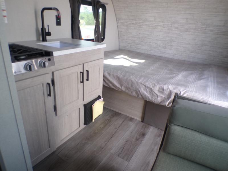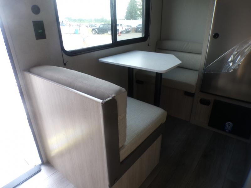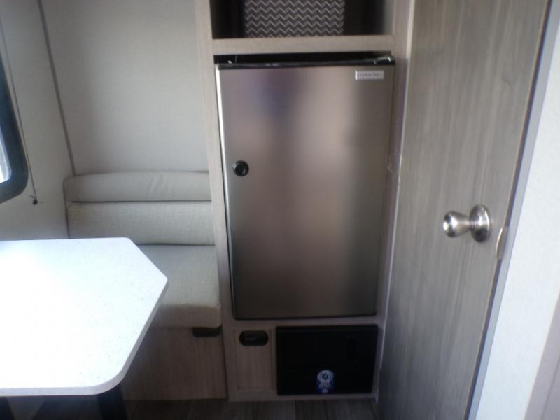 Lightweight camping is easier than you think with this travel trailer in tow! The front 54" x 74" queen bed will provide a great night's rest each night, while your overnight guest takes the booth dinette. There is a handy shelf above the front bed for your belongings plus additional bedroom storage. A private bath includes a 24" x 32" shower and a toilet with a mirror behind it so you can freshen up each day. You'll also find a two burner cooktop and microwave oven to make meals each day plus a 3.3 cu. ft. 12V refrigerator for food storage!