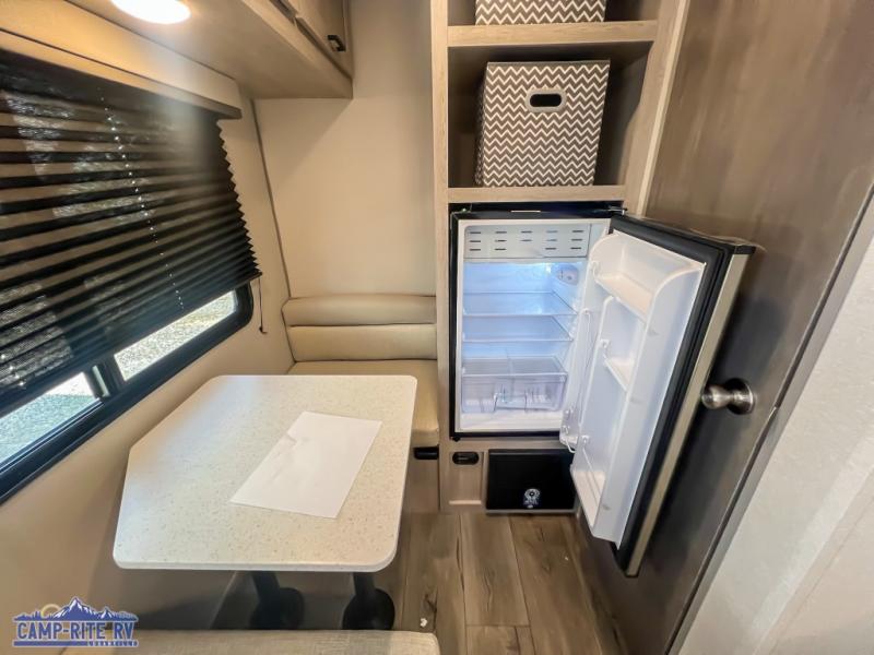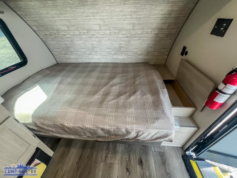 Lightweight camping is easier than you think with this travel trailer in tow! The front 54" x 74" queen bed will provide a great night's rest each night, while your overnight guest takes the booth dinette. There is a handy shelf above the front bed for your belongings plus additional bedroom storage. A private bath includes a 24" x 32" shower and a toilet with a mirror behind it so you can freshen up each day. You'll also find a two burner cooktop and microwave oven to make meals each day plus a 3.3 cu. ft. 12V refrigerator for food storage!