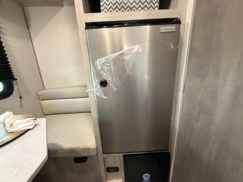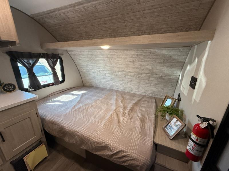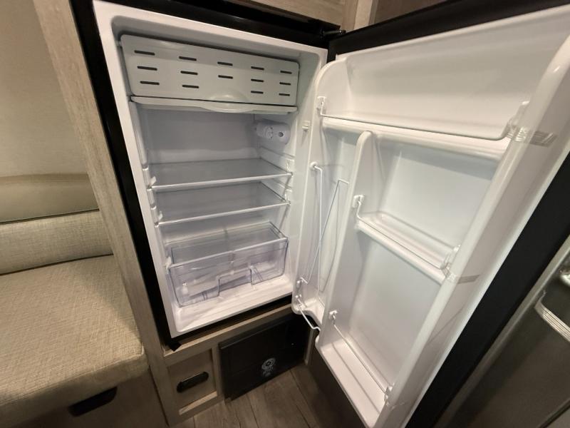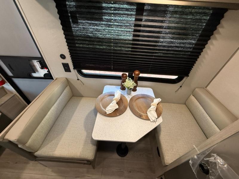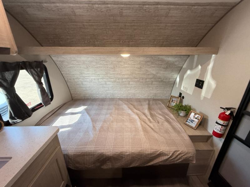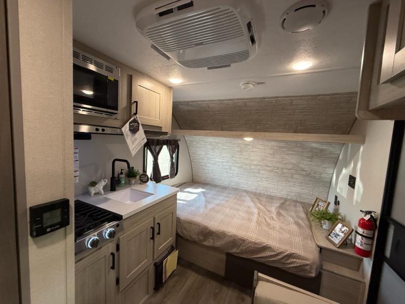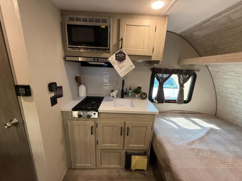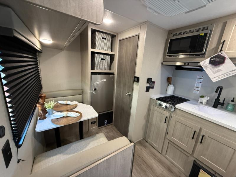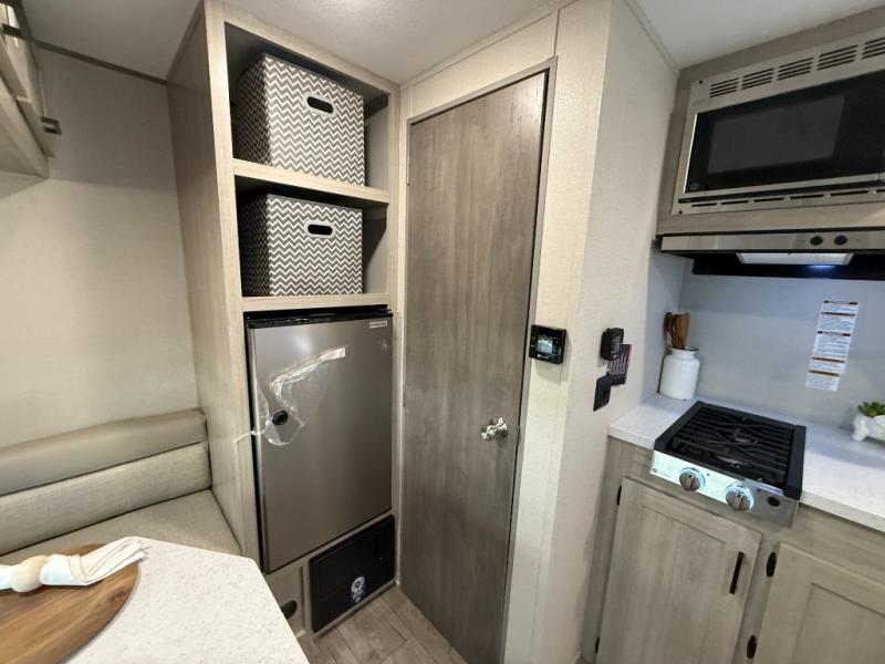 Lightweight camping is easier than you think with this travel trailer in tow! The front 54" x 74" queen bed will provide a great night's rest each night, while your overnight guest takes the booth dinette. There is a handy shelf above the front bed for your belongings plus additional bedroom storage. A private bath includes a 24" x 32" shower and a toilet with a mirror behind it so you can freshen up each day. You'll also find a two burner cooktop and microwave oven to make meals each day plus a 3.3 cu. ft. 12V refrigerator for food storage!