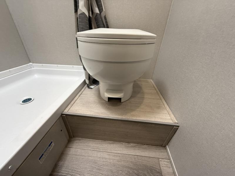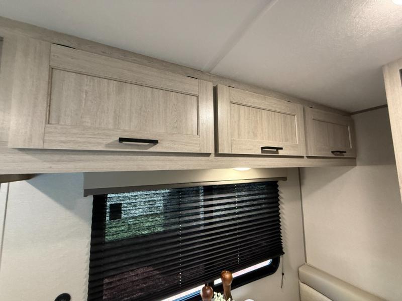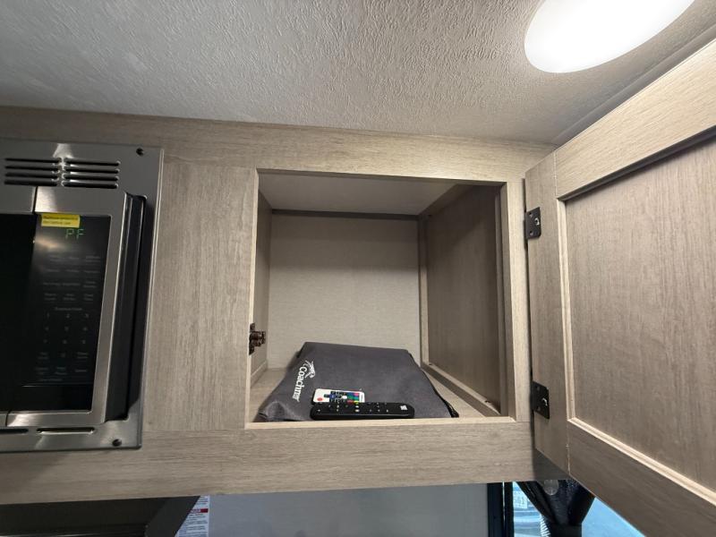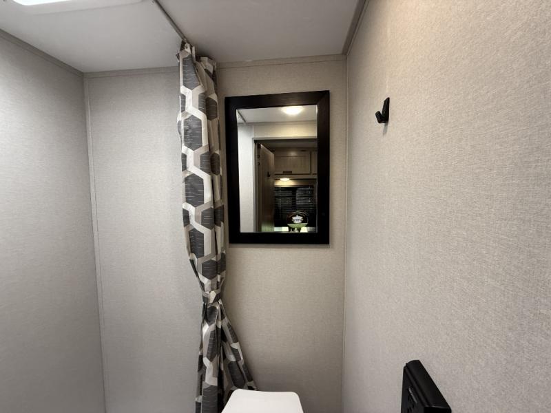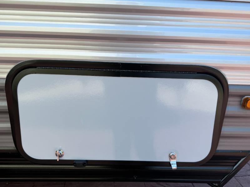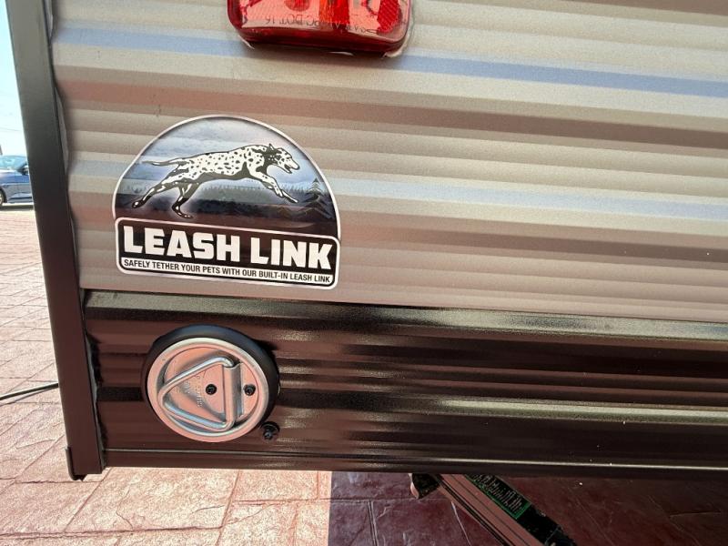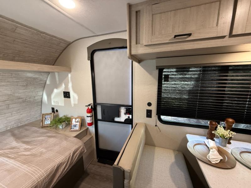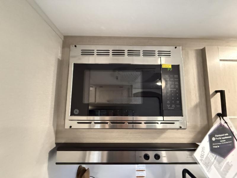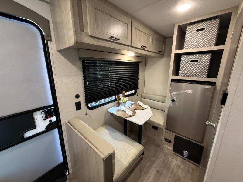 Lightweight camping is easier than you think with this travel trailer in tow! The front 54" x 74" queen bed will provide a great night's rest each night, while your overnight guest takes the booth dinette. There is a handy shelf above the front bed for your belongings plus additional bedroom storage. A private bath includes a 24" x 32" shower and a toilet with a mirror behind it so you can freshen up each day. You'll also find a two burner cooktop and microwave oven to make meals each day plus a 3.3 cu. ft. 12V refrigerator for food storage!