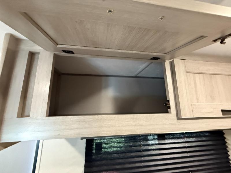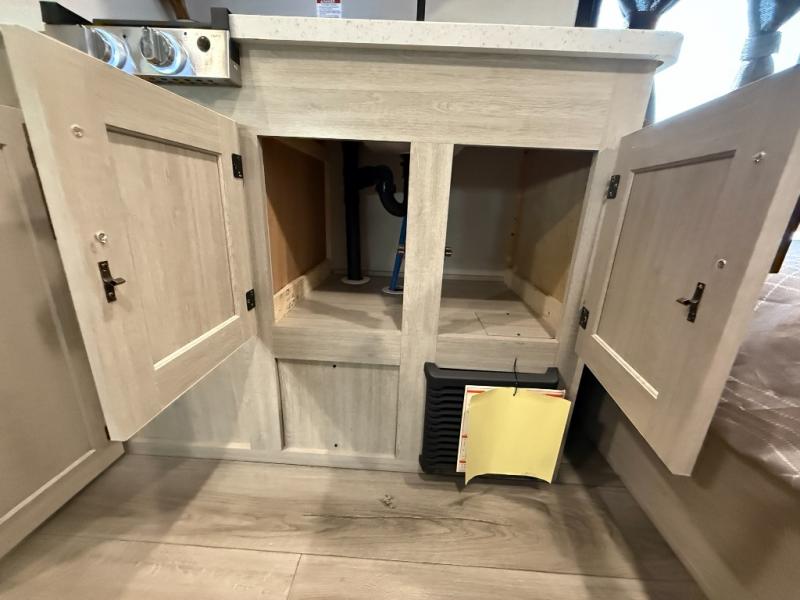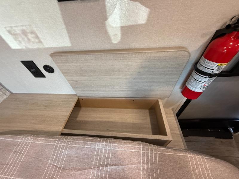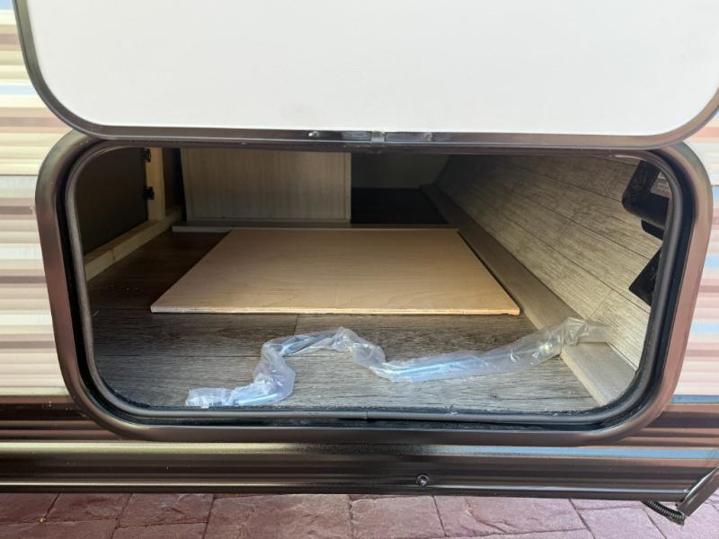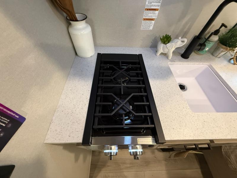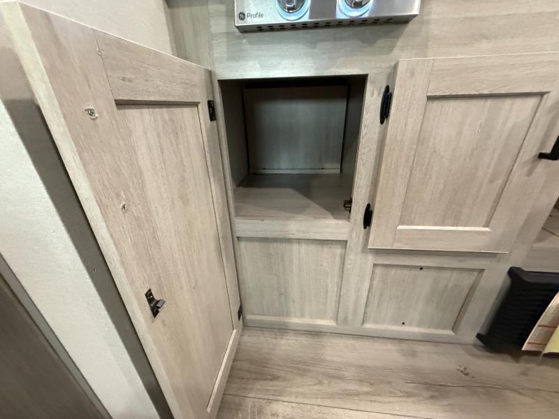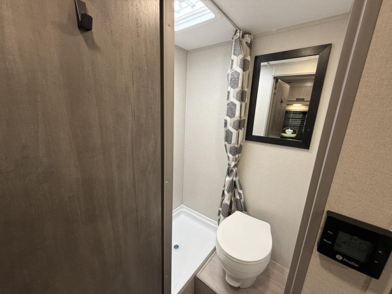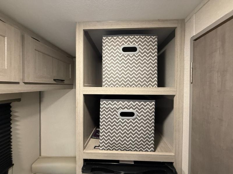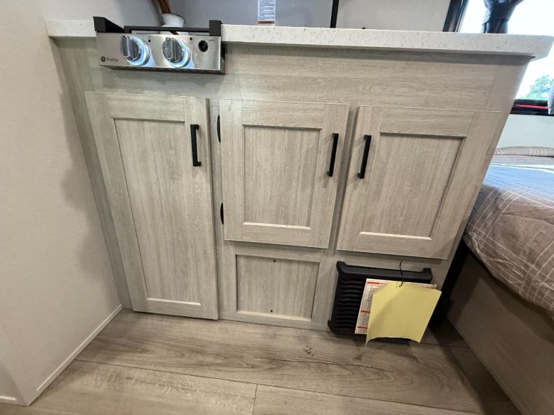 Lightweight camping is easier than you think with this travel trailer in tow! The front 54" x 74" queen bed will provide a great night's rest each night, while your overnight guest takes the booth dinette. There is a handy shelf above the front bed for your belongings plus additional bedroom storage. A private bath includes a 24" x 32" shower and a toilet with a mirror behind it so you can freshen up each day. You'll also find a two burner cooktop and microwave oven to make meals each day plus a 3.3 cu. ft. 12V refrigerator for food storage!