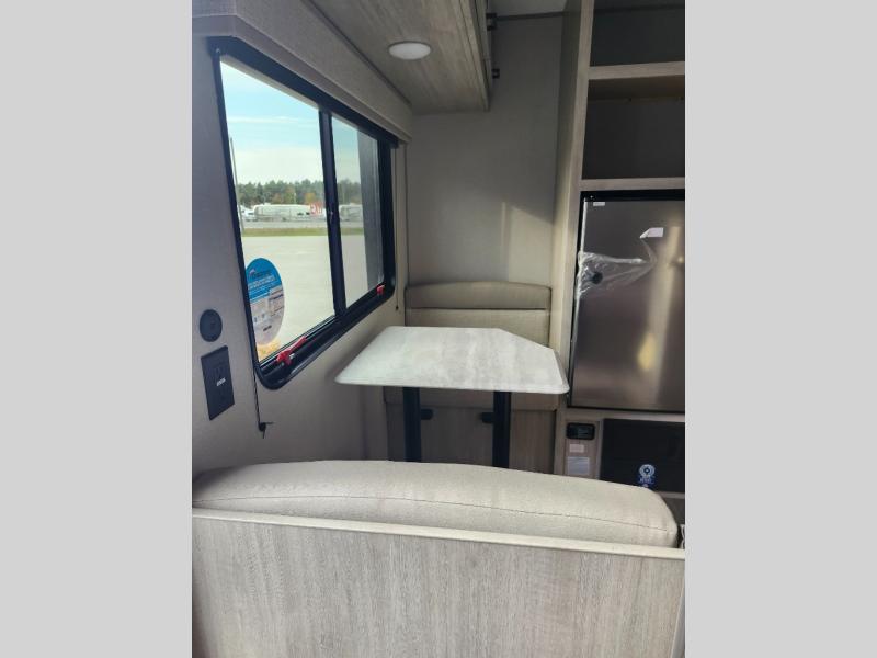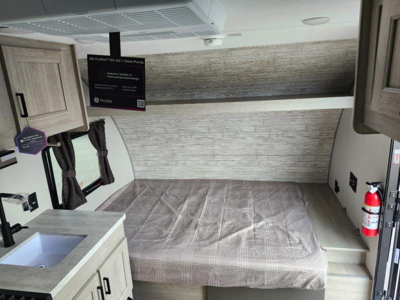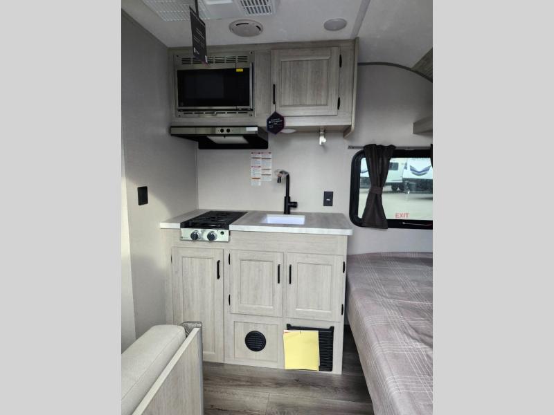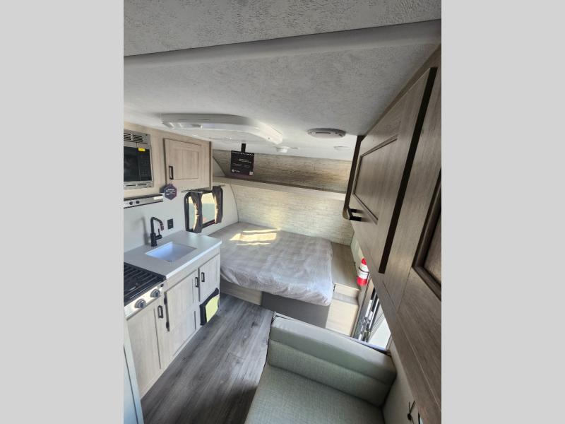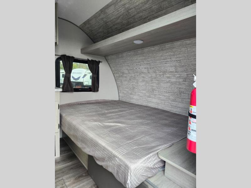 Lightweight camping is easier than you think with this travel trailer in tow! The front 54" x 74" queen bed will provide a great night's rest each night, while your overnight guest takes the booth dinette. There is a handy shelf above the front bed for your belongings plus additional bedroom storage. A private bath includes a 24" x 32" shower and a toilet with a mirror behind it so you can freshen up each day. You'll also find a two burner cooktop and microwave oven to make meals each day plus a 3.3 cu. ft. 12V refrigerator for food storage!