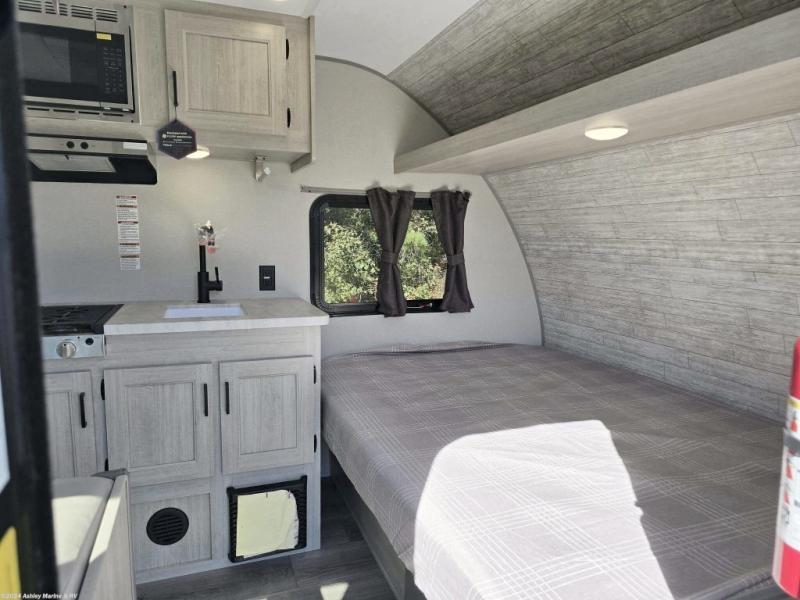 Lightweight camping is easier than you think with this travel trailer in tow! The front 54" x 74" queen bed will provide a great night's rest each night, while your overnight guest takes the booth dinette. There is a handy shelf above the front bed for your belongings plus additional bedroom storage. A private bath includes a 24" x 32" shower and a toilet with a mirror behind it so you can freshen up each day. You'll also find a two burner cooktop and microwave oven to make meals each day plus a 3.3 cu. ft. 12V refrigerator for food storage!