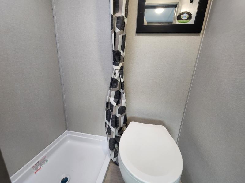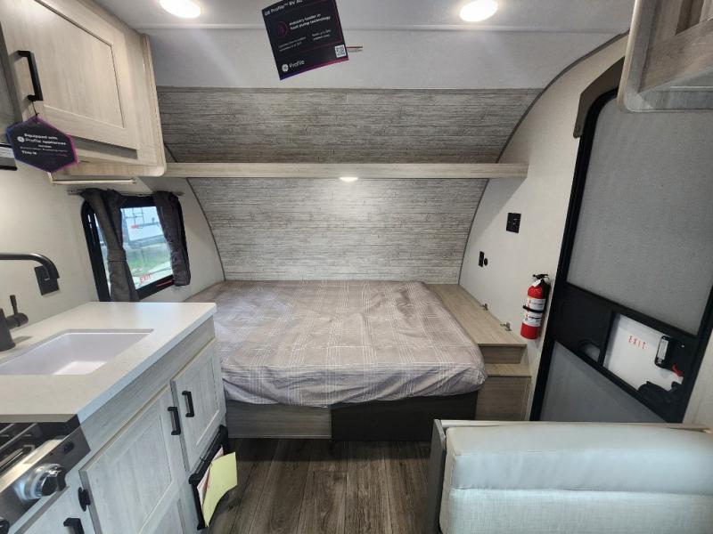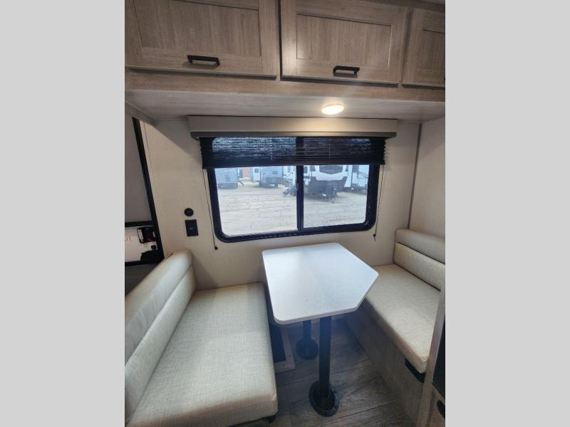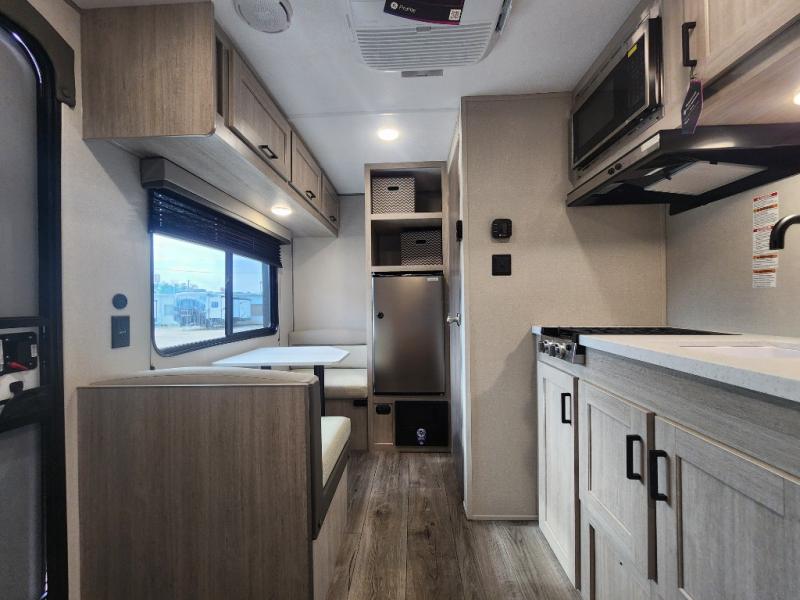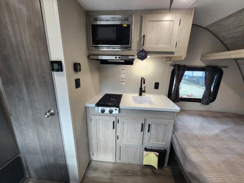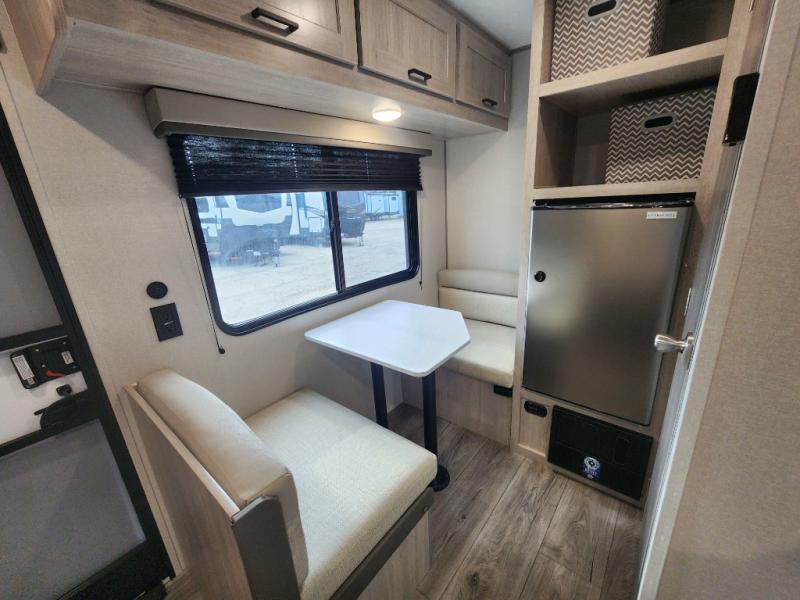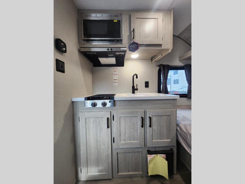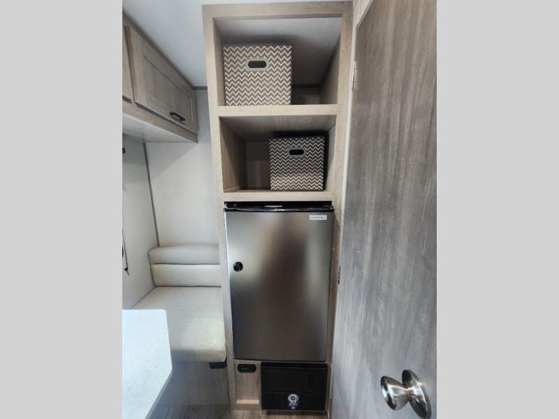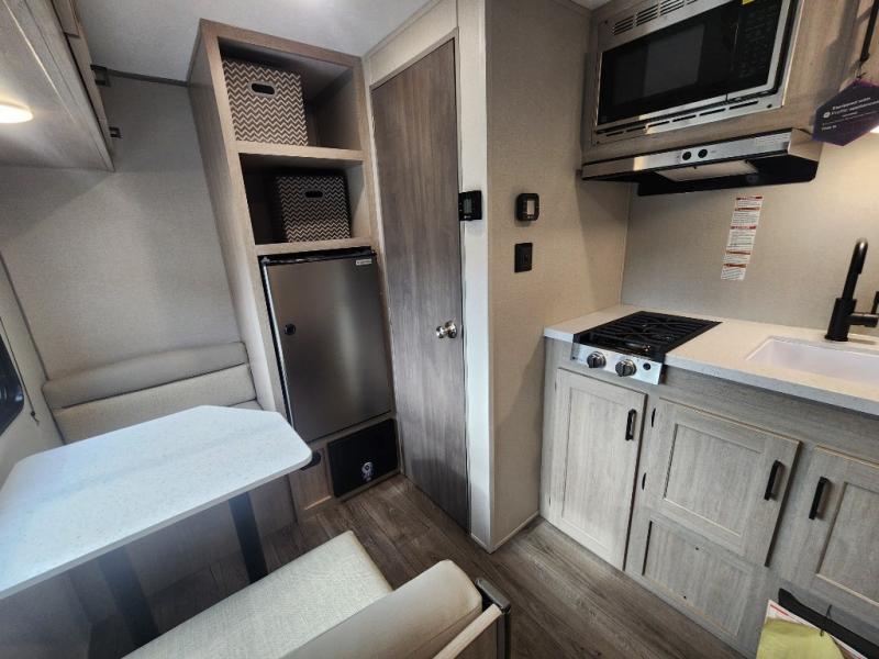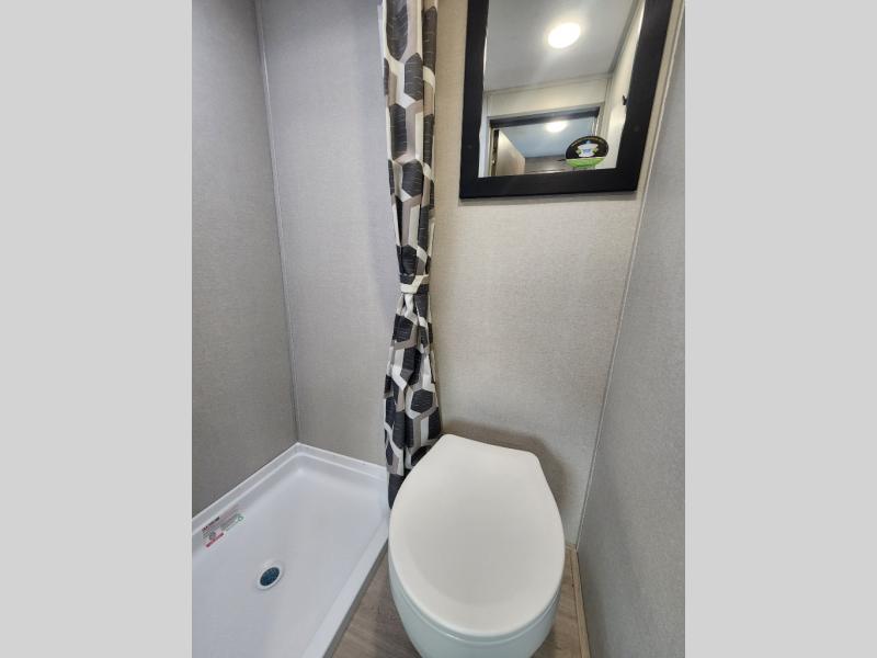 Lightweight camping is easier than you think with this travel trailer in tow! The front 54" x 74" queen bed will provide a great night's rest each night, while your overnight guest takes the booth dinette. There is a handy shelf above the front bed for your belongings plus additional bedroom storage. A private bath includes a 24" x 32" shower and a toilet with a mirror behind it so you can freshen up each day. You'll also find a two burner cooktop and microwave oven to make meals each day plus a 3.3 cu. ft. 12V refrigerator for food storage!