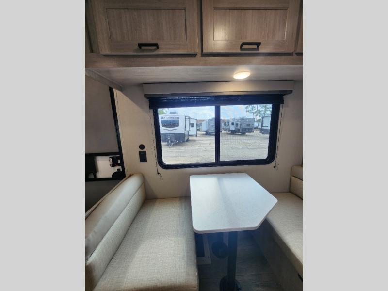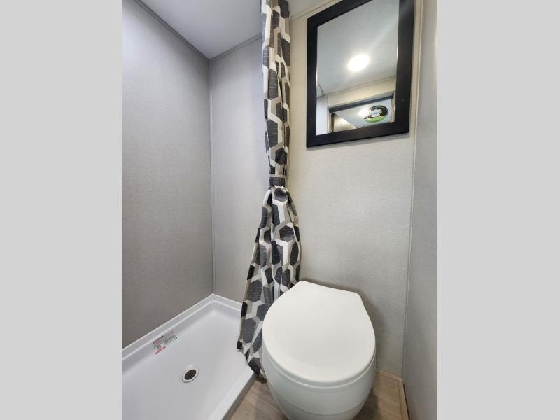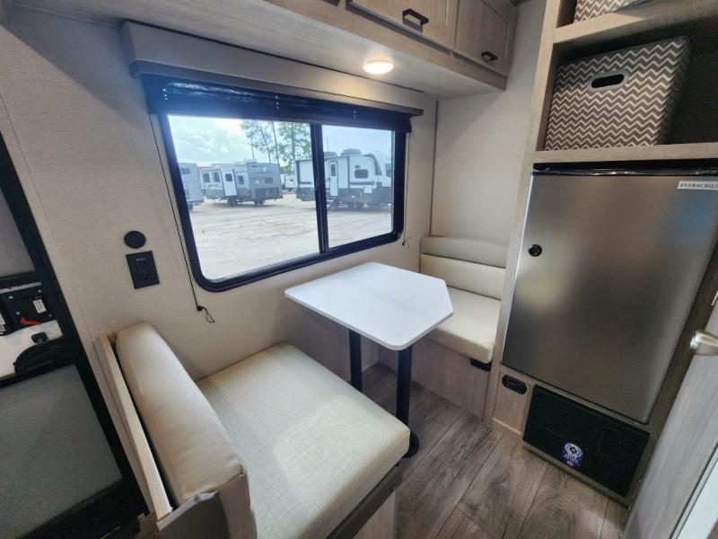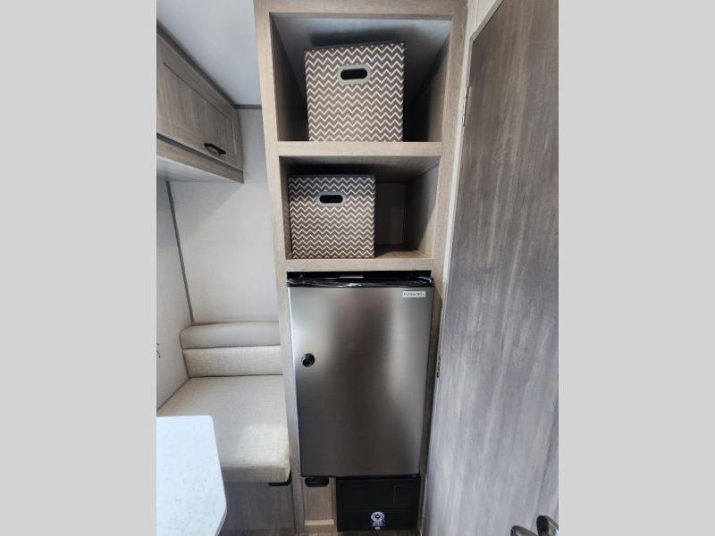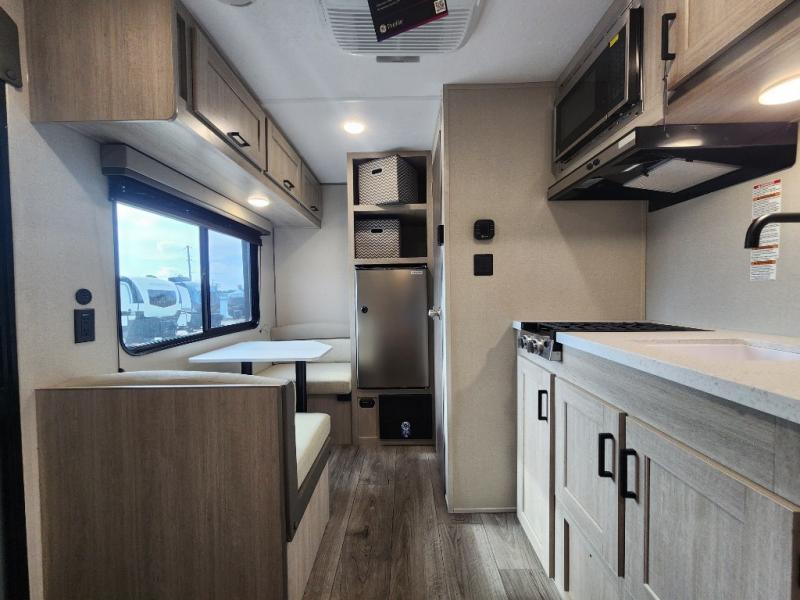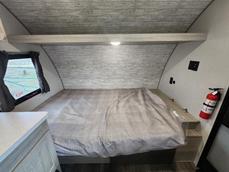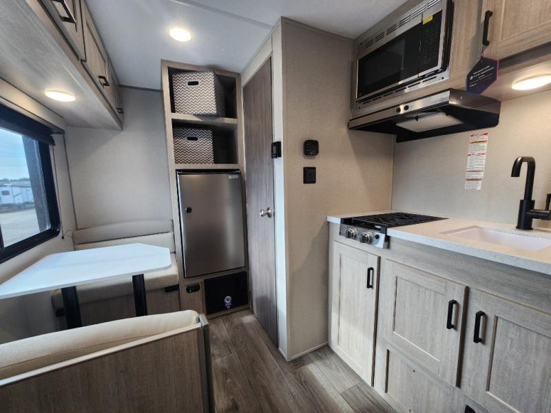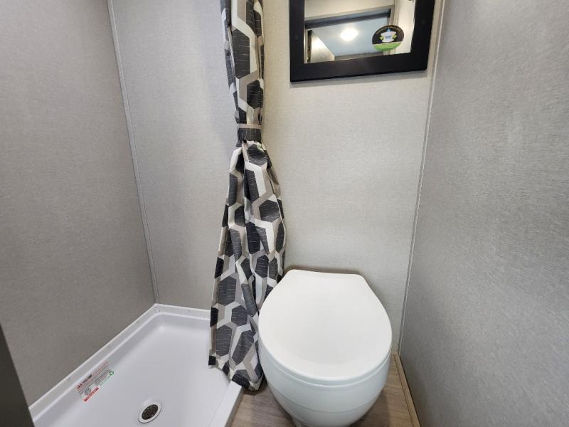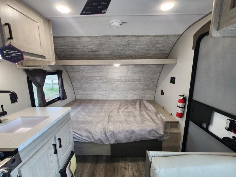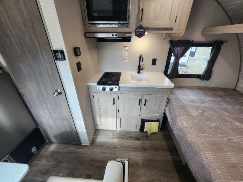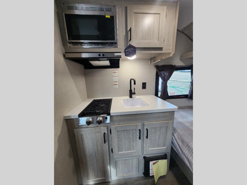 Lightweight camping is easier than you think with this travel trailer in tow! The front 54" x 74" queen bed will provide a great night's rest each night, while your overnight guest takes the booth dinette. There is a handy shelf above the front bed for your belongings plus additional bedroom storage. A private bath includes a 24" x 32" shower and a toilet with a mirror behind it so you can freshen up each day. You'll also find a two burner cooktop and microwave oven to make meals each day plus a 3.3 cu. ft. 12V refrigerator for food storage!