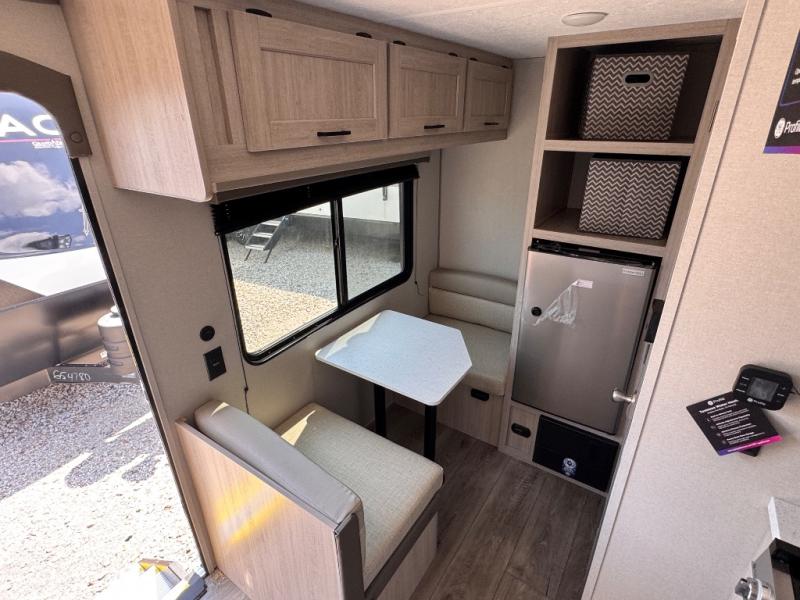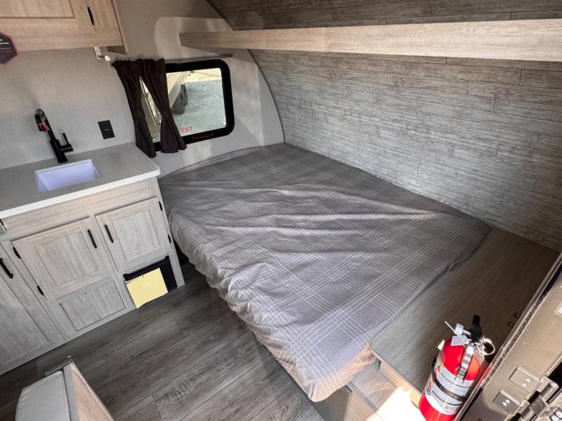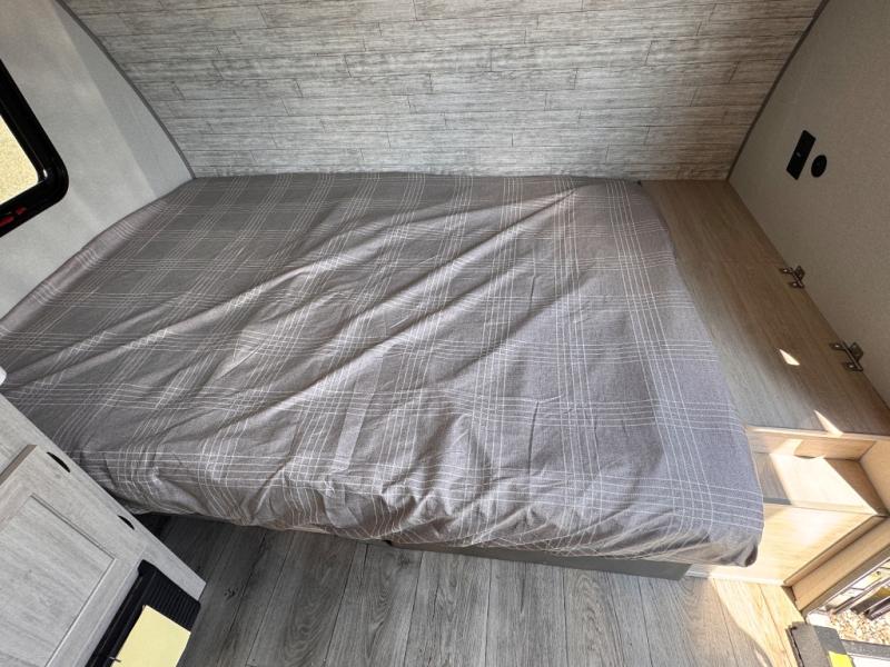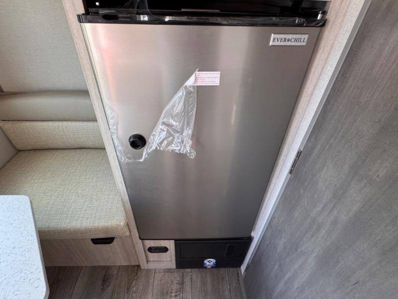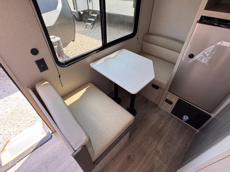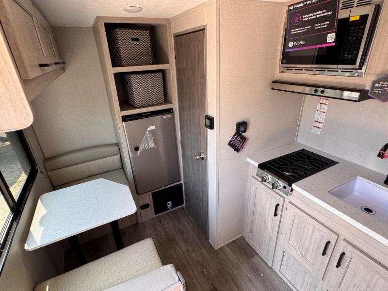 Lightweight camping is easier than you think with this travel trailer in tow! The front 54" x 74" queen bed will provide a great night's rest each night, while your overnight guest takes the booth dinette. There is a handy shelf above the front bed for your belongings plus additional bedroom storage. A private bath includes a 24" x 32" shower and a toilet with a mirror behind it so you can freshen up each day. You'll also find a two burner cooktop and microwave oven to make meals each day plus a 3.3 cu. ft. 12V refrigerator for food storage!