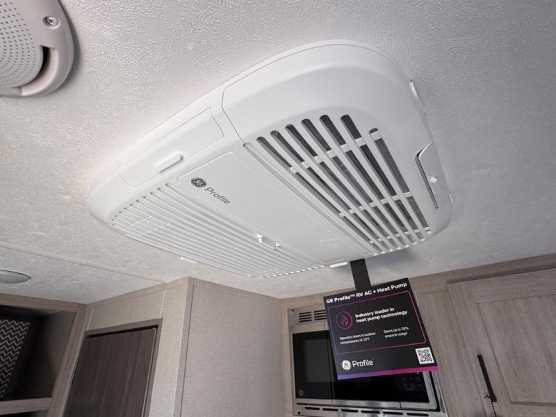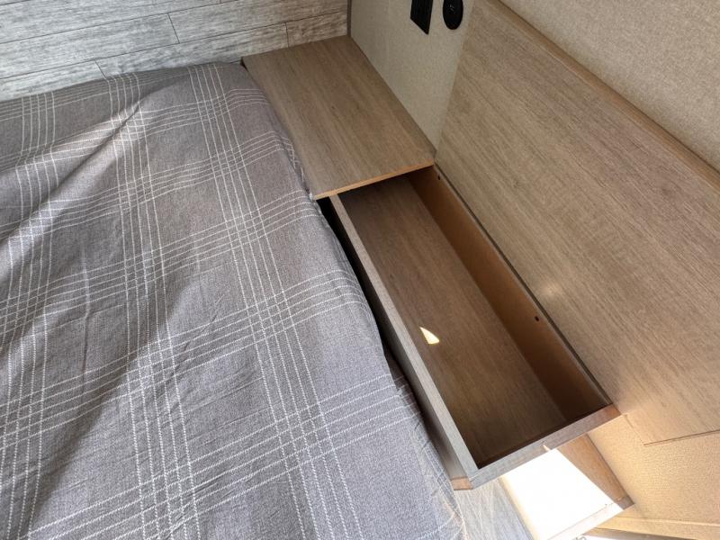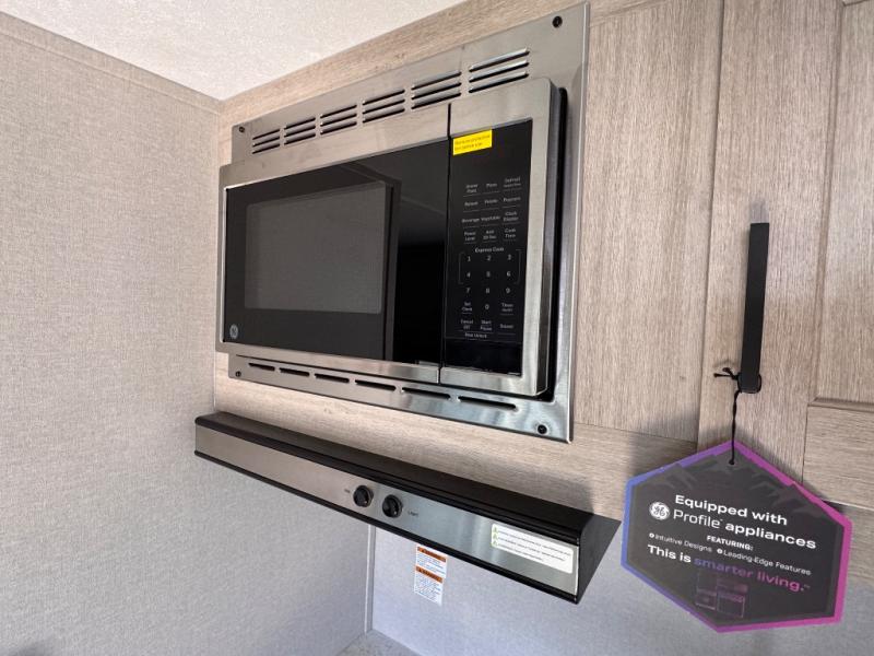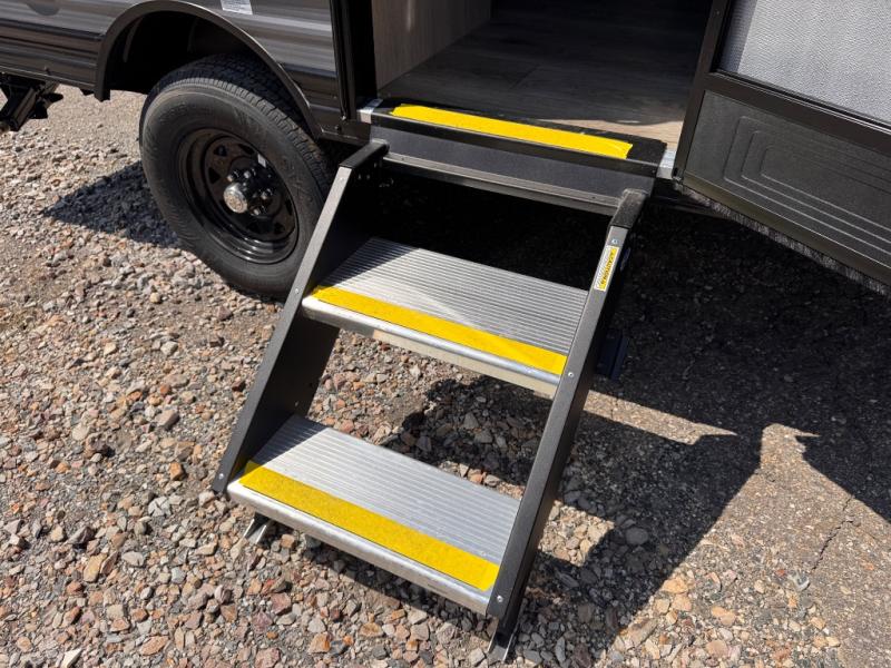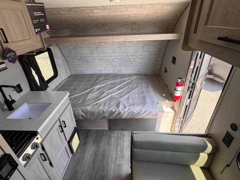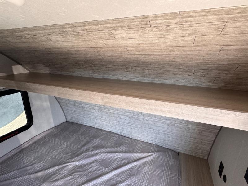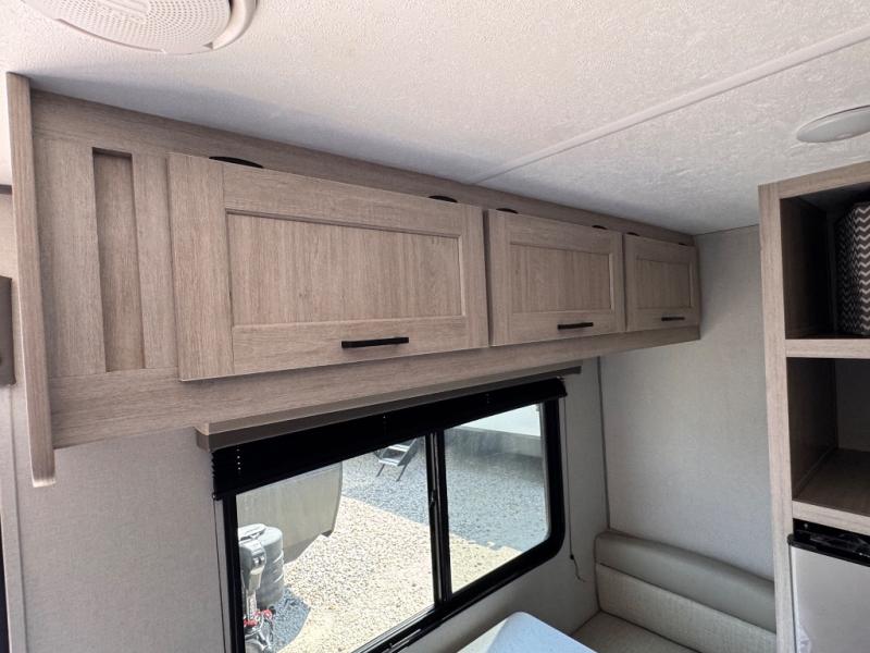 Lightweight camping is easier than you think with this travel trailer in tow! The front 54" x 74" queen bed will provide a great night's rest each night, while your overnight guest takes the booth dinette. There is a handy shelf above the front bed for your belongings plus additional bedroom storage. A private bath includes a 24" x 32" shower and a toilet with a mirror behind it so you can freshen up each day. You'll also find a two burner cooktop and microwave oven to make meals each day plus a 3.3 cu. ft. 12V refrigerator for food storage!