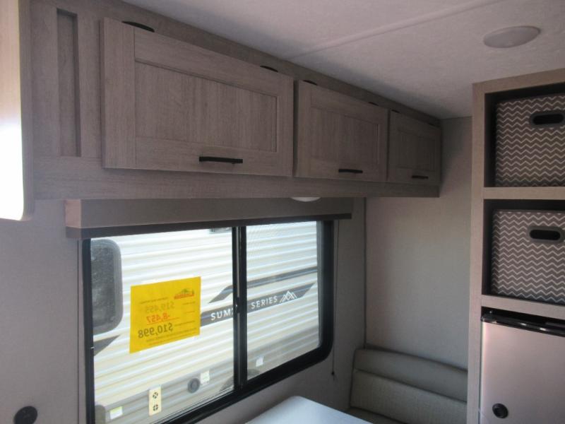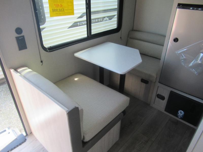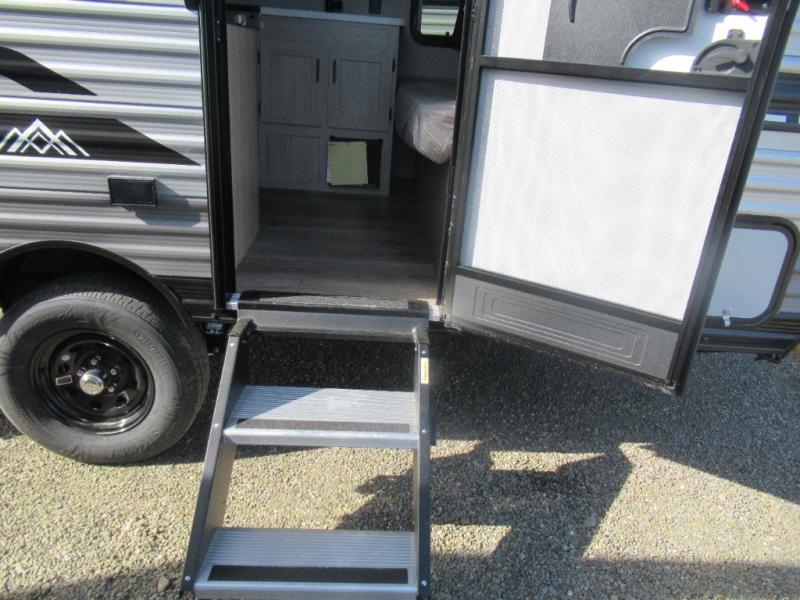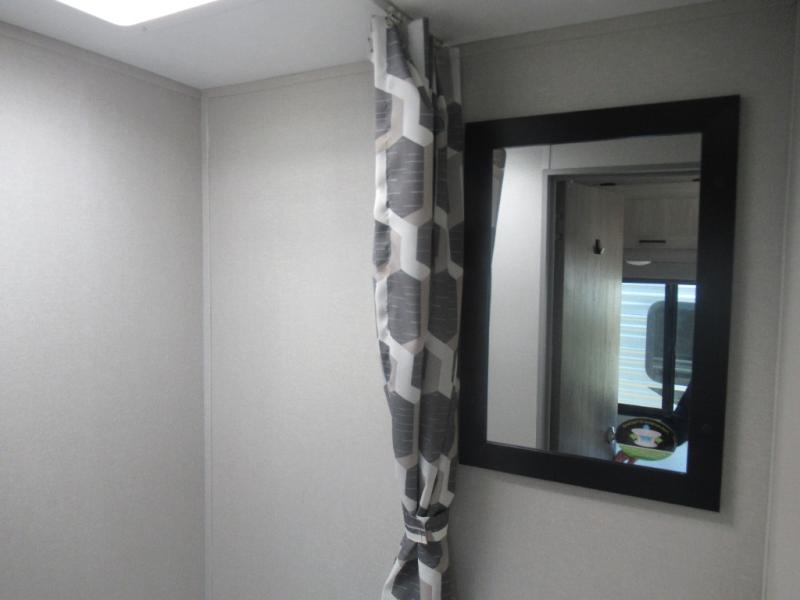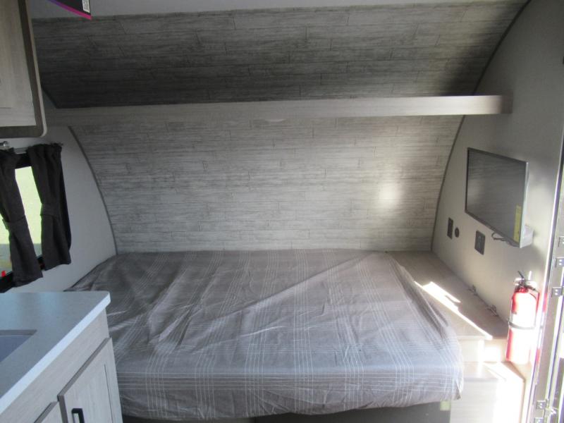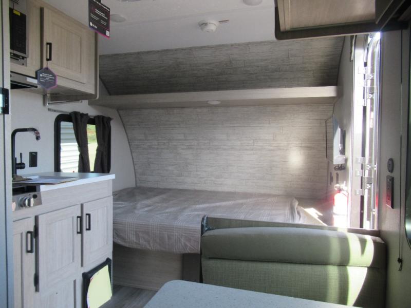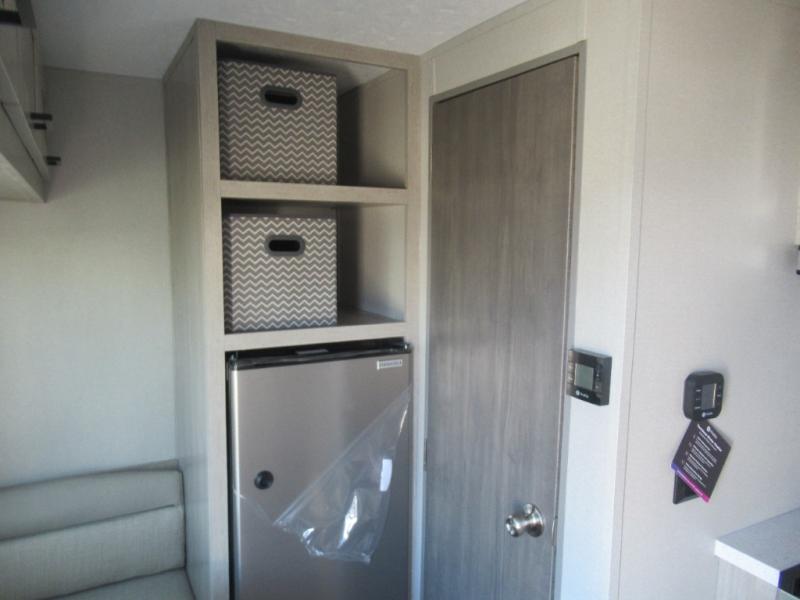Lightweight camping is easier than you think with this travel trailer in tow! The front 54" x 74" queen bed will provide a great night's rest each night, while your overnight guest takes the booth dinette. There is a handy shelf above the front bed for your belongings plus additional bedroom storage. A private bath includes a 24" x 32" shower and a toilet with a mirror behind it so you can freshen up each day. You'll also find a two burner cooktop and microwave oven to make meals each day plus a 3.3 cu. ft. 12V refrigerator for food storage!