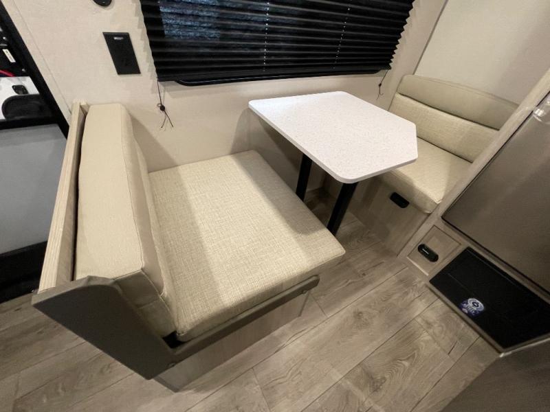 Lightweight camping is easier than you think with this travel trailer in tow! The front 54" x 74" queen bed will provide a great night's rest each night, while your overnight guest takes the booth dinette. There is a handy shelf above the front bed for your belongings plus additional bedroom storage. A private bath includes a 24" x 32" shower and a toilet with a mirror behind it so you can freshen up each day. You'll also find a two burner cooktop and microwave oven to make meals each day plus a 3.3 cu. ft. 12V refrigerator for food storage!