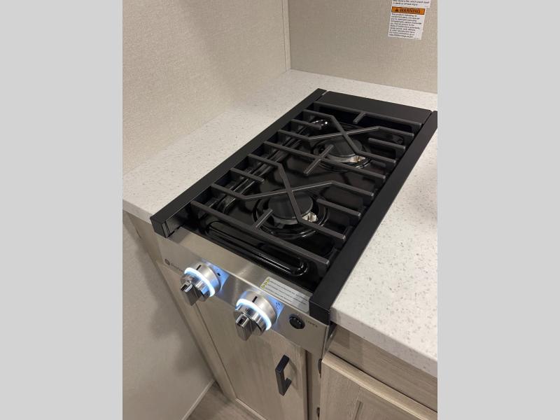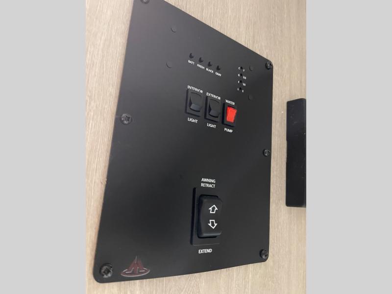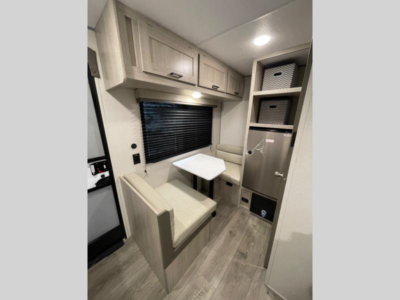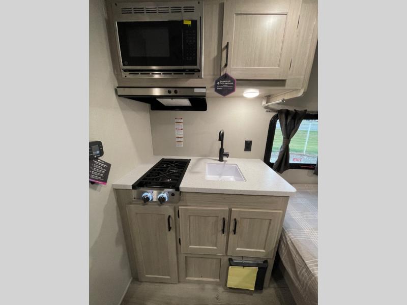 Lightweight camping is easier than you think with this travel trailer in tow! The front 54" x 74" queen bed will provide a great night's rest each night, while your overnight guest takes the booth dinette. There is a handy shelf above the front bed for your belongings plus additional bedroom storage. A private bath includes a 24" x 32" shower and a toilet with a mirror behind it so you can freshen up each day. You'll also find a two burner cooktop and microwave oven to make meals each day plus a 3.3 cu. ft. 12V refrigerator for food storage!
