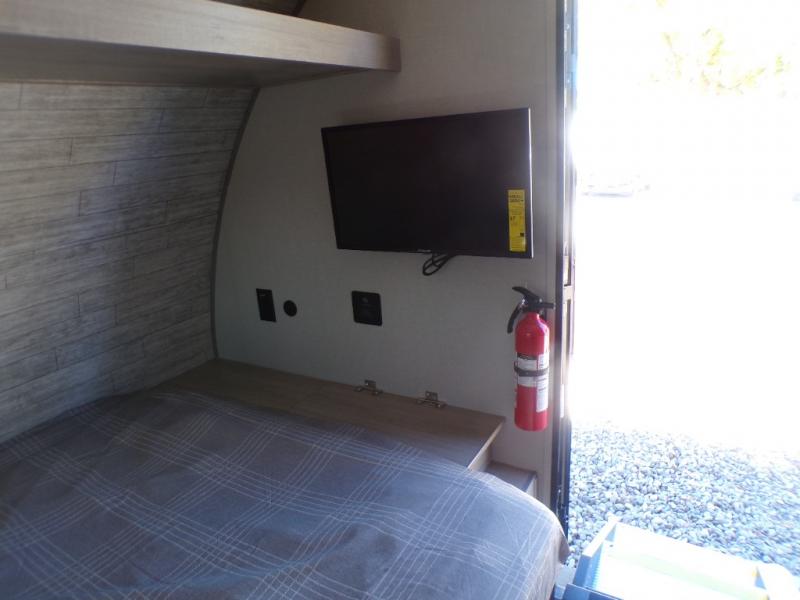 Lightweight camping is easier than you think with this travel trailer in tow! The front 54" x 74" queen bed will provide a great night's rest each night, while your overnight guest takes the booth dinette. There is a handy shelf above the front bed for your belongings plus additional bedroom storage. A private bath includes a 24" x 32" shower and a toilet with a mirror behind it so you can freshen up each day. You'll also find a two burner cooktop and microwave oven to make meals each day plus a 3.3 cu. ft. 12V refrigerator for food storage!