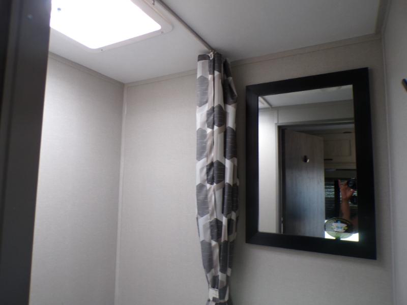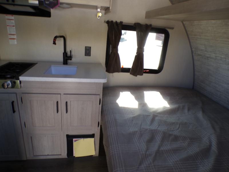 Lightweight camping is easier than you think with this travel trailer in tow! The front 54" x 74" queen bed will provide a great night's rest each night, while your overnight guest takes the booth dinette. There is a handy shelf above the front bed for your belongings plus additional bedroom storage. A private bath includes a 24" x 32" shower and a toilet with a mirror behind it so you can freshen up each day. You'll also find a two burner cooktop and microwave oven to make meals each day plus a 3.3 cu. ft. 12V refrigerator for food storage!